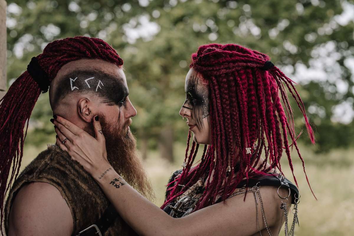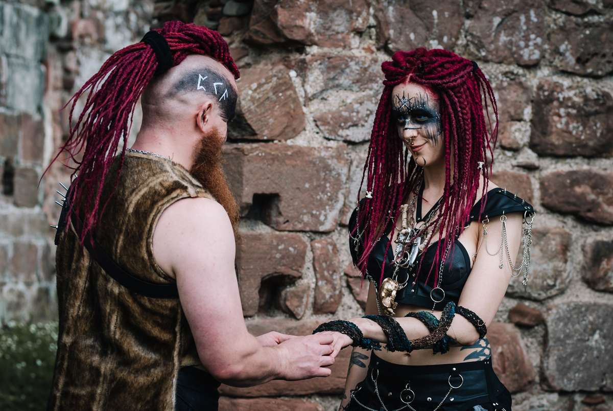 “For our ceremony we wanted something from the heart and soul, and we were drawn to waterfalls for the handfasting location”, Anastasia explained. “Our re-shoot was an amalgamation of themes that we both loved, merging the possibility of a post-apocalyptic dystopian future with Norse / Celtic heritage. The idea that if society crumbles, once the electricity fades, the last battery runs flat and the gods of technology abandoned us. Mankind will turn again to the old gods for guidance and protection.”