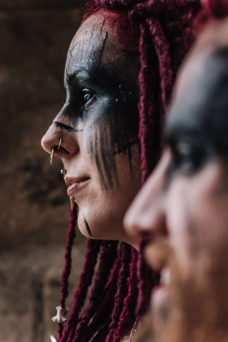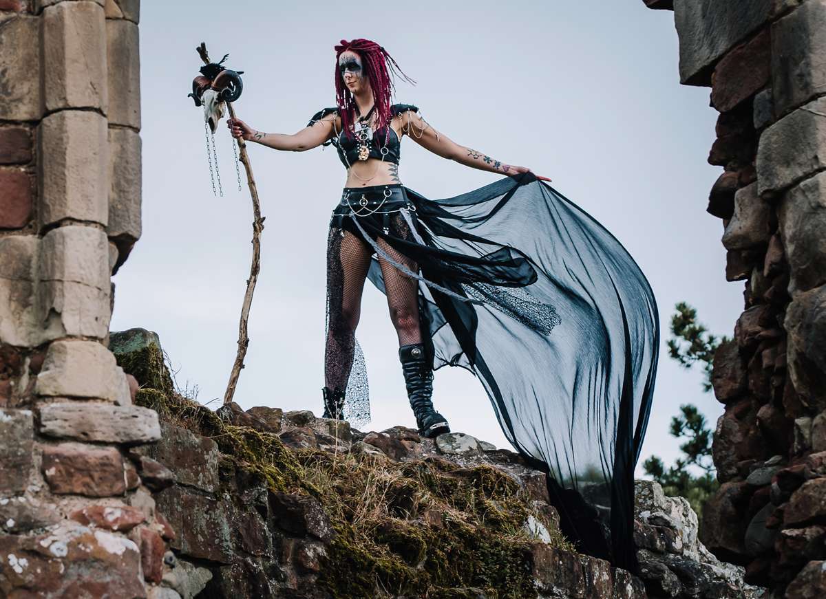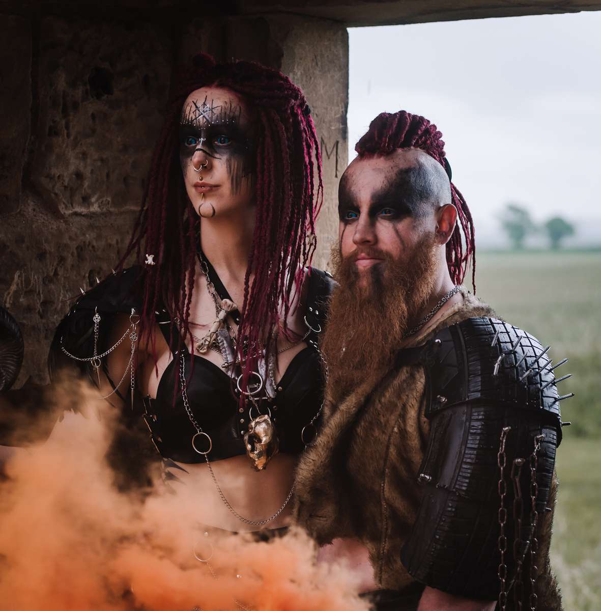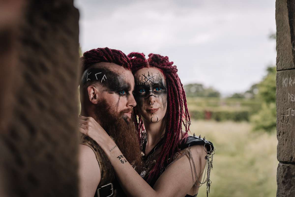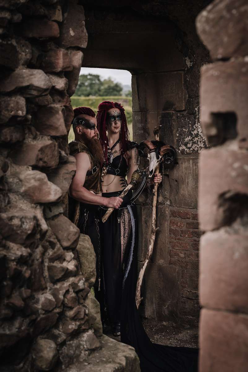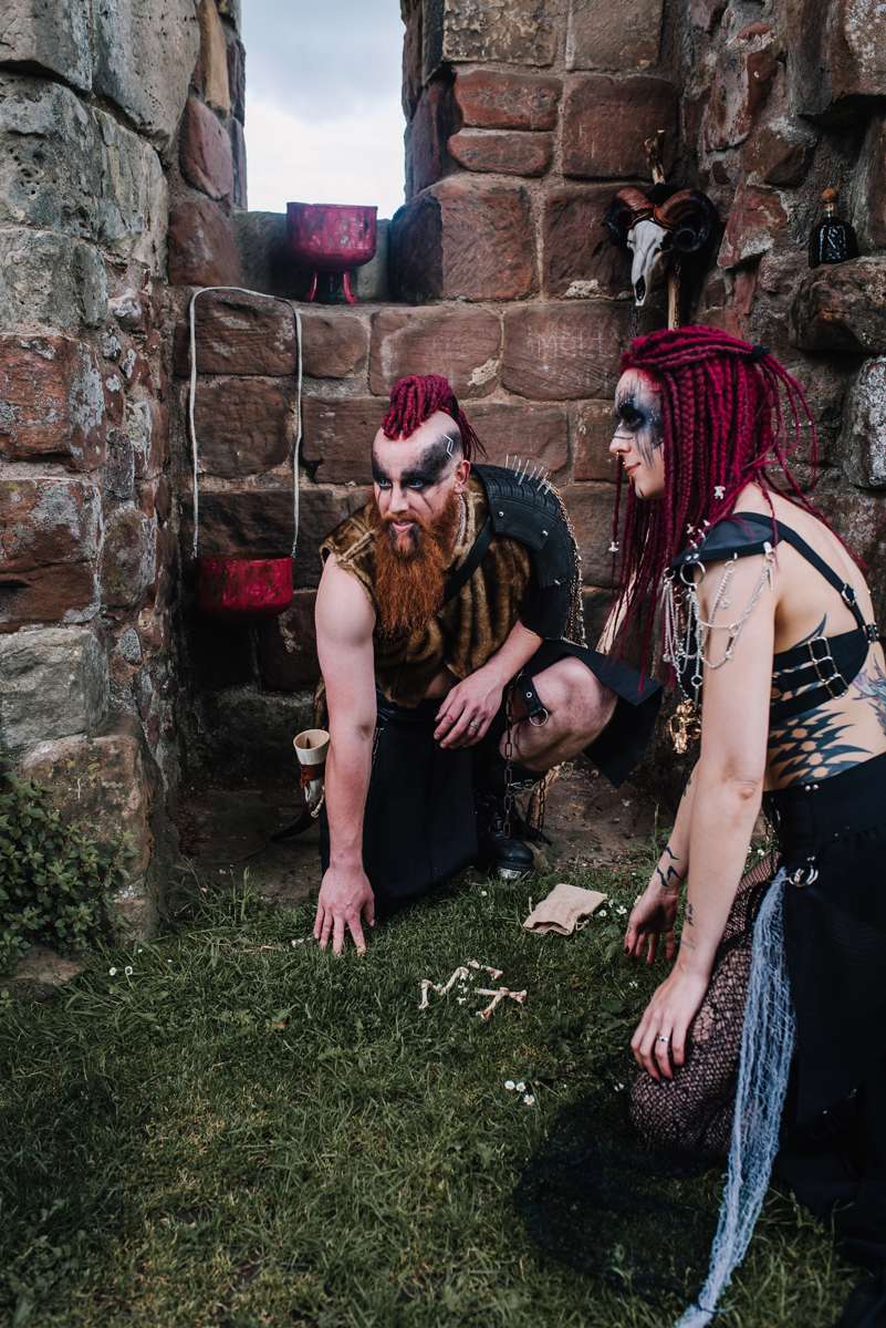 “Fran created beautiful mock ups of the makeup ideas and transformed us both into Wasteland Norse warriors. It rained every day on the lead up to the re-shoot and the day was no different. We were blessed with dry intervals and an atmospheric sky, allowing us to capture images (and darting for cover in-between cloudbursts). As we recreated the handfasting, walking towards the archway, it felt every bit as real as our sunset ceremony, tying the knot and exchanging rings. We explored the idea of life in a dystopian wasteland future, once no longer technology led, old ways and superstitions would rule people’s lives. Resources would be fought over, and needed protecting. Poor decisions could mean starving. Any show of weakness would be exploited. We captured consulting the bones and preparing for battle. Ready to defend our united tribes.”