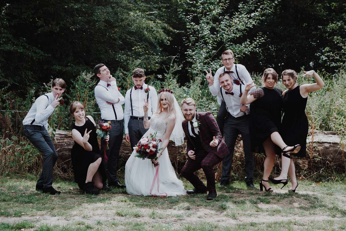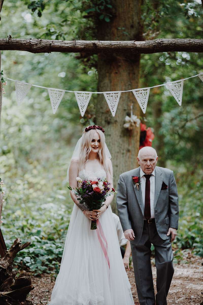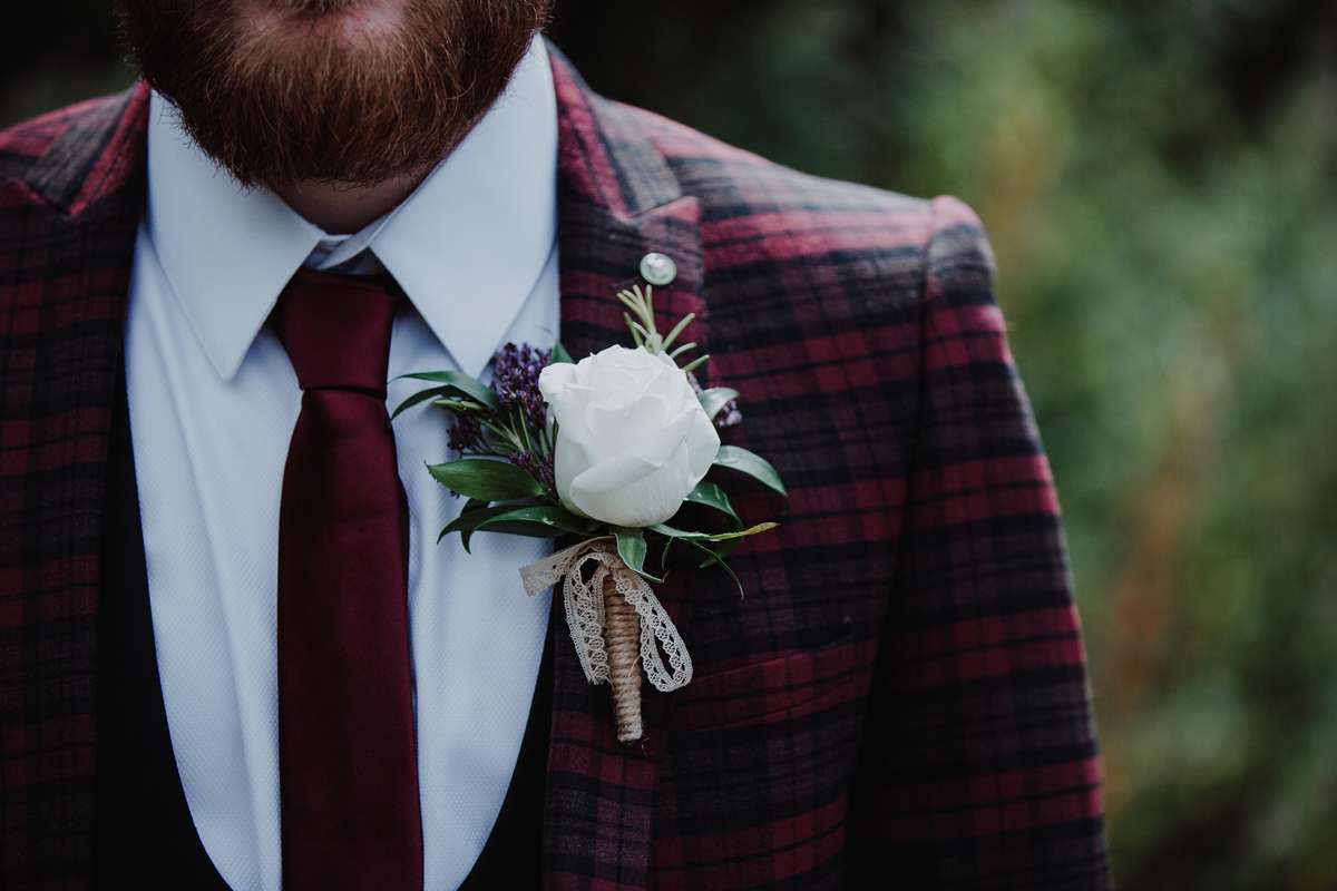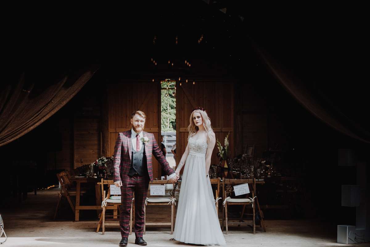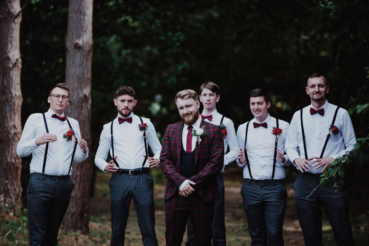 Ruby and Jamie’s woodland wedding was inspired by their venue. They knew they wanted to get married in the woods, and when they found Captain Wood Barn, they knew it was perfect. They were married in August and chose a burgundy as their main colour, reflected in the groom’s suit, the bride’s lipstick, shoes and crown, and the flowers.