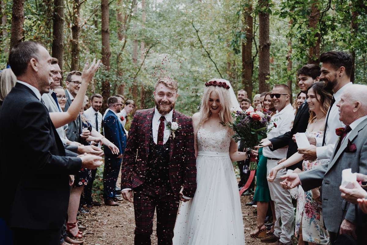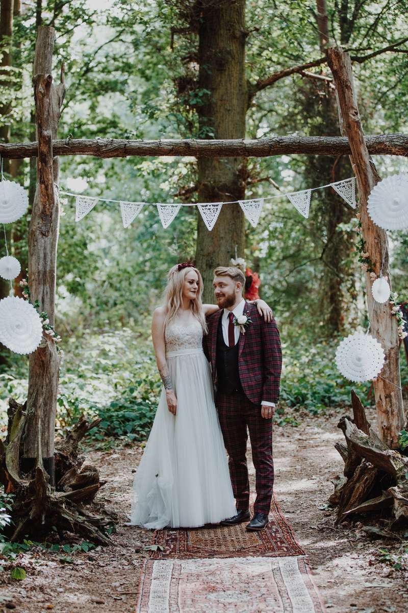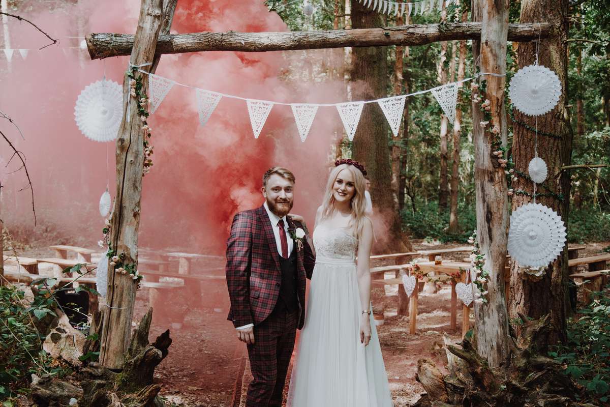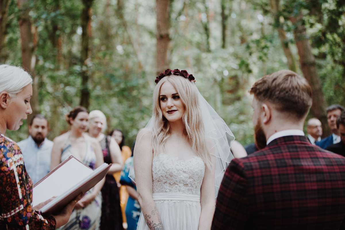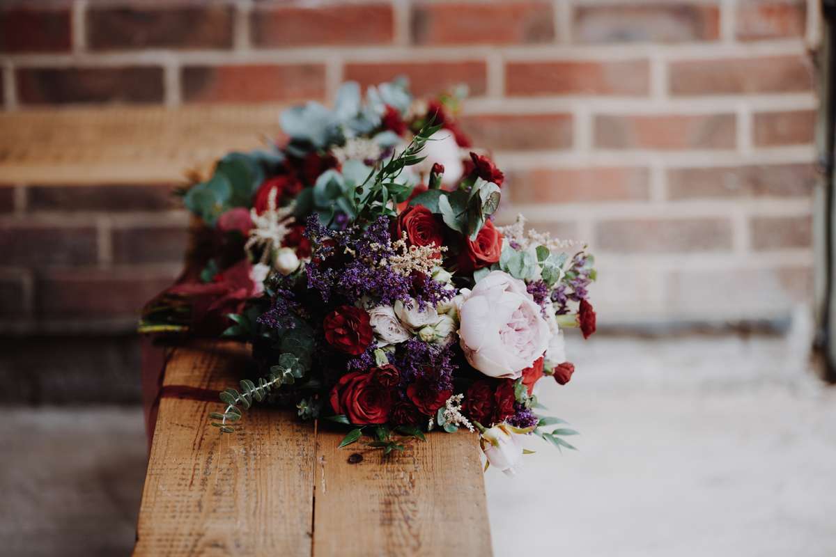 Ruby and Jamie’s woodland wedding was inspired by their venue. They knew they wanted to get married in the woods, and when they found Captain Wood Barn, they knew it was perfect. They were married in August and chose a burgundy as their main colour, reflected in the groom’s suit, the bride’s lipstick, shoes and crown, and the flowers.