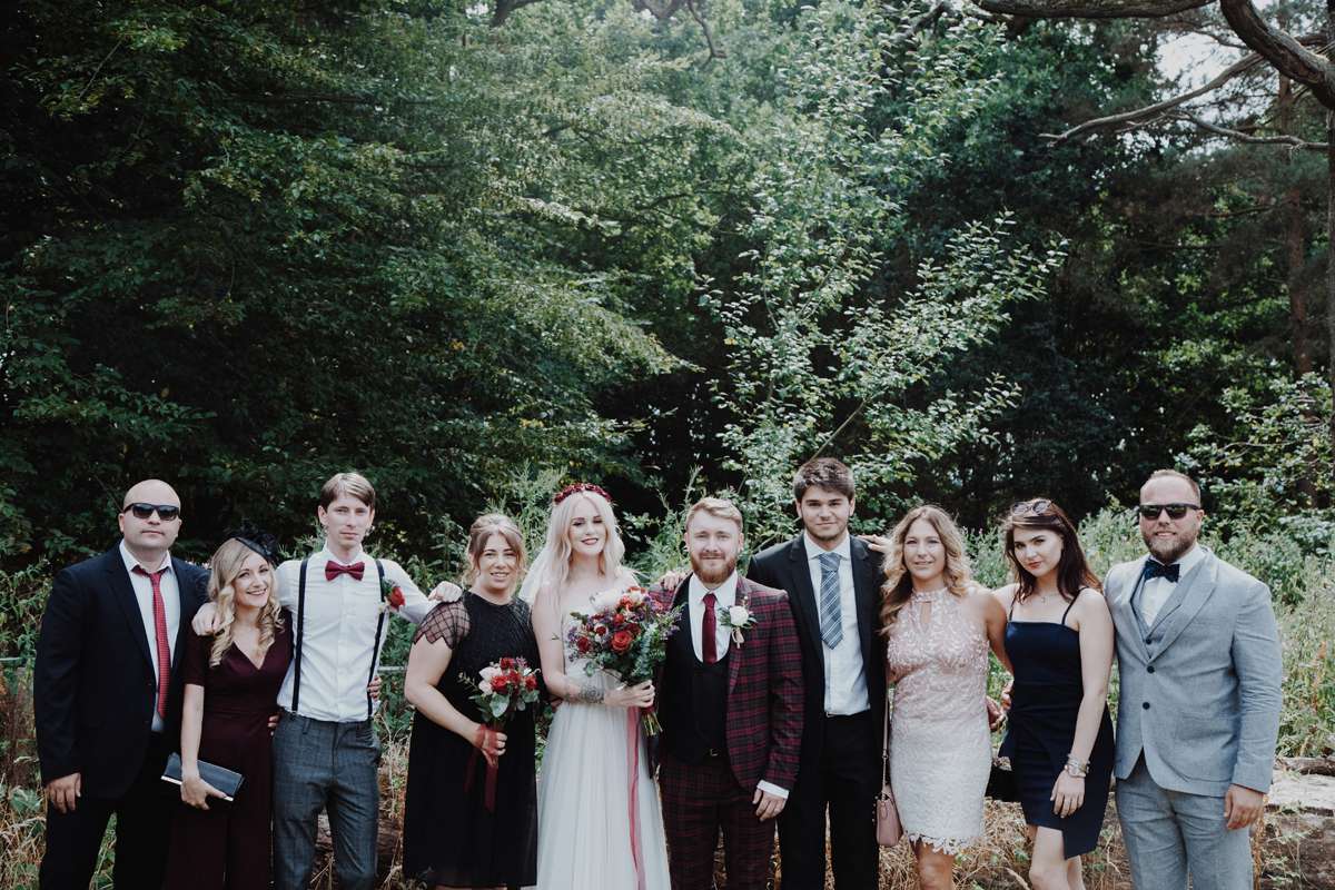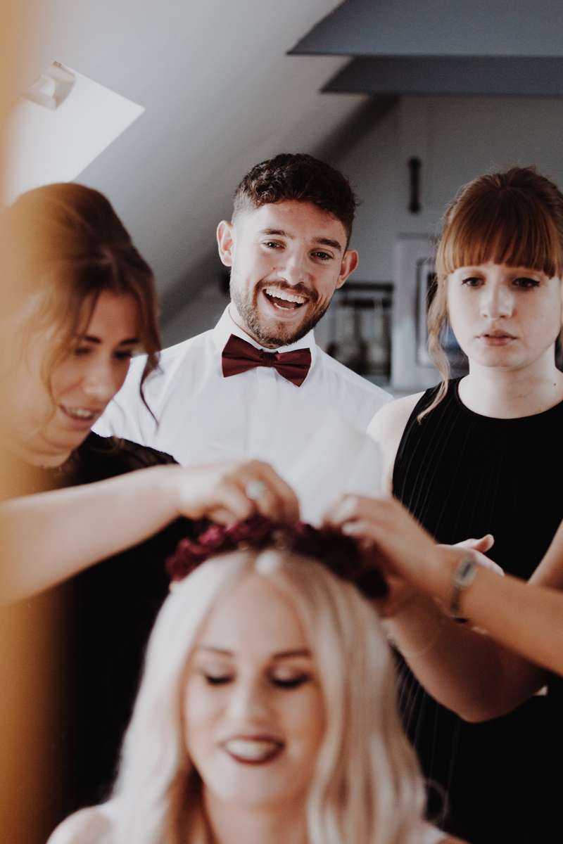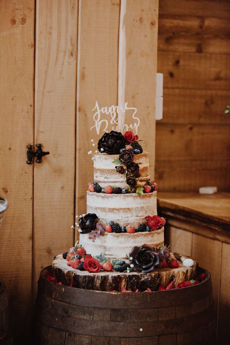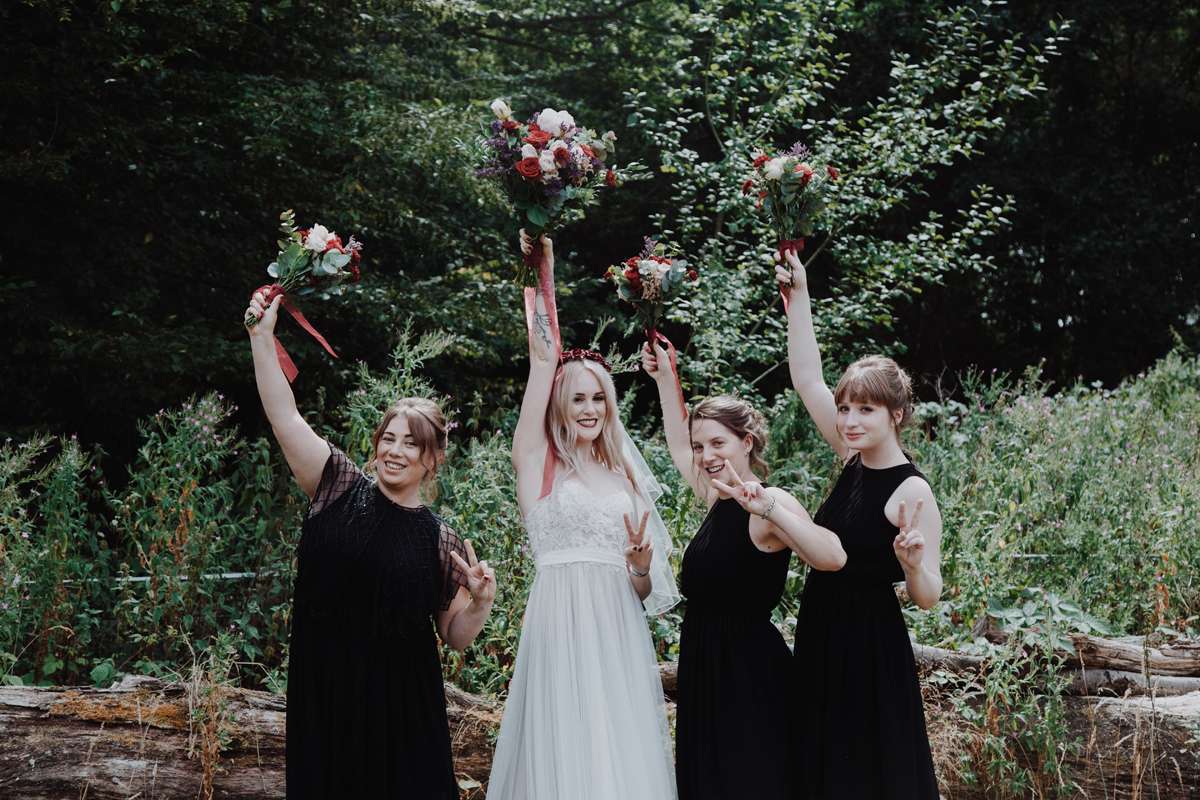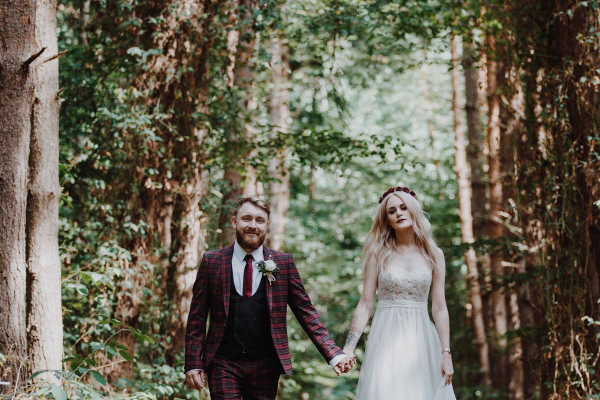 Ruby and Jamie’s woodland wedding was inspired by their venue. They knew they wanted to get married in the woods, and when they found Captain Wood Barn, they knew it was perfect. They were married in August and chose a burgundy as their main colour, reflected in the groom’s suit, the bride’s lipstick, shoes and crown, and the flowers.