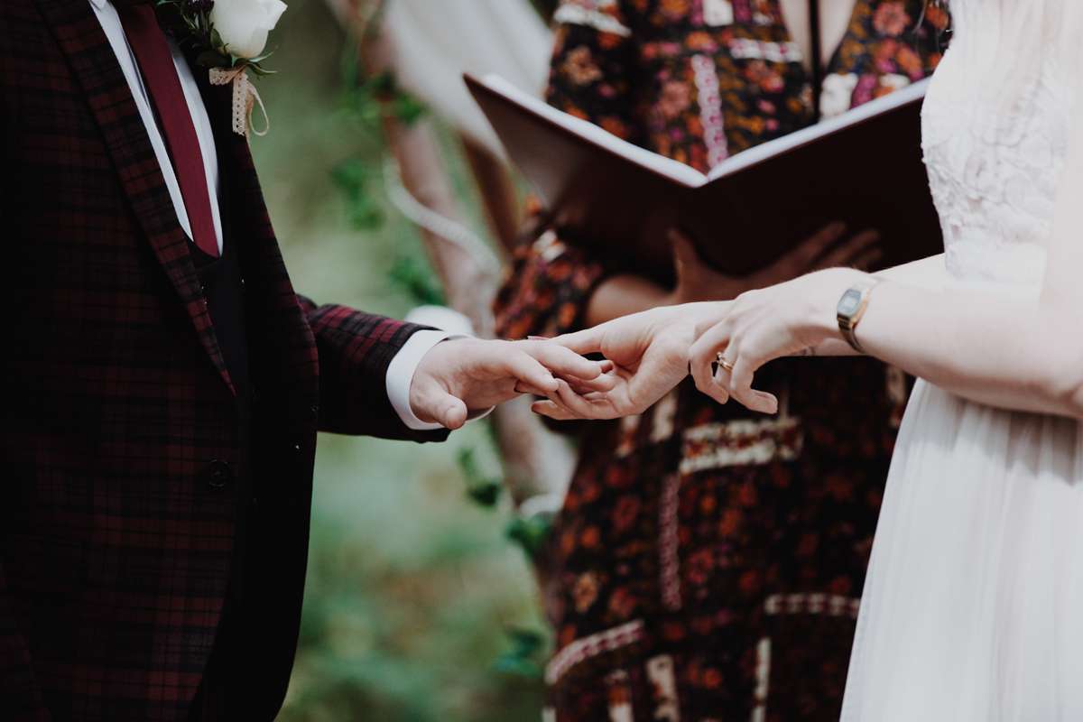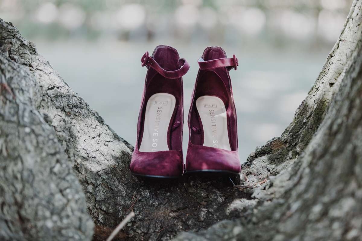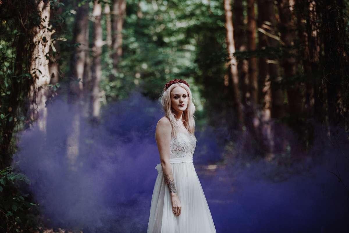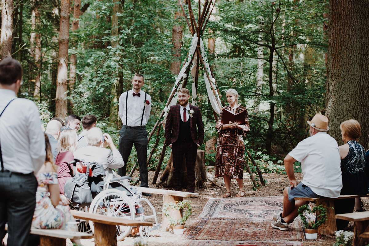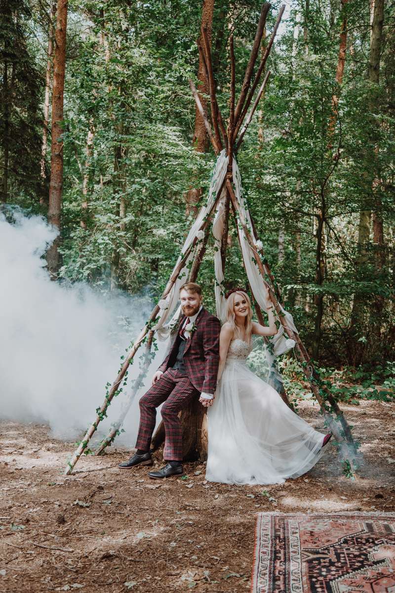 Ruby and Jamie’s woodland wedding was inspired by their venue. They knew they wanted to get married in the woods, and when they found Captain Wood Barn, they knew it was perfect. They were married in August and chose a burgundy as their main colour, reflected in the groom’s suit, the bride’s lipstick, shoes and crown, and the flowers.