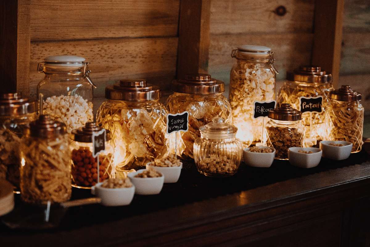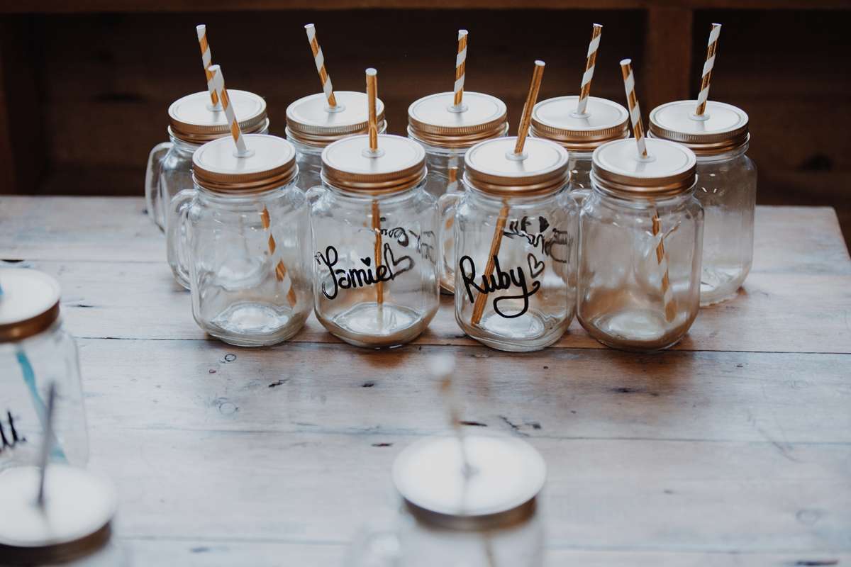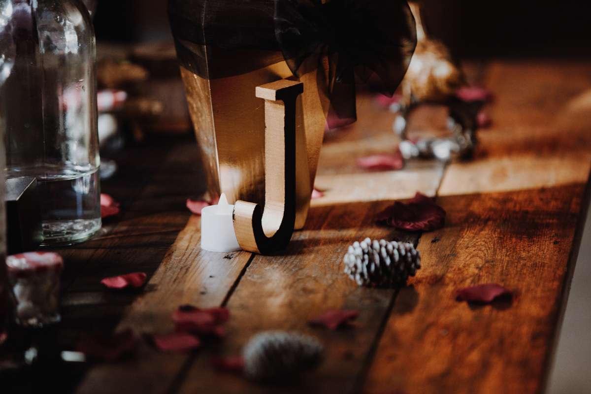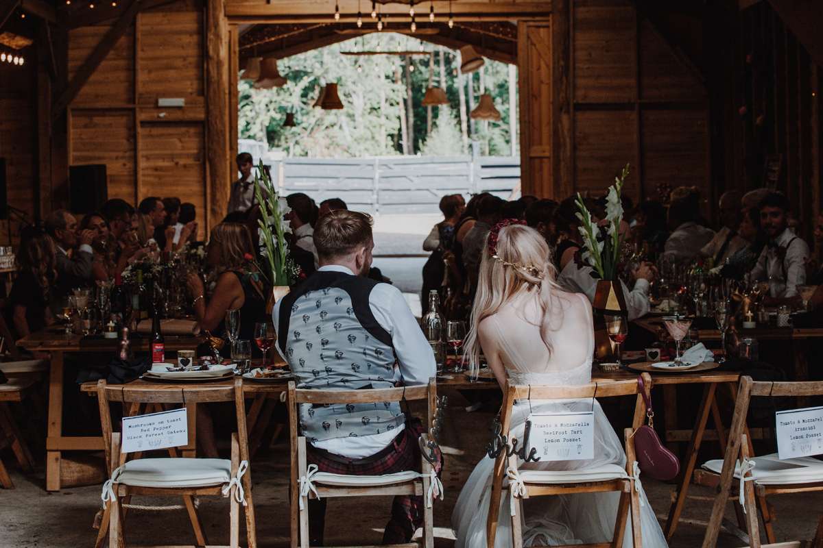 They also did LOADS of DIY. Décor wise, they kept things pretty rustic in theme, allowing the beauty of their surroundings to be the star. They made their own table plan, spray-painted a lot of stuff gold including toy animals for the tables, and Jamie’s dad made all the names on the table using pyrography and wood. The bride’s mum made candle holders, the groom’s sister made the cake and another family member did all the flowers! They also ordered lots of paper decorations as well as hired in extra props and furniture.