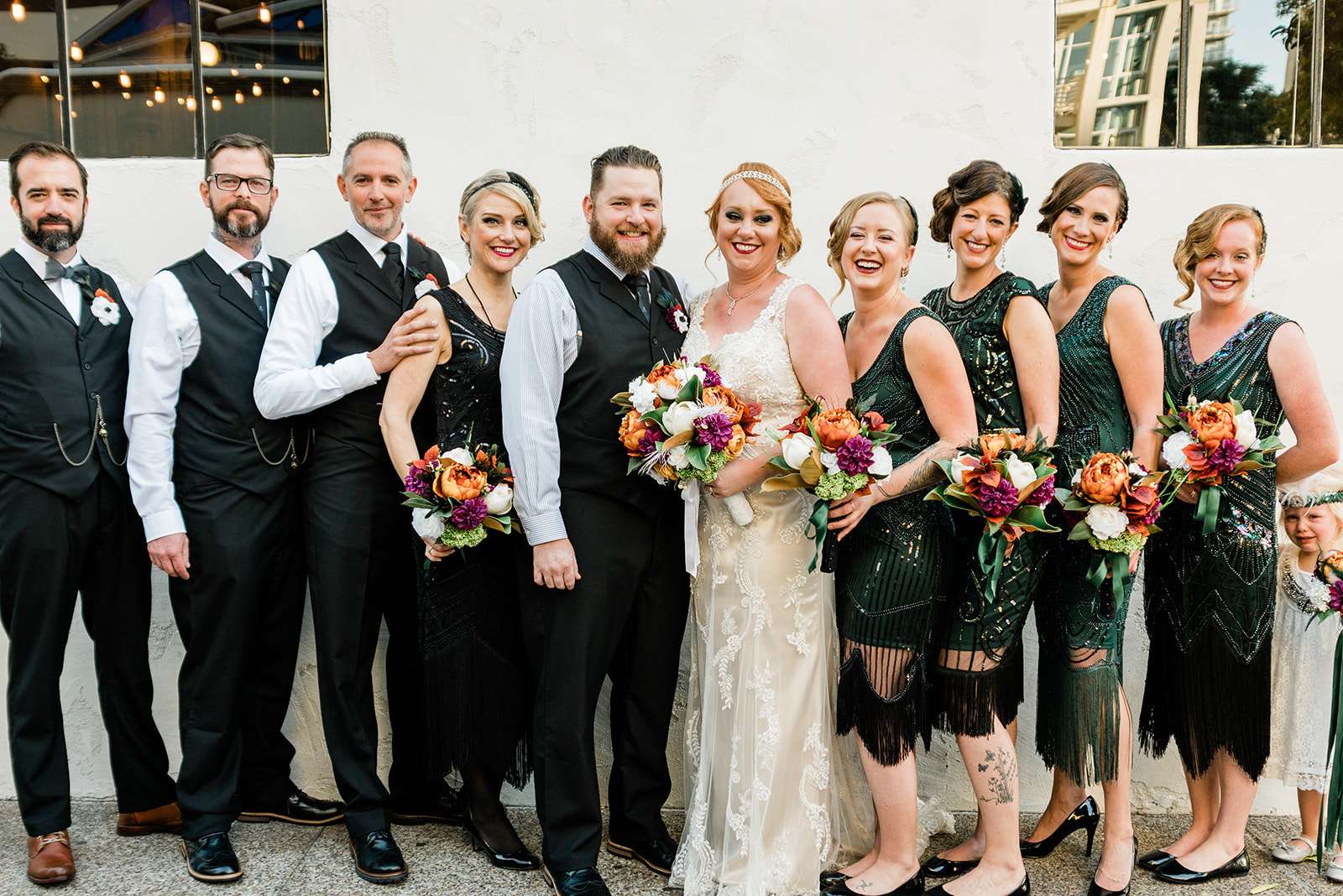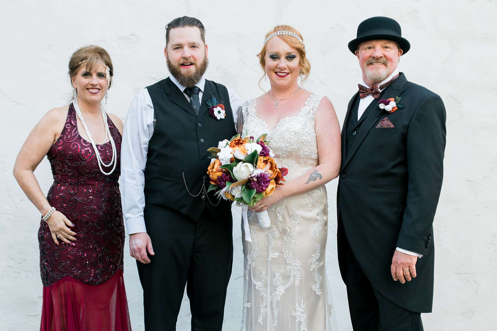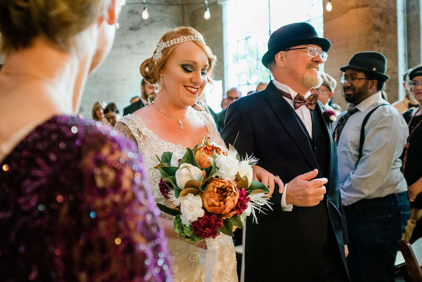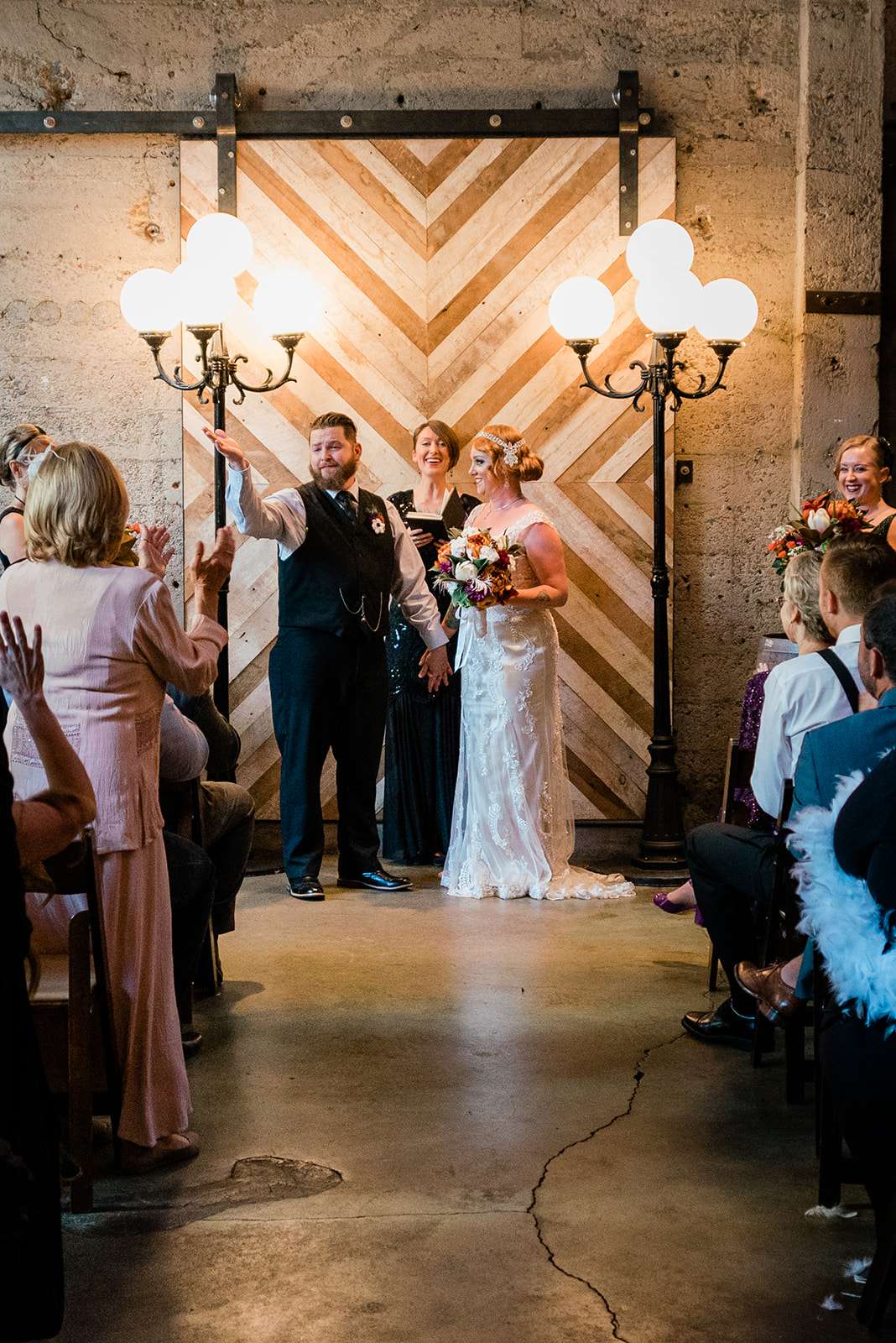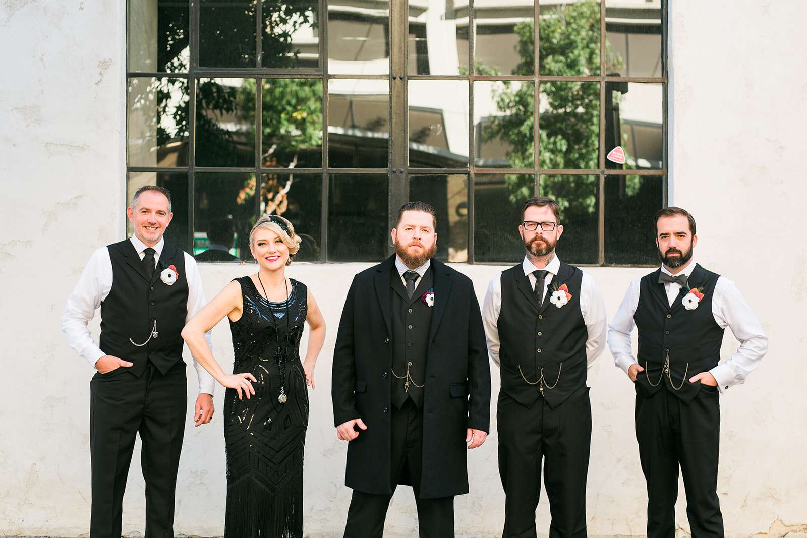 As Hilary and Ronnie both work in TV production, it makes perfect sense that their wedding was inspired by one of their favourite shows. “I know 1920s themed weddings are really popular, but we were keen to avoid the ‘Gatsby’ look,” explained Hilary. “I really studied the set design on Peaky Blinders to get a rustic 1920s vintage look with the over the top glitz. We also really wanted our guests to have fun with costumes since we were getting married so close to Halloween, which is our favourite holiday.”