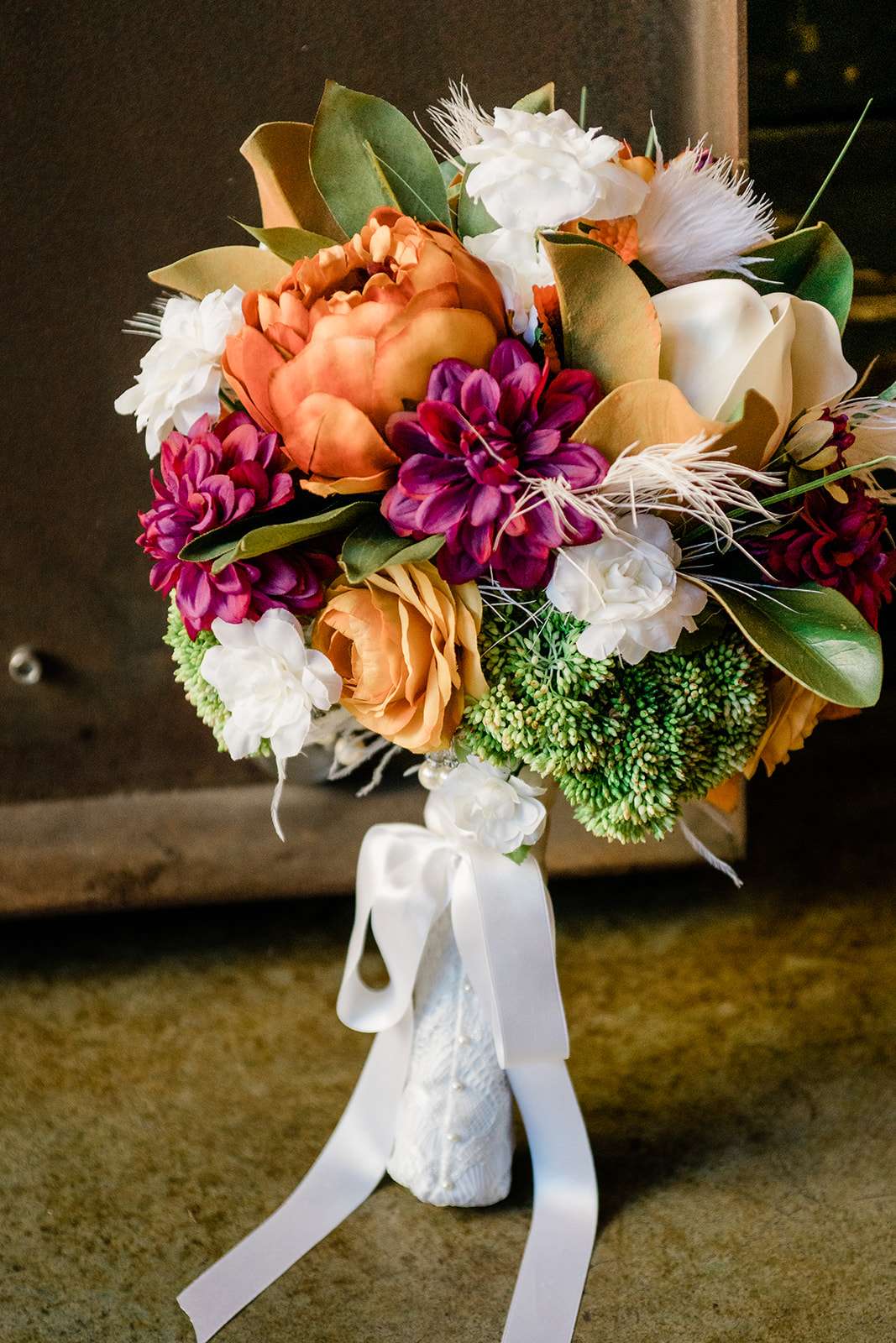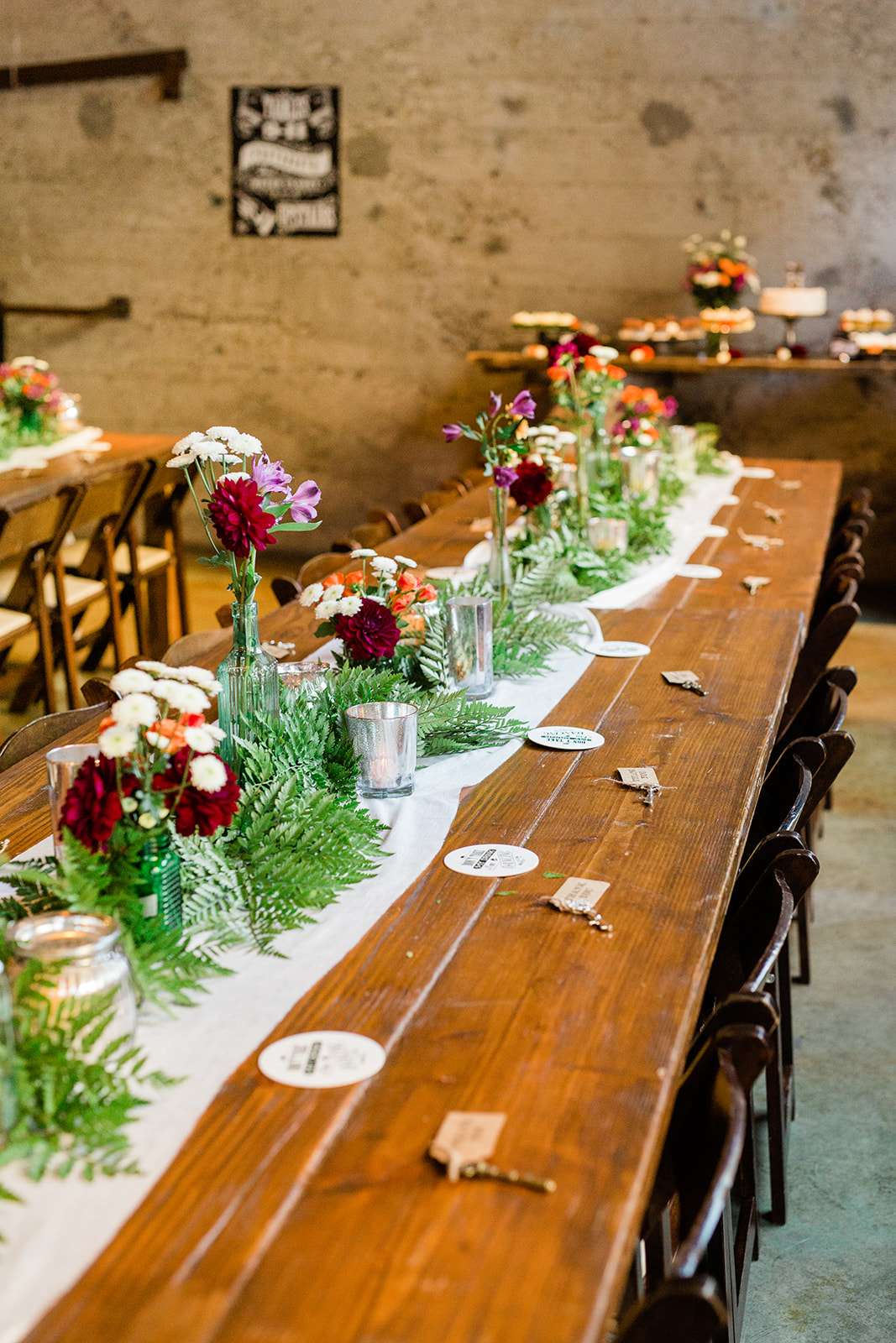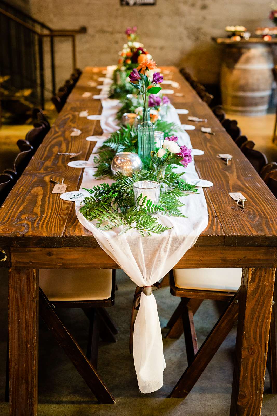 They splashed out on catering – it was super important to the couple that everyone ate well. They made bank with their artificial flowers though, much to Hilary’s mother’s horror! “My mum is a florist and was pretty opposed to my approach but she finally gave in. I made all the bridesmaid bouquets and flower girl’s wand with high end yet affordable silk flowers from International Silk in Downtown Los Angeles, and my mum made my bouquet and the toss bouquet. Since all my bridesmaids were travelling from out of town, I wanted them to be able to take the bouquet home with them as a keepsake. I still have mine and it looks just as spectacular as it did the day of. My mum and I picked up all the fresh flowers and table runner ferns at the Flower Market in San Diego, and it was all hands on deck the day-of to get them into vases. I really loved how they all turned out. And I let my mum do a ‘proper’ floral arrangement for the welcome table since she couldn’t resist.”