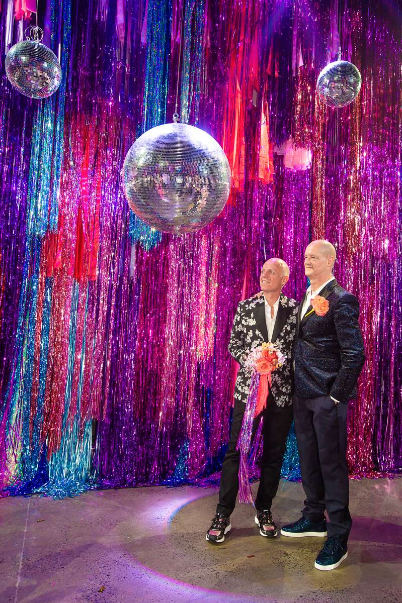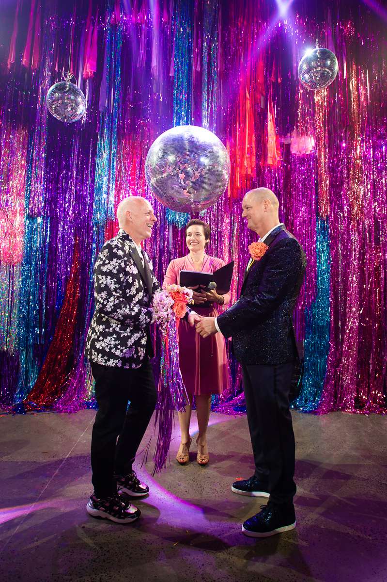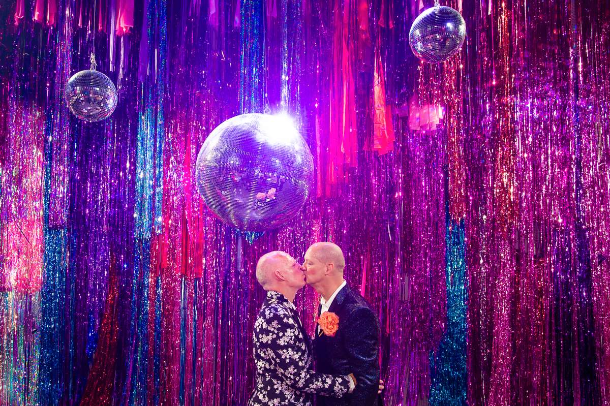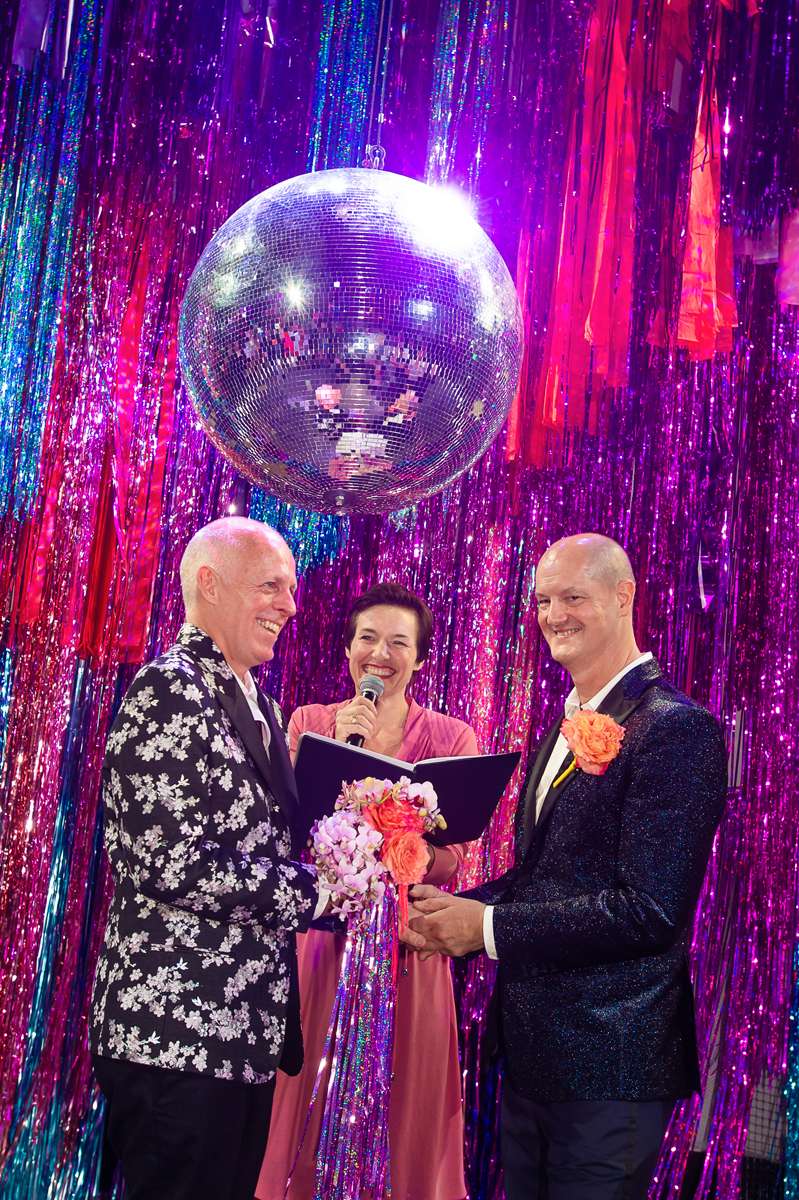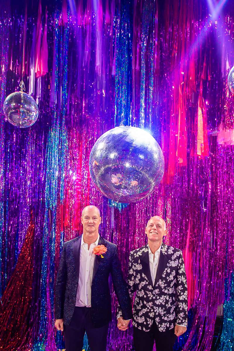 The couple first met on the dance floor 19 years ago so the theme of the party was literally perfect for them. They had disco balls, holographic screamers and amazing pink and purple lighting. They rounded off the night with drag and dance performances, DJs and a surprise lip-sync performance by one of the grooms.
