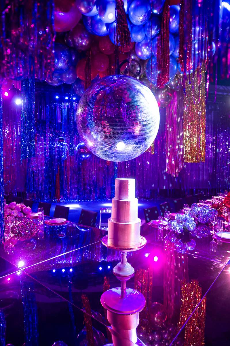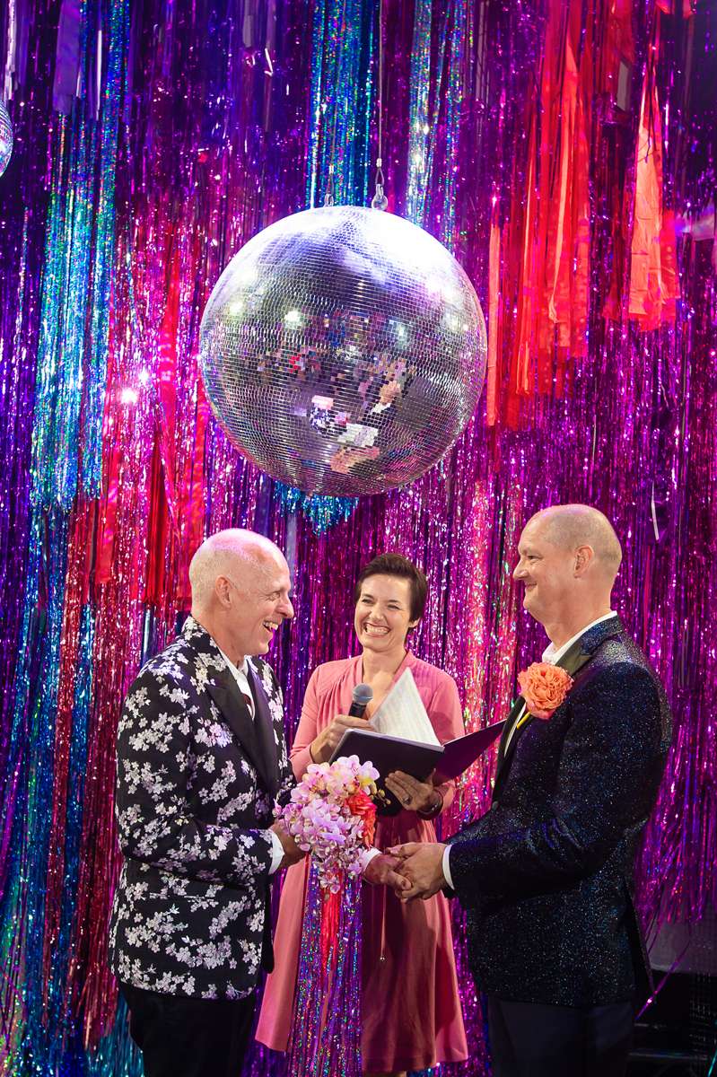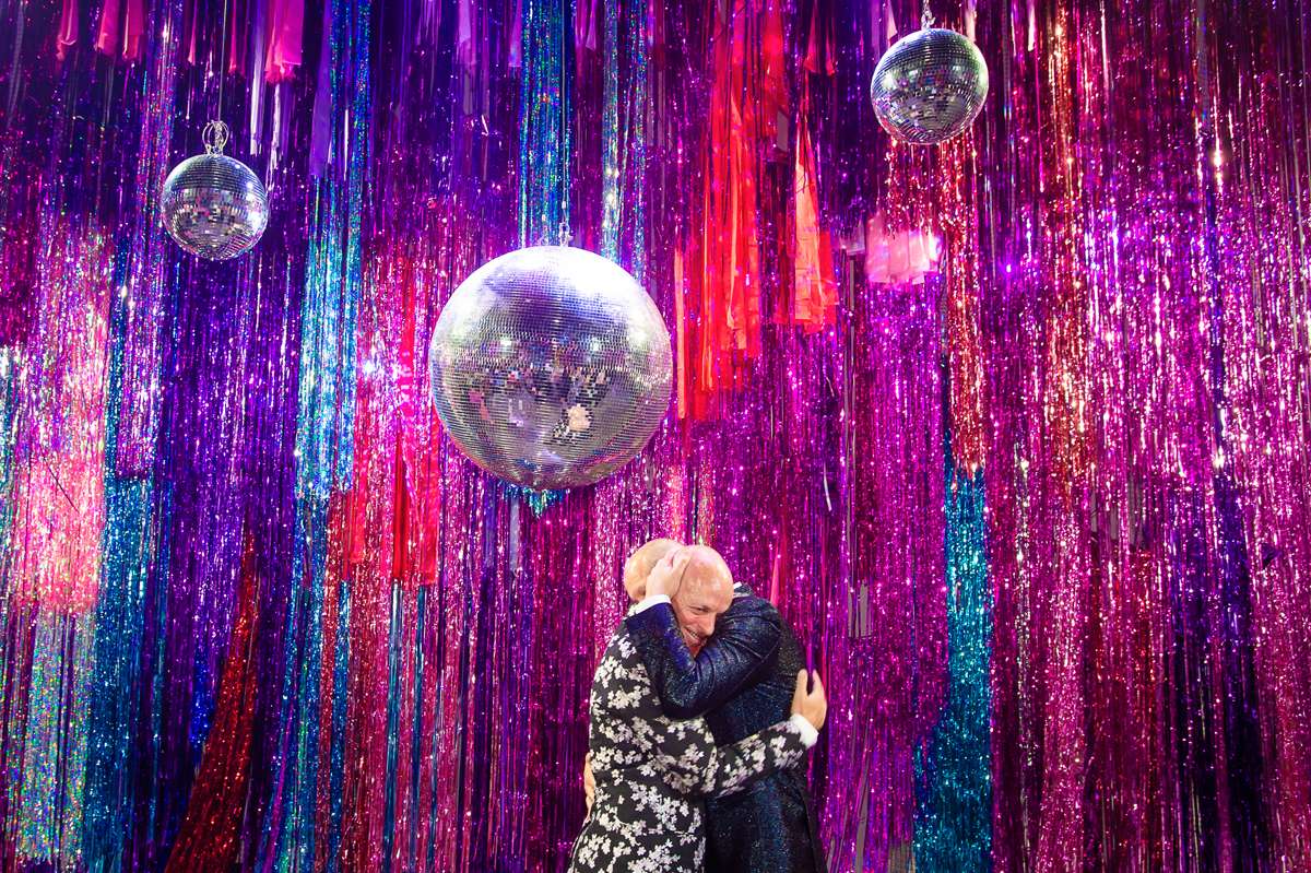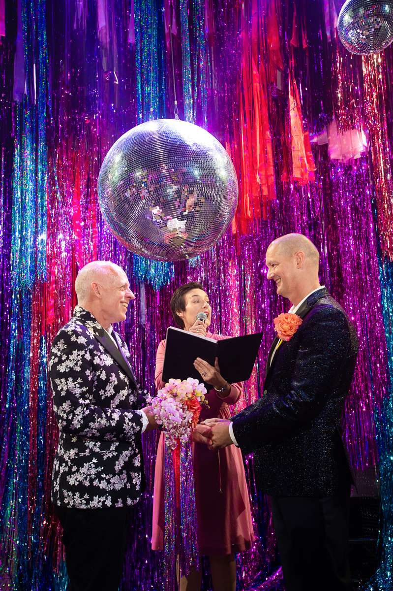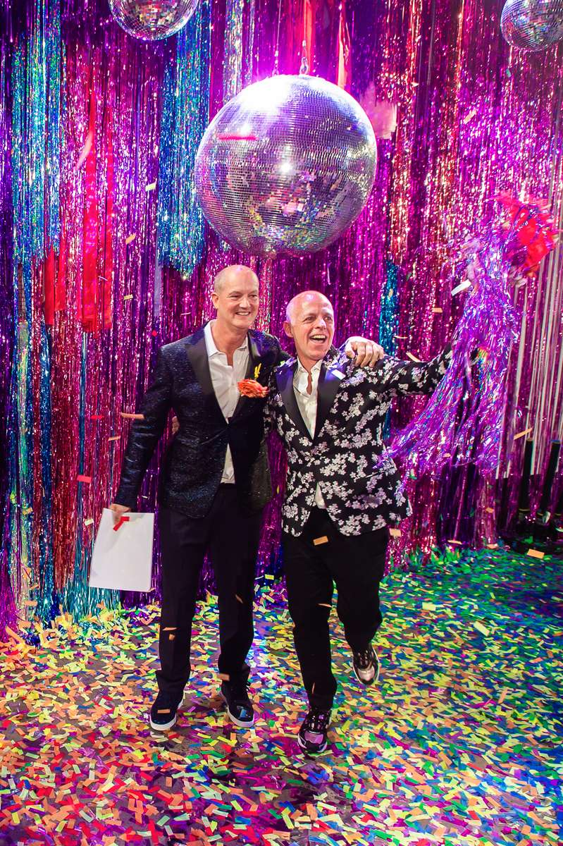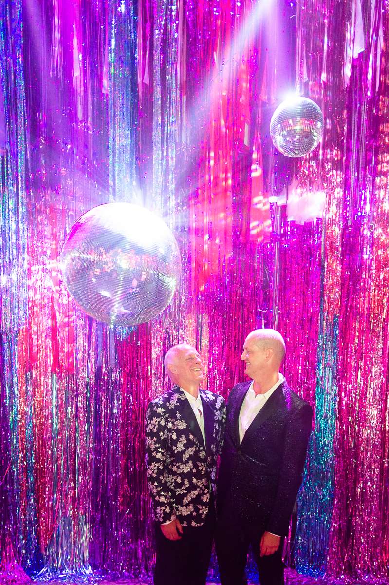 The couple first met on the dance floor 19 years ago so the theme of the party was literally perfect for them. They had disco balls, holographic screamers and amazing pink and purple lighting. They rounded off the night with drag and dance performances, DJs and a surprise lip-sync performance by one of the grooms.