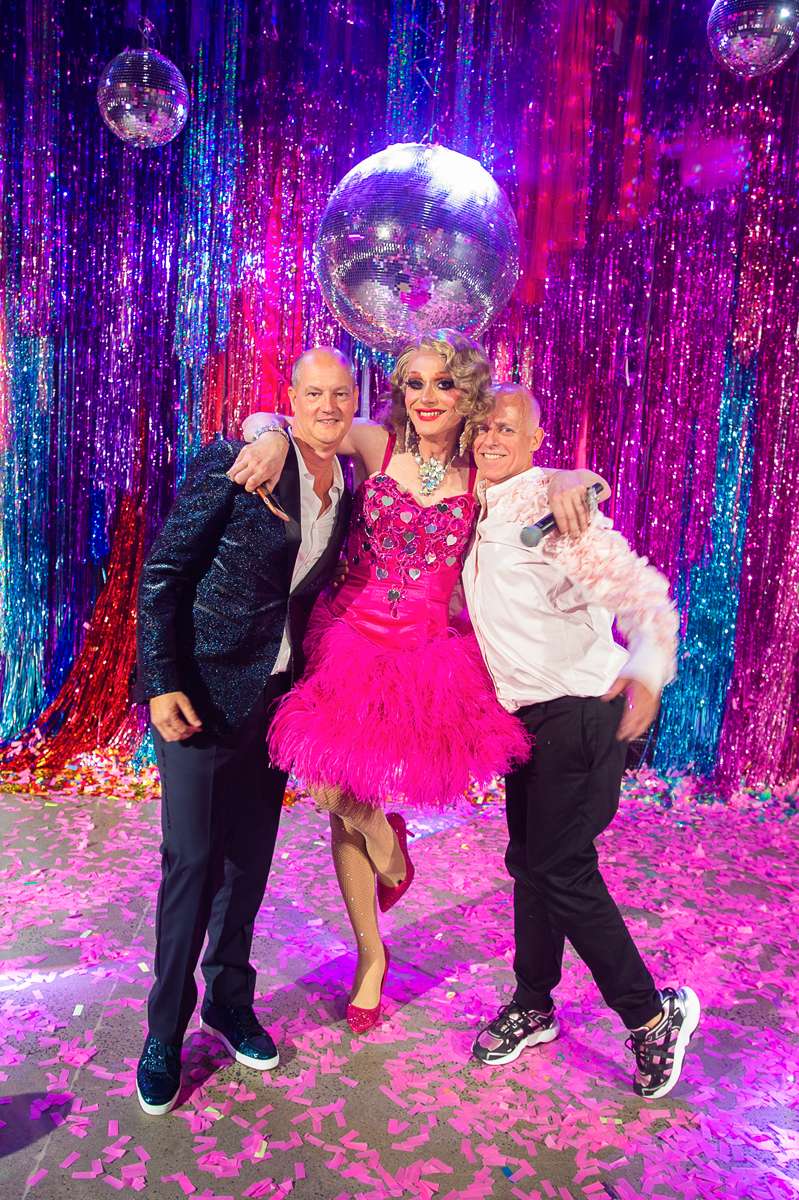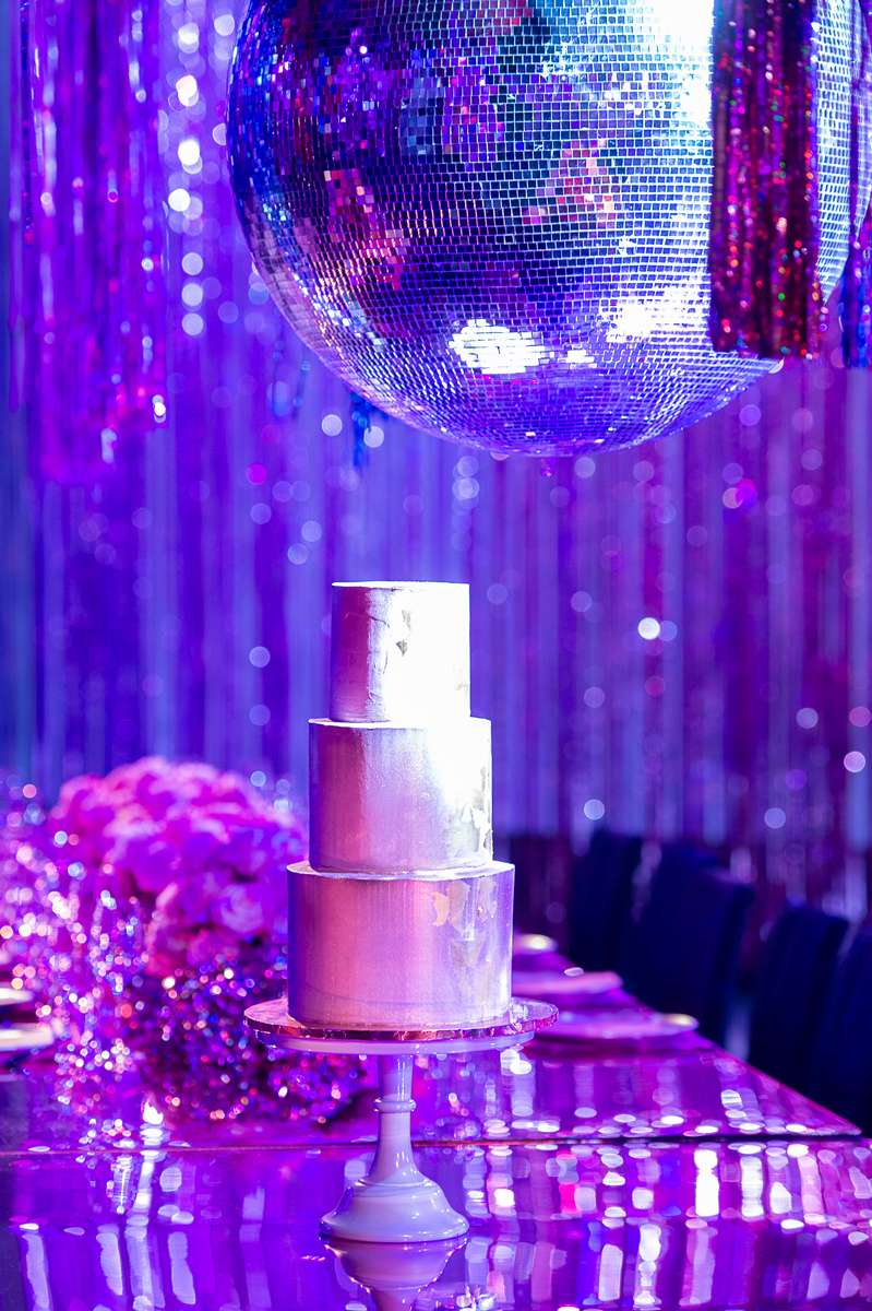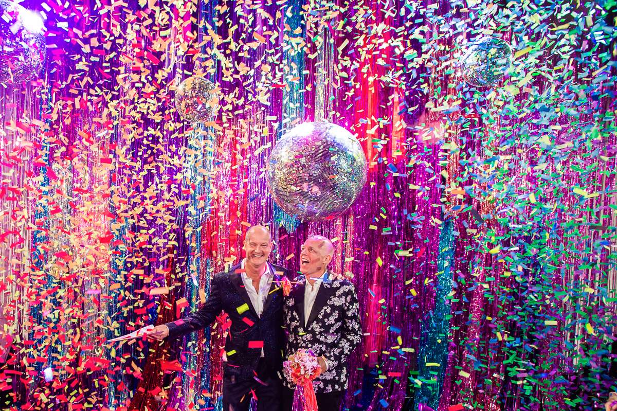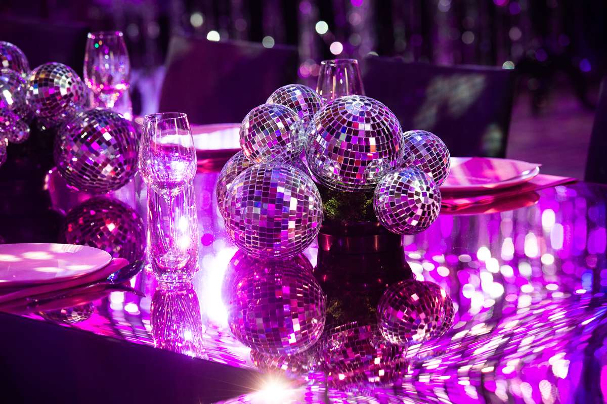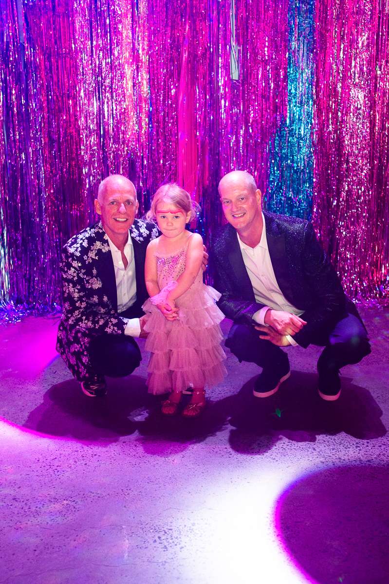 The couple first met on the dance floor 19 years ago so the theme of the party was literally perfect for them. They had disco balls, holographic screamers and amazing pink and purple lighting. They rounded off the night with drag and dance performances, DJs and a surprise lip-sync performance by one of the grooms.