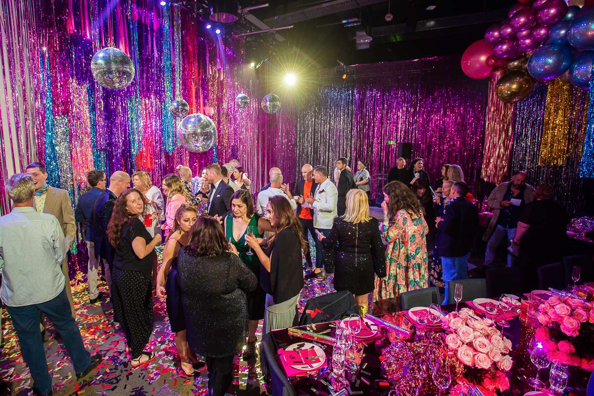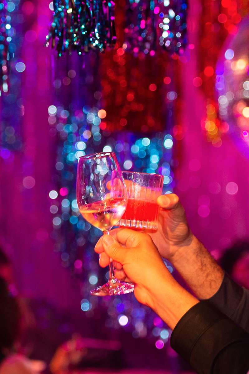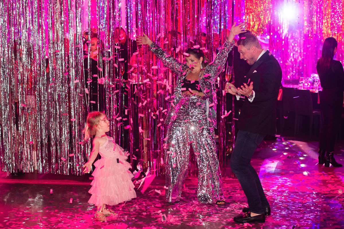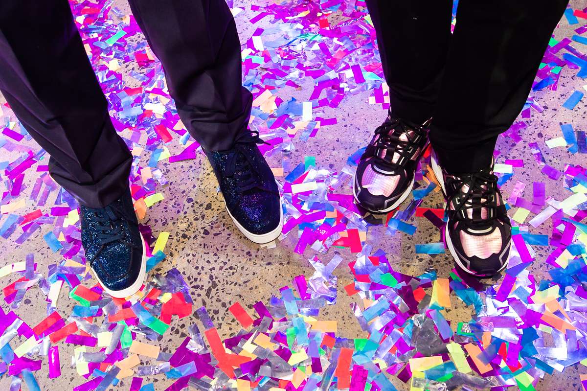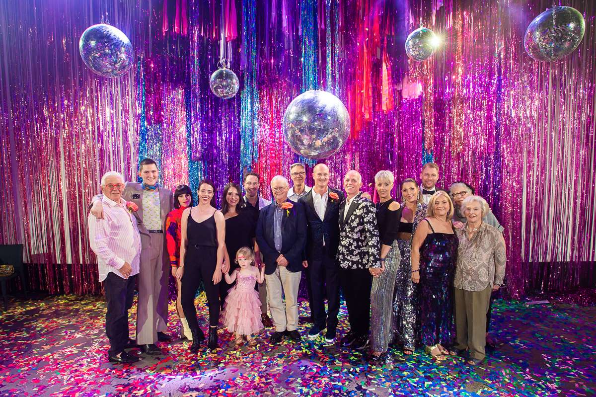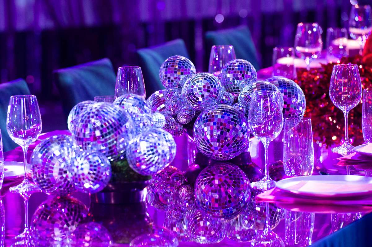The couple first met on the dance floor 19 years ago so the theme of the party was literally perfect for them. They had disco balls, holographic screamers and amazing pink and purple lighting. They rounded off the night with drag and dance performances, DJs and a surprise lip-sync performance by one of the grooms.