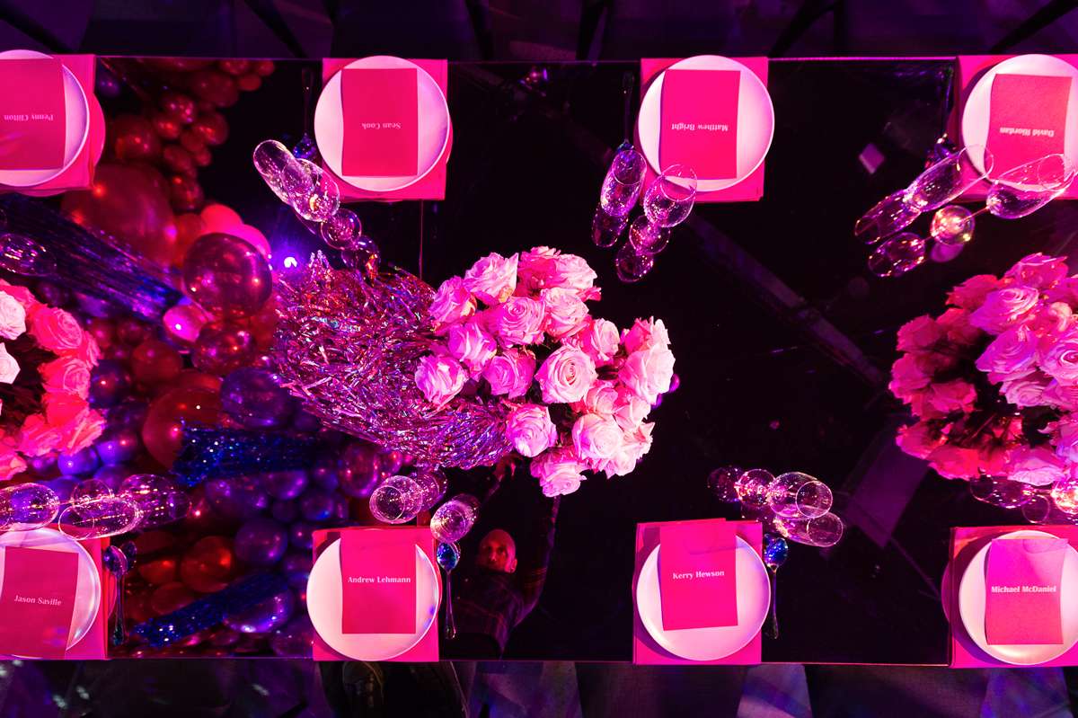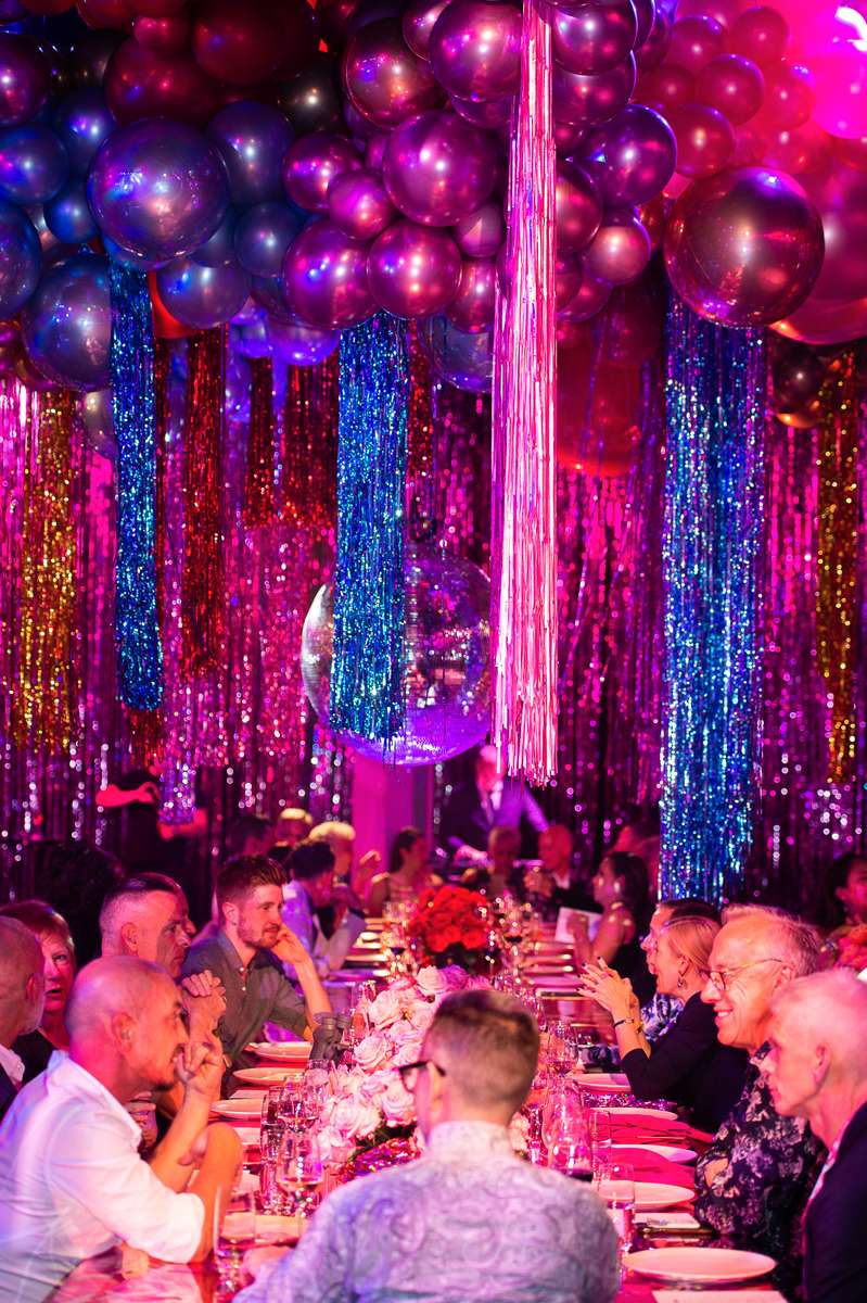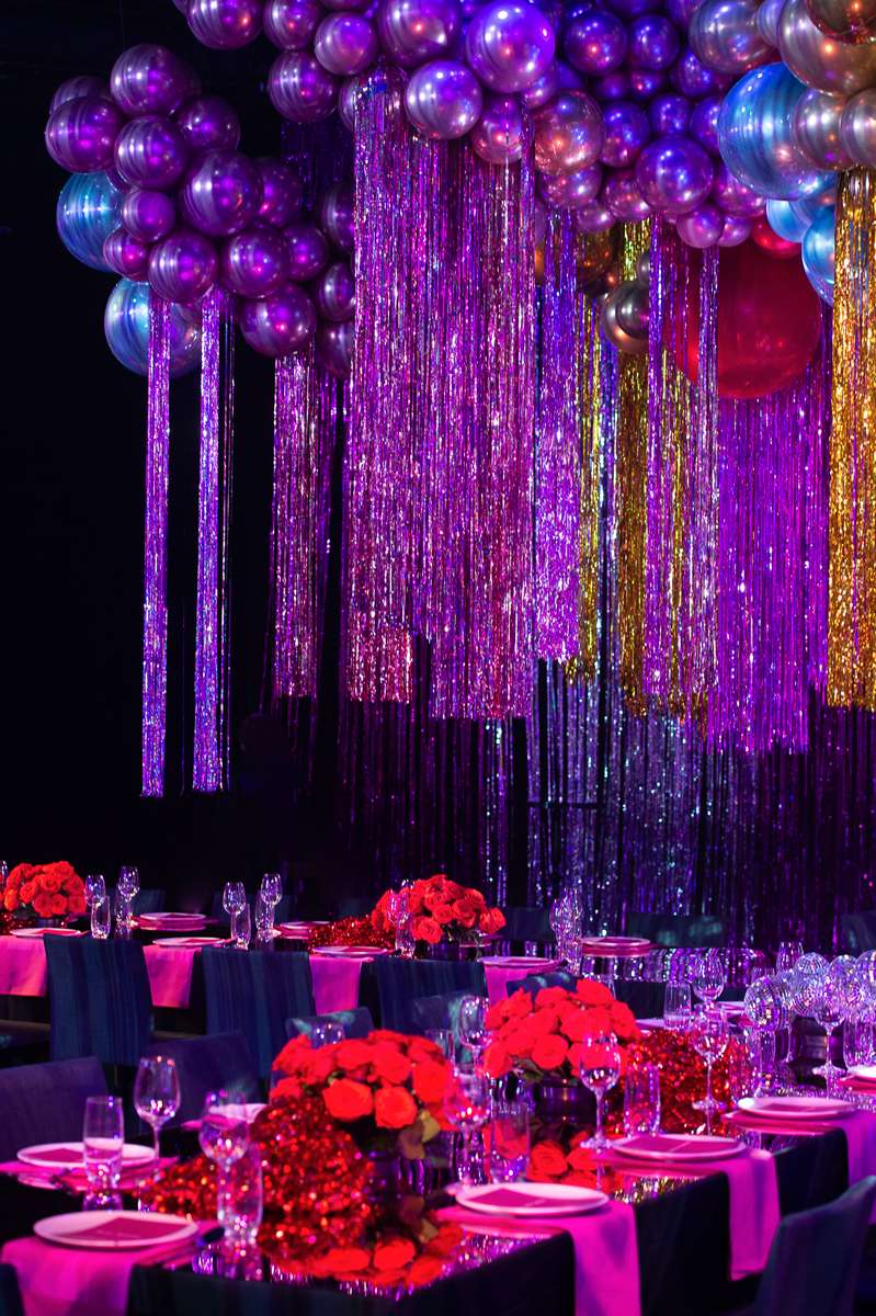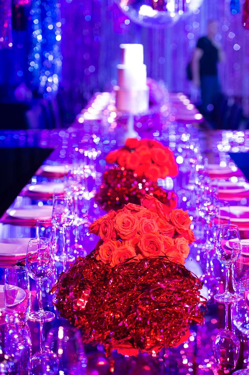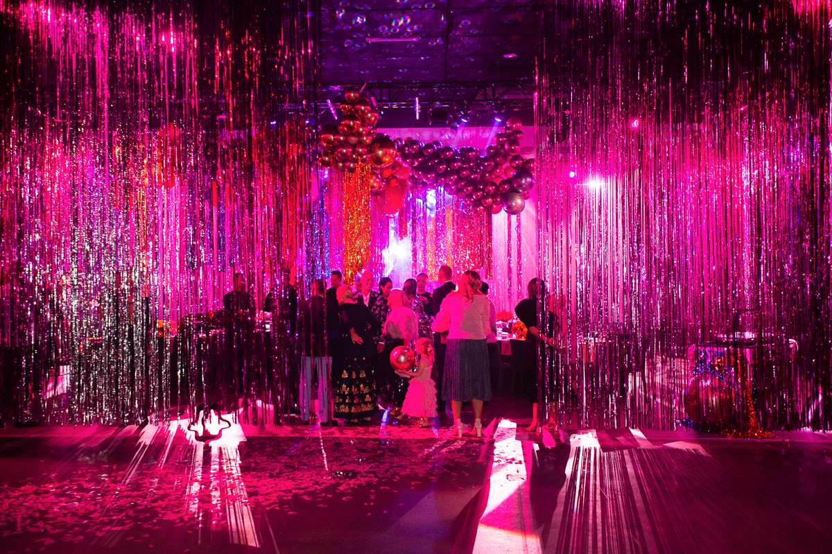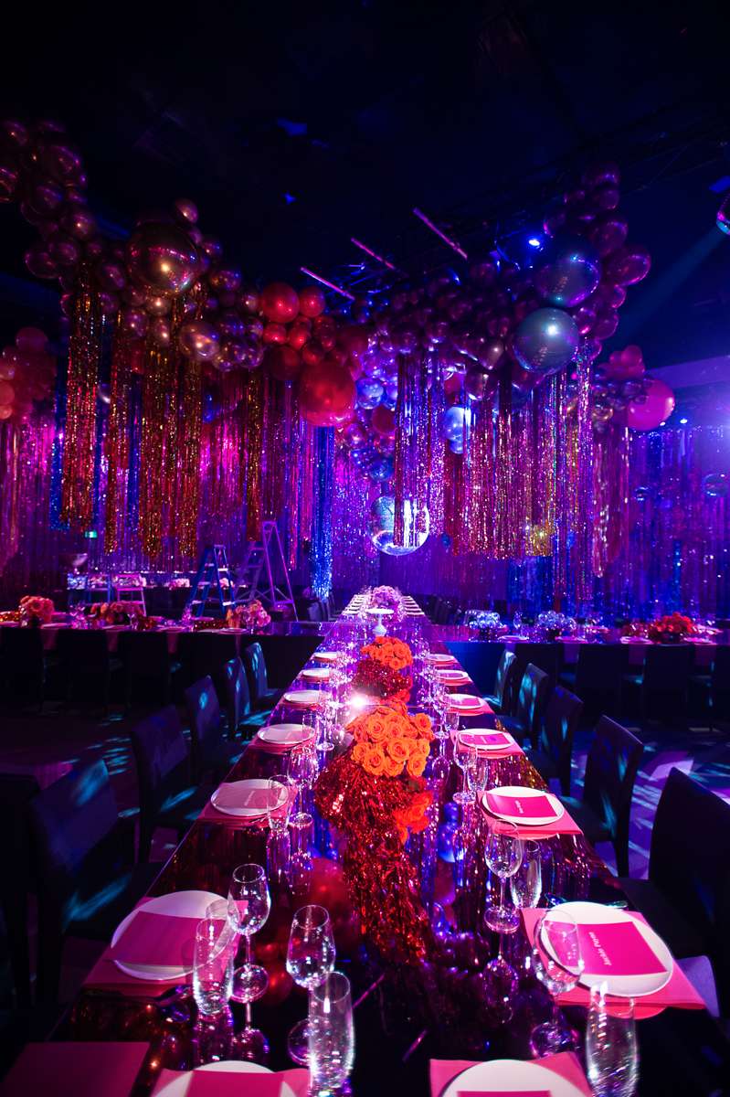 “Guests walked into the darkened cavernous room”, Sean continued. “In the middle of the space we created a walled room defined by walls of 6m tinsel curtain which you could see through. In the middle of the room was our dining table which everybody could sit at in the shape of a big X which had a pink mirror top that reflected the tinsel and balloon installation above.”