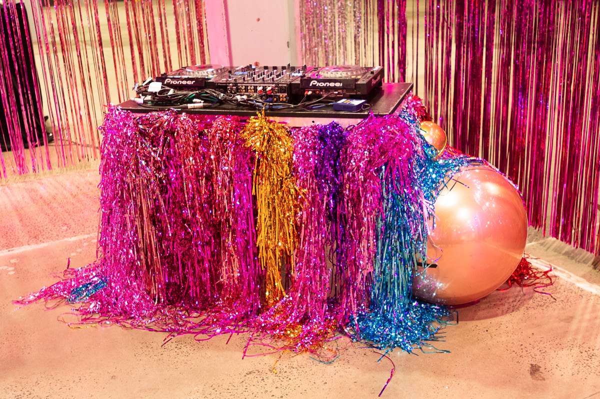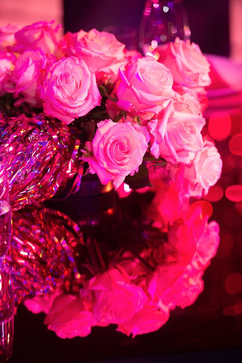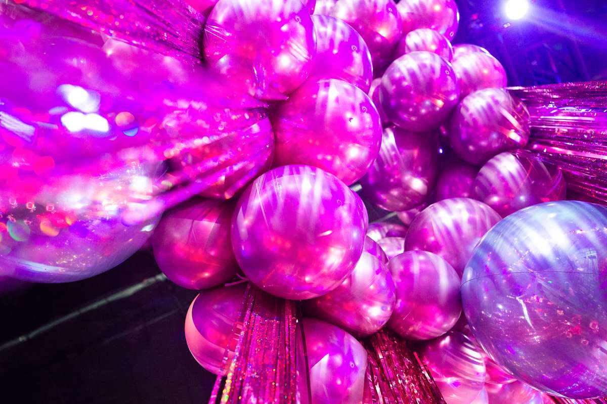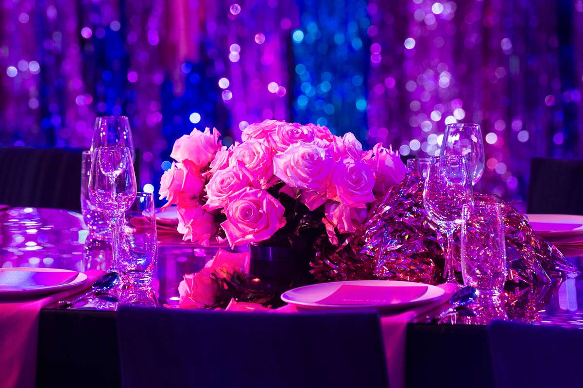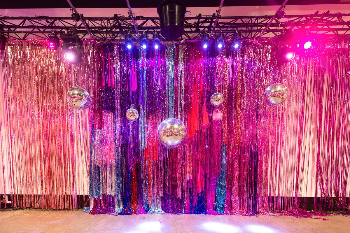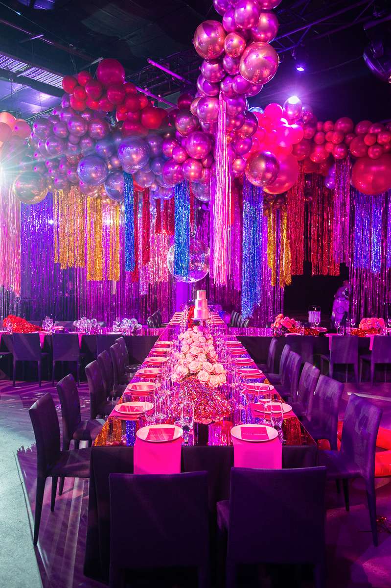 “Guests walked into the darkened cavernous room”, Sean continued. “In the middle of the space we created a walled room defined by walls of 6m tinsel curtain which you could see through. In the middle of the room was our dining table which everybody could sit at in the shape of a big X which had a pink mirror top that reflected the tinsel and balloon installation above.”