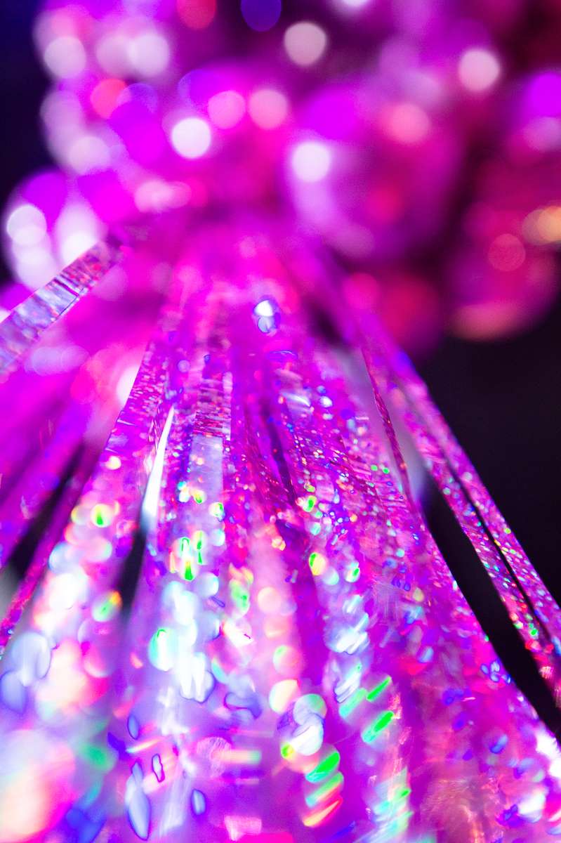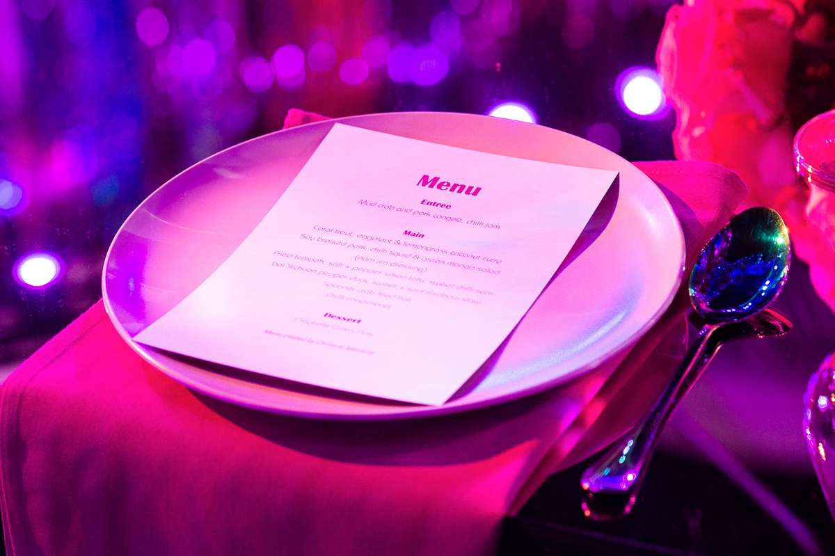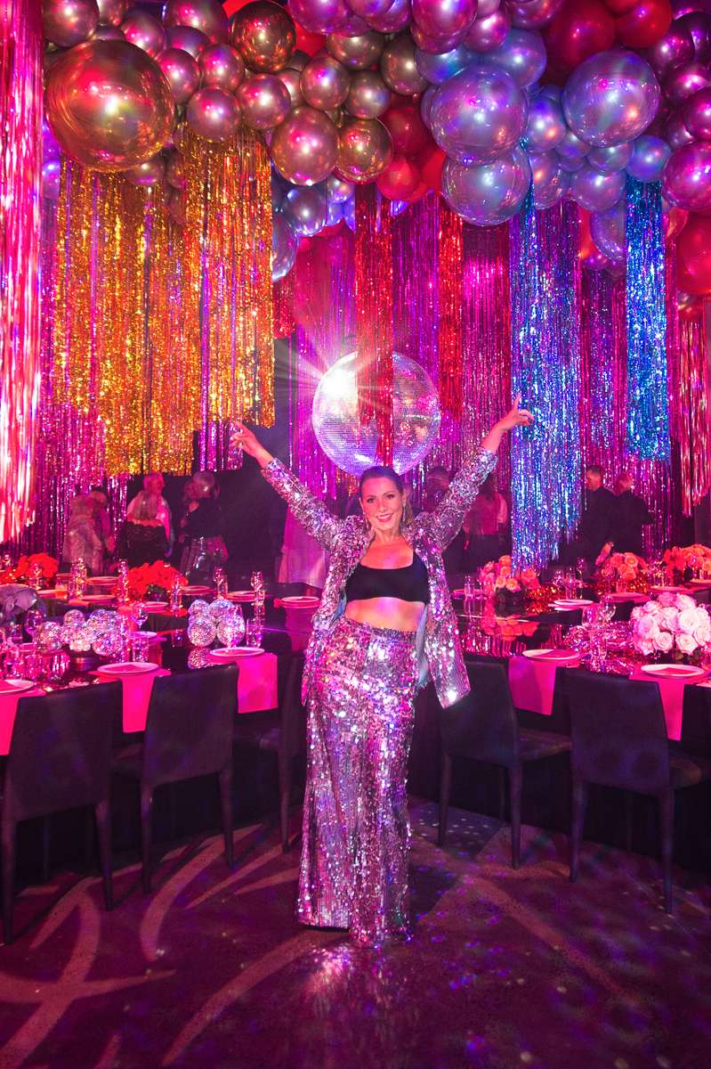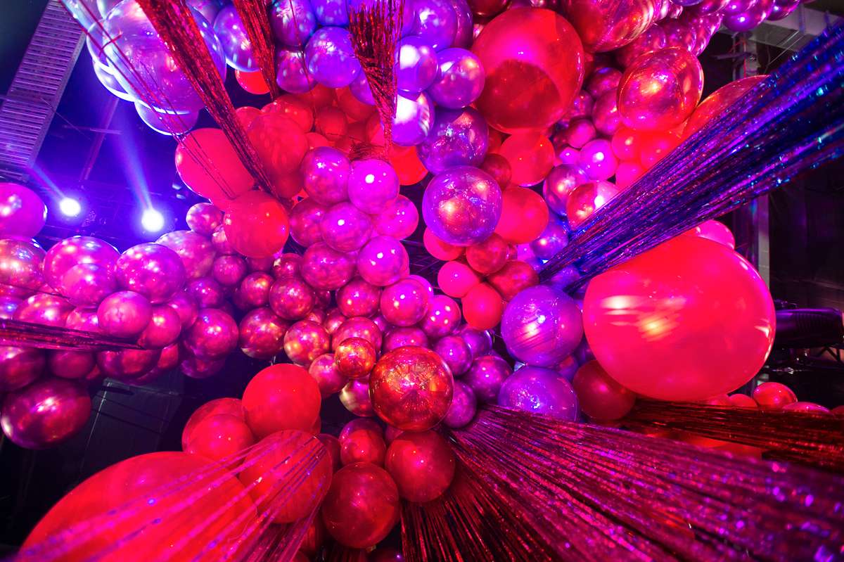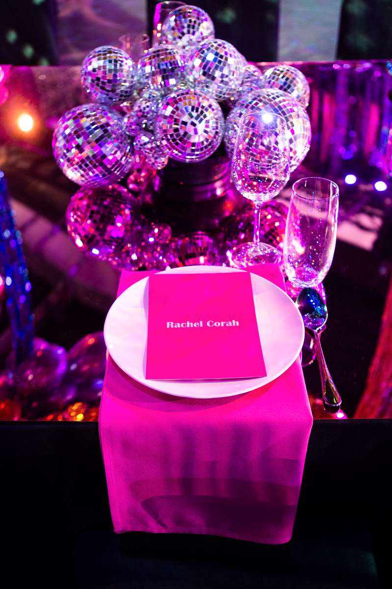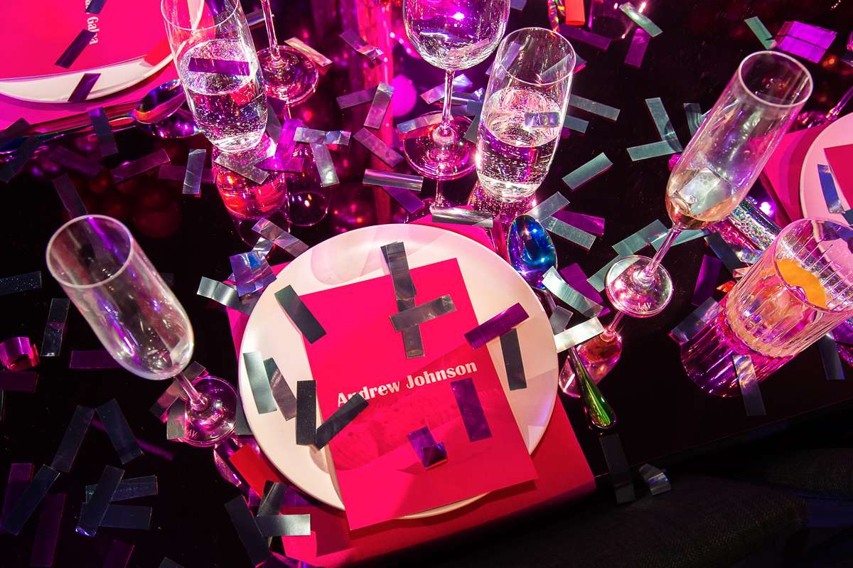 “Guests walked into the darkened cavernous room”, Sean continued. “In the middle of the space we created a walled room defined by walls of 6m tinsel curtain which you could see through. In the middle of the room was our dining table which everybody could sit at in the shape of a big X which had a pink mirror top that reflected the tinsel and balloon installation above.”