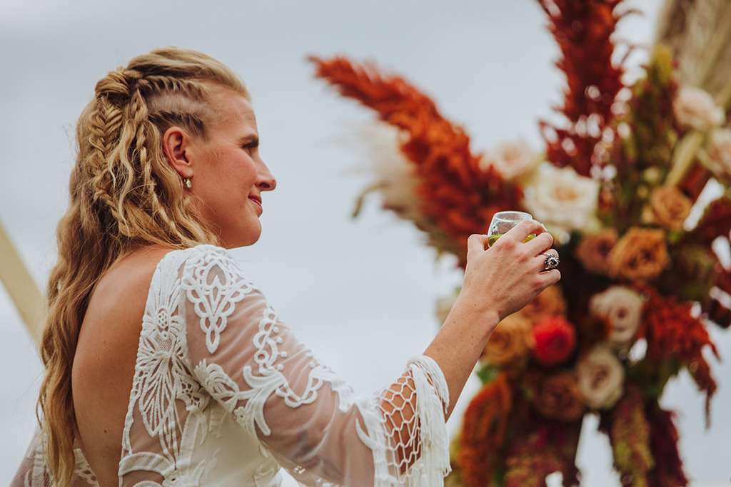 Matt made a ceremony backdrop, wooden triangles festooned with florals and ferns, and the rest they left to the stunning natural landscape. The ceremony, performed by Matt’s uncle, included Nordic inspired vows and the drinking of mead.