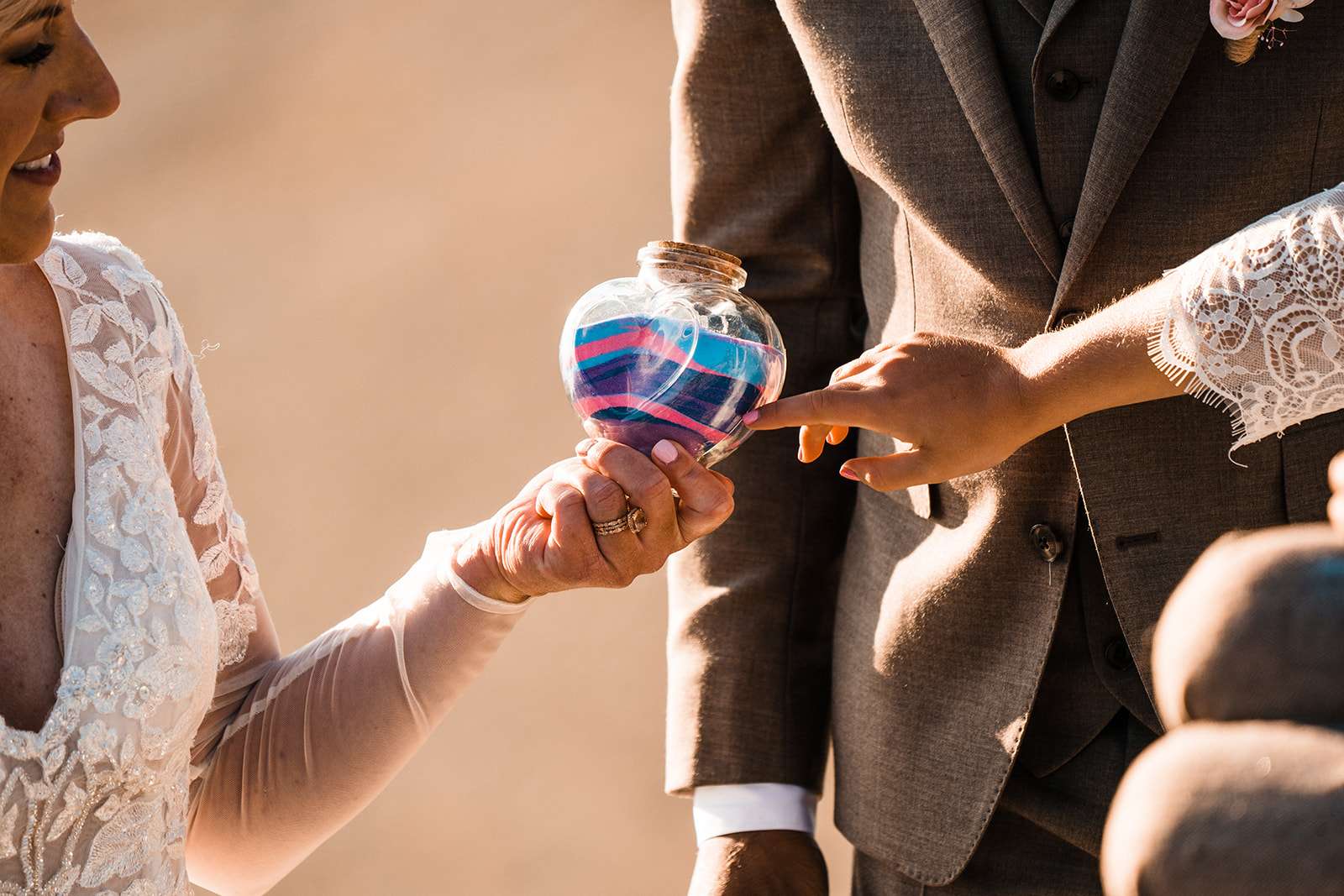 Katjarina Hurt, who they met through the PNW Outdoor Women Facebook group, came with them and officiated the ceremony. “Our ceremony took place at sunrise on at Mount Rainier, which meant a 2am wake up. Once we arrived at our destination, we changed on opposite sides of a boulder, so we could still get that initial first look once we were ready. It was a Thursday morning, so the trail was quiet and we had the mountain pretty much to ourselves. We included our children in the ceremony as well. After vows and ‘I Do’s’, we popped some champagne and had our first dance on a cliff with views all around!”
