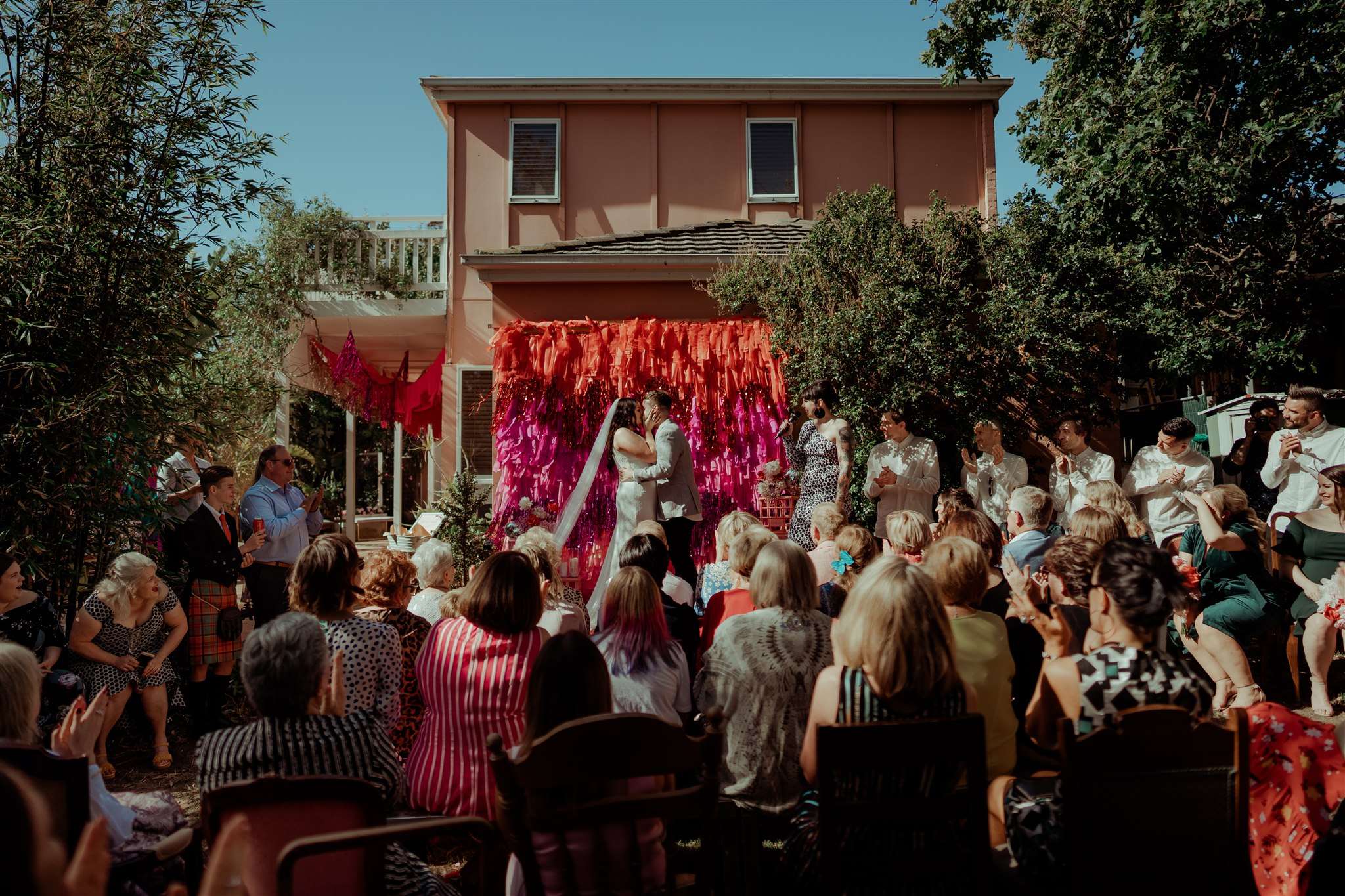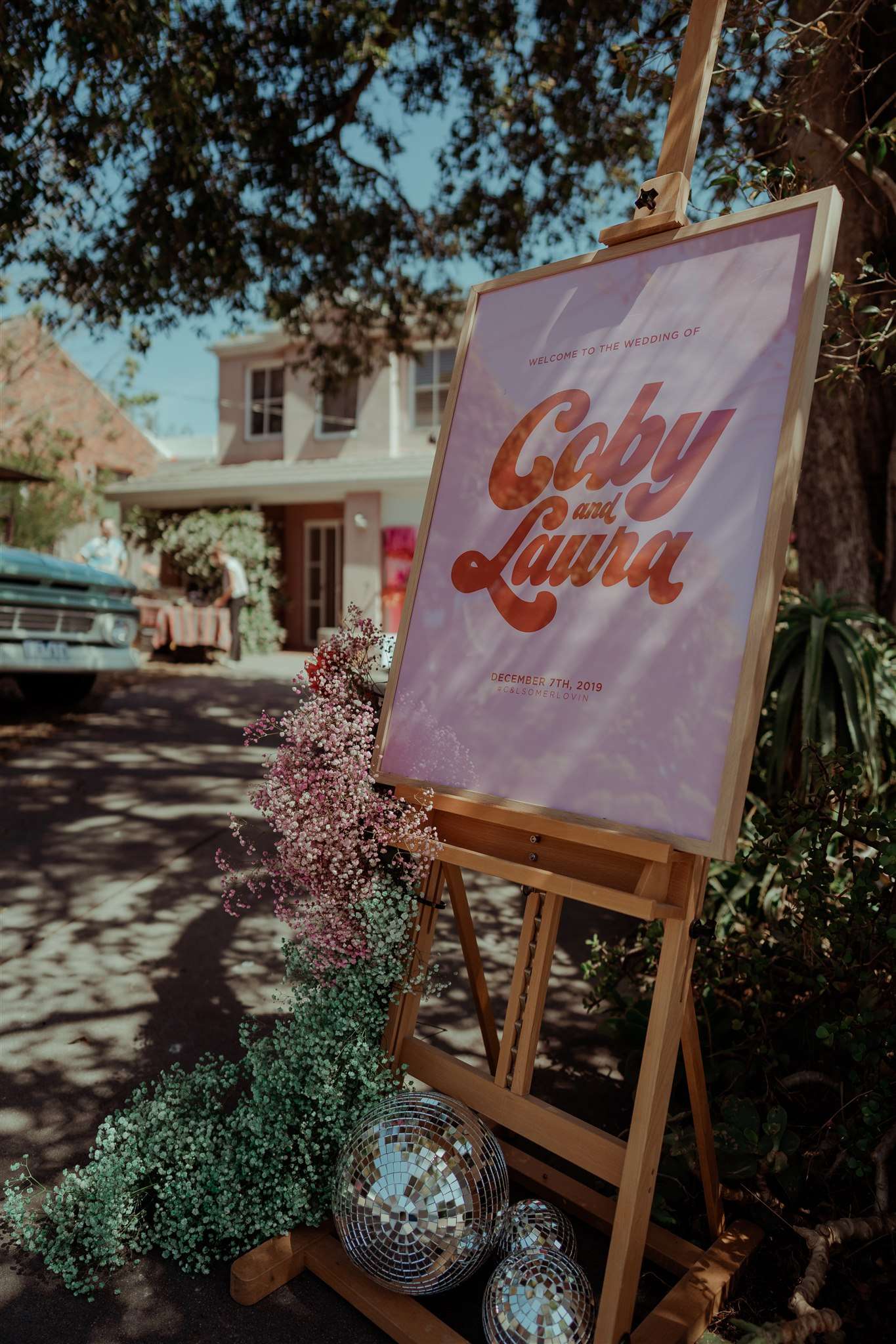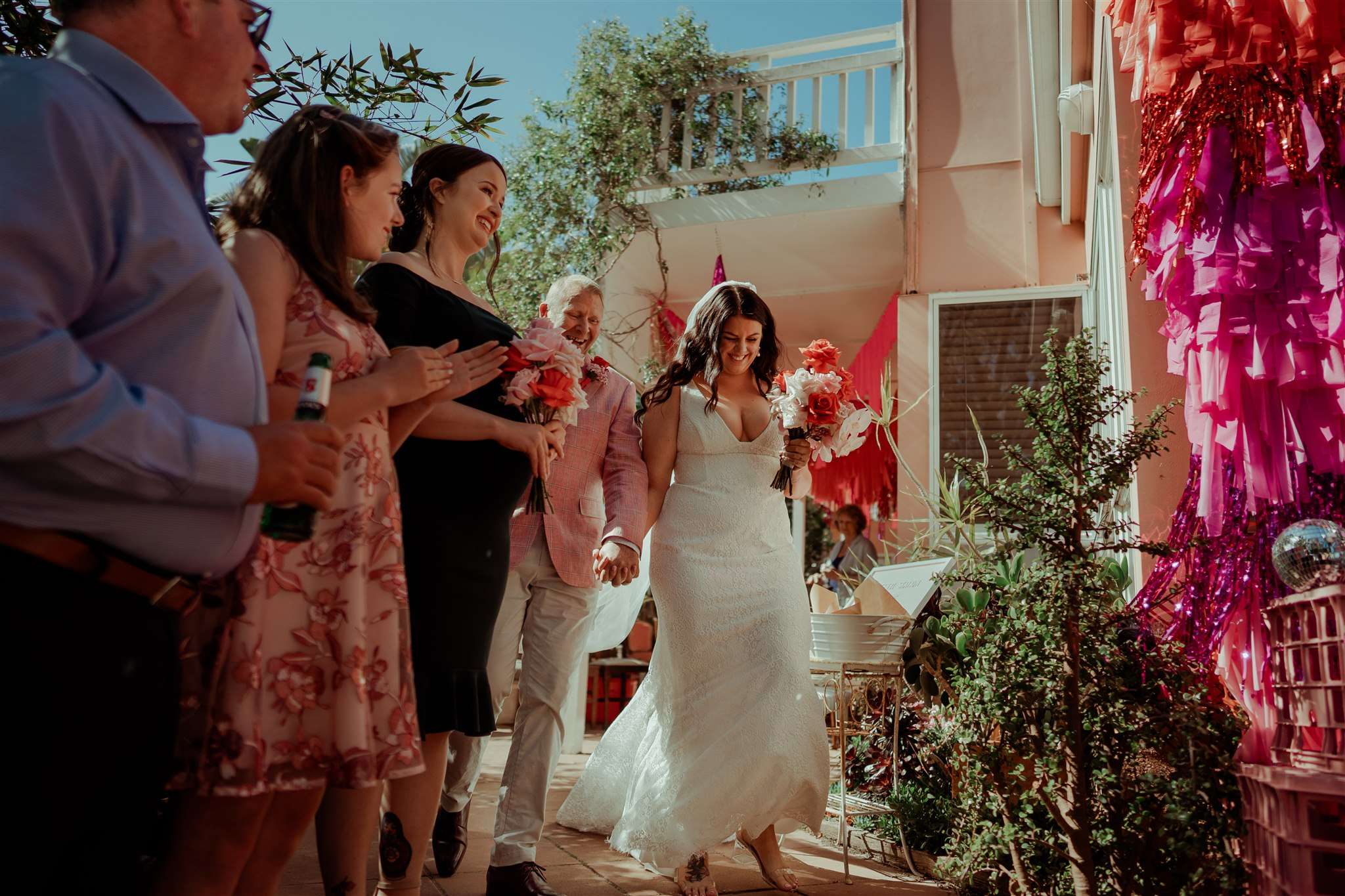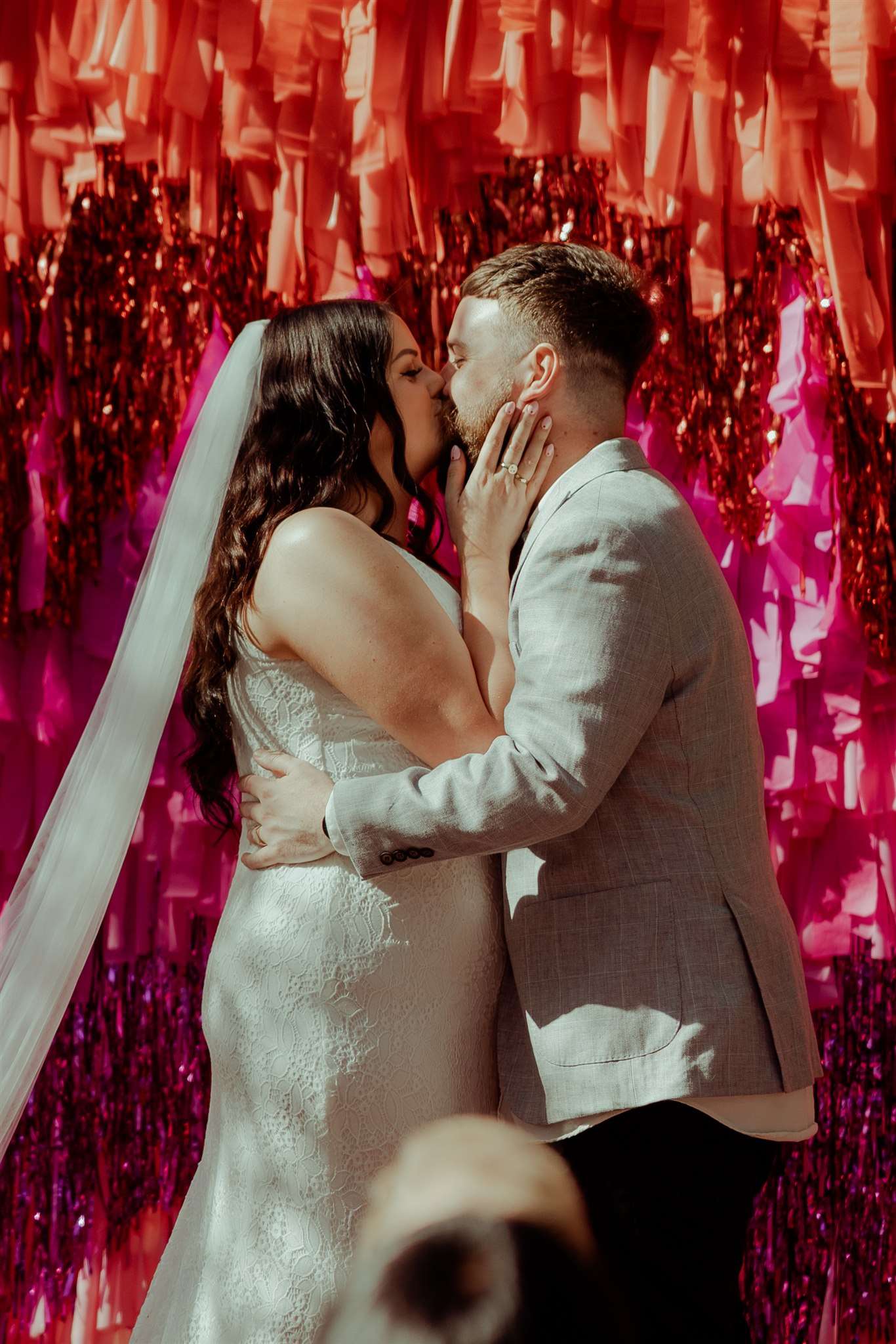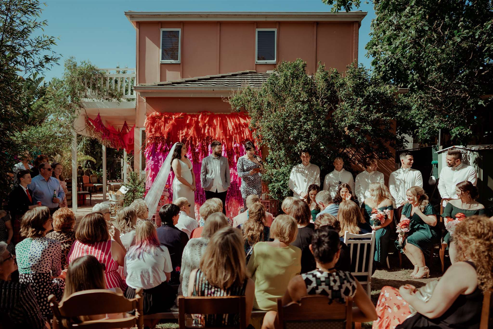 When the bride’s parents live in a pink house, it would be pretty much criminal not to host the wedding there. So, when Laura and Coby married in December last year, they chose the backyard as the location for their ceremony and drinks reception and decked it out with pink, red and sparkly details including iridescent streamer backdrops, disco balls and pink crates with flowers in them!