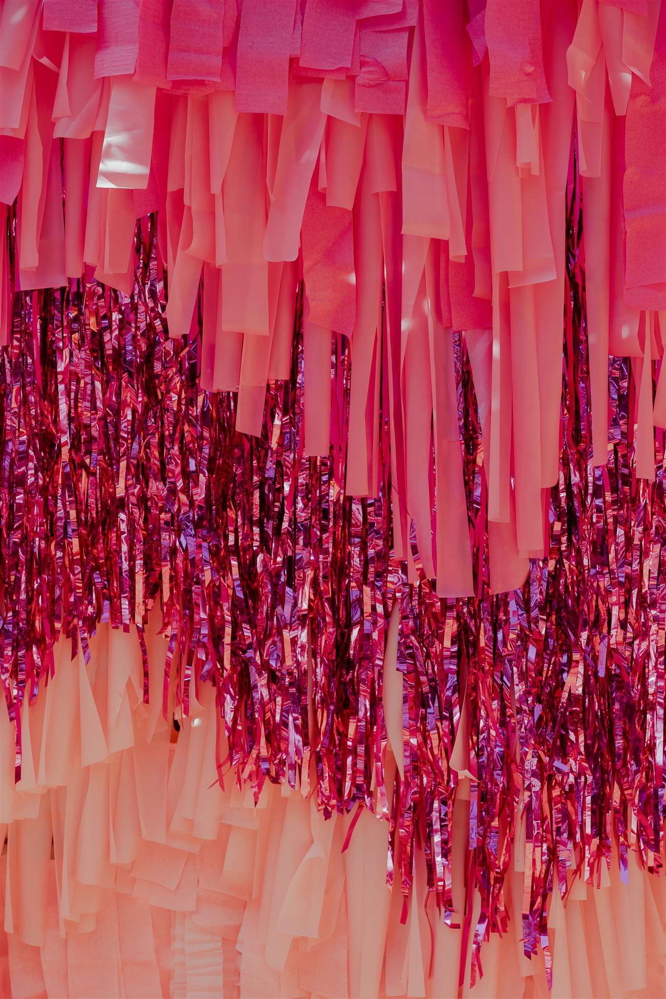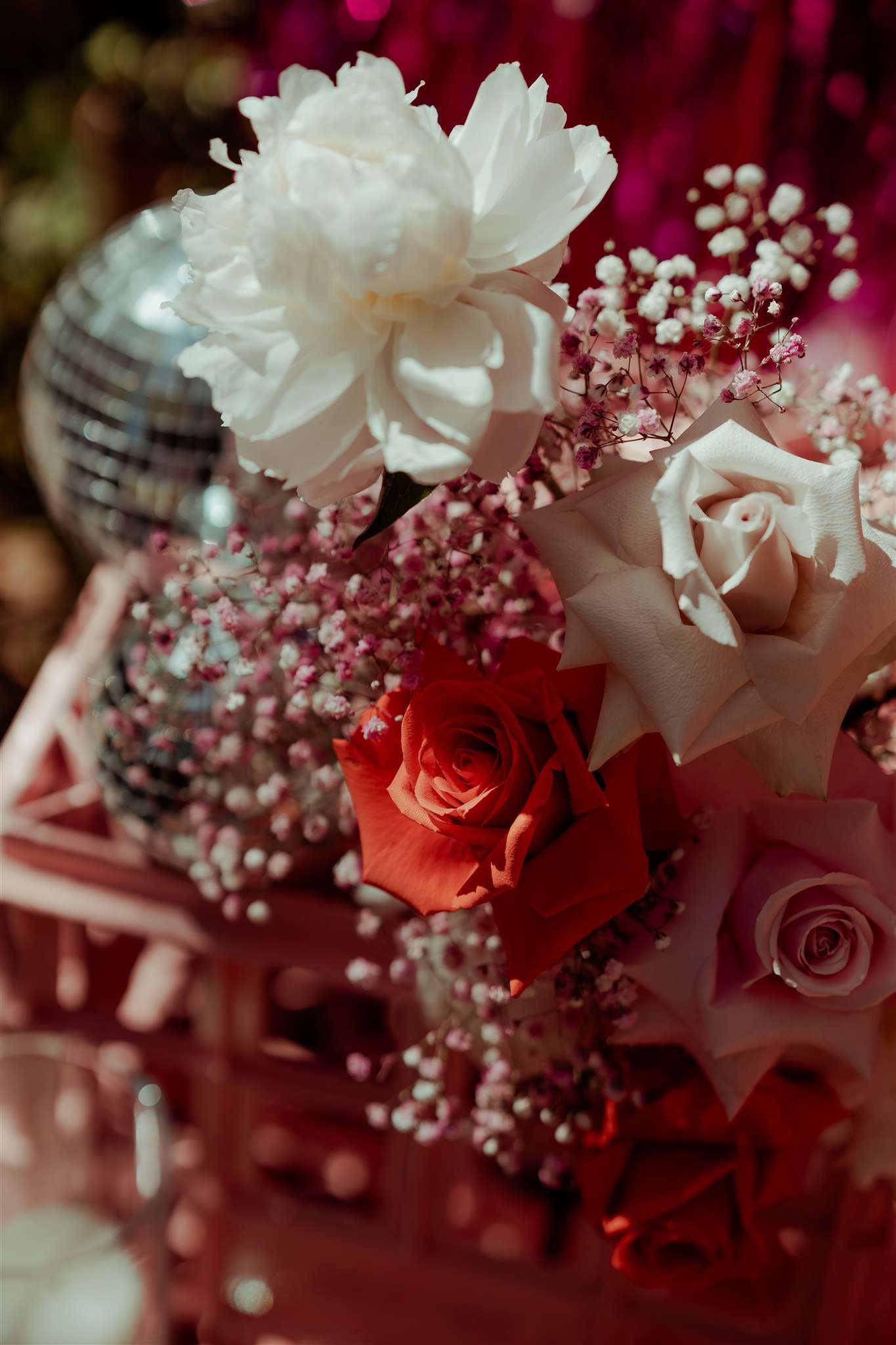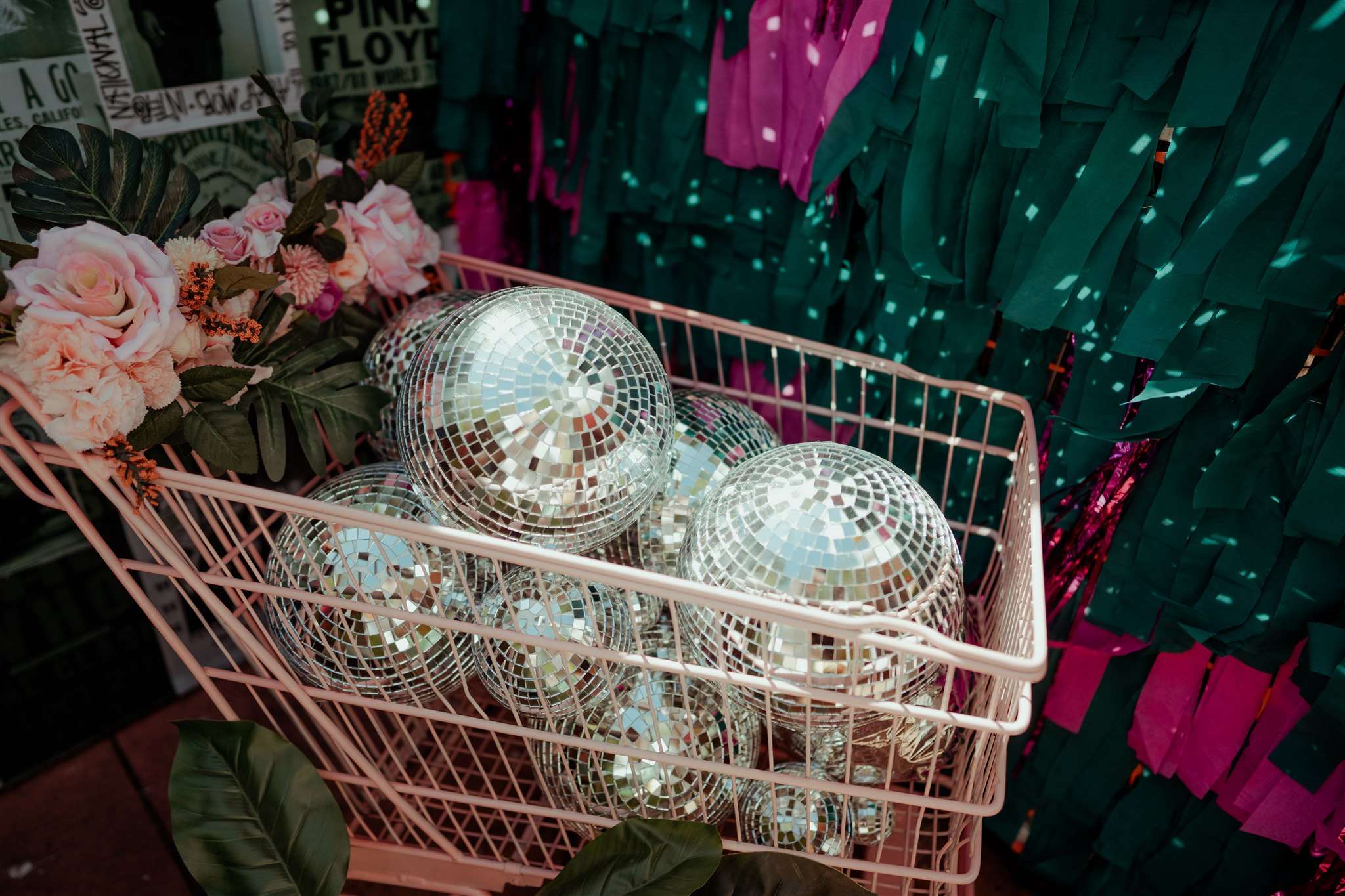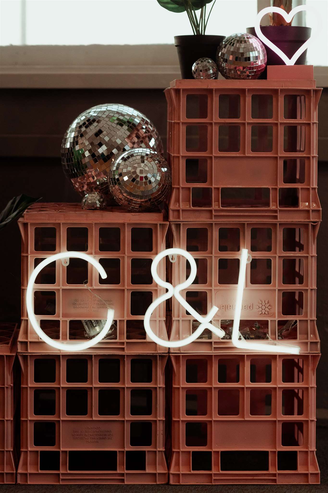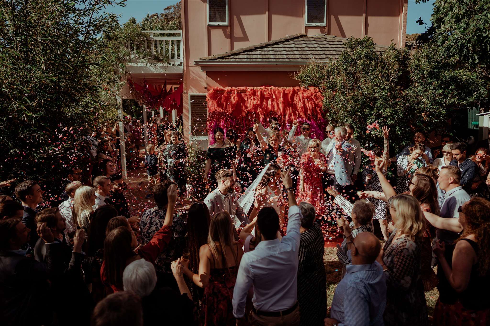 When the bride’s parents live in a pink house, it would be pretty much criminal not to host the wedding there. So, when Laura and Coby married in December last year, they chose the backyard as the location for their ceremony and drinks reception and decked it out with pink, red and sparkly details including iridescent streamer backdrops, disco balls and pink crates with flowers in them!