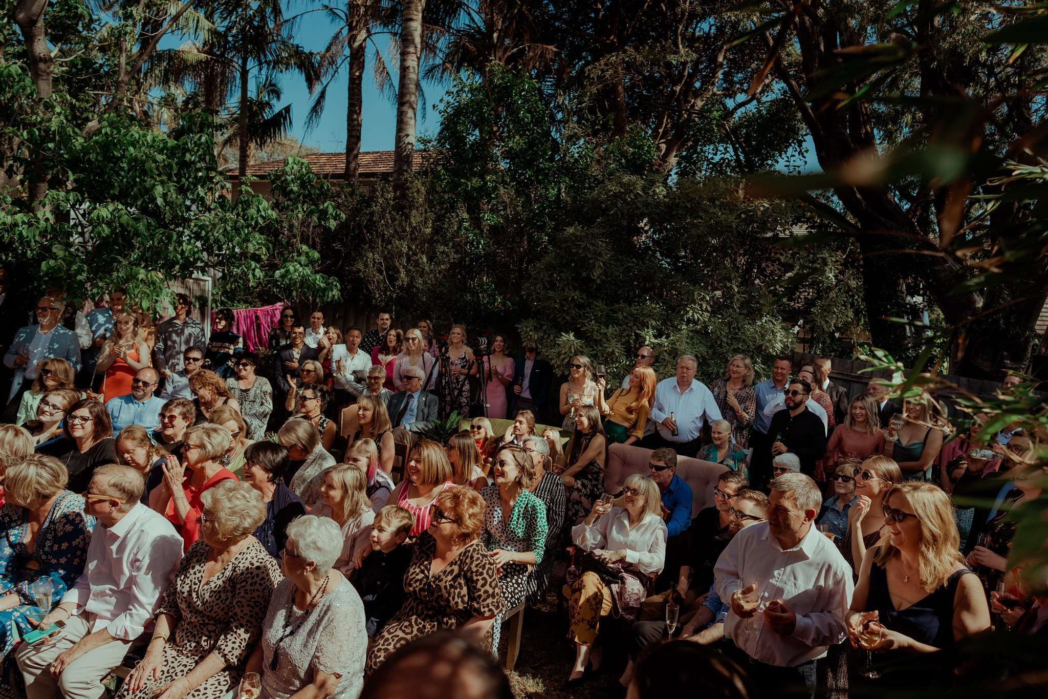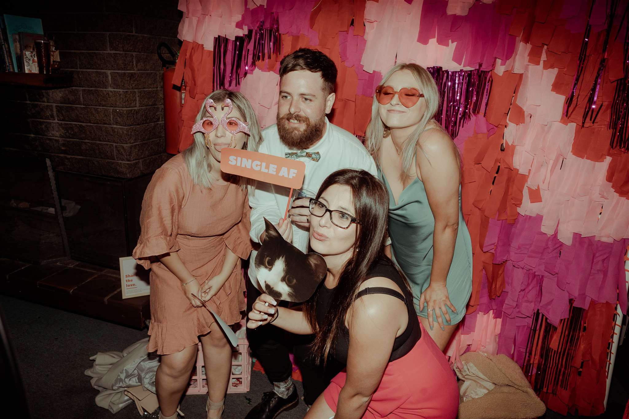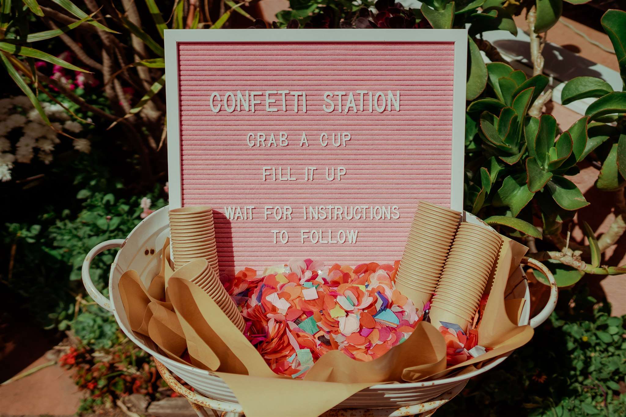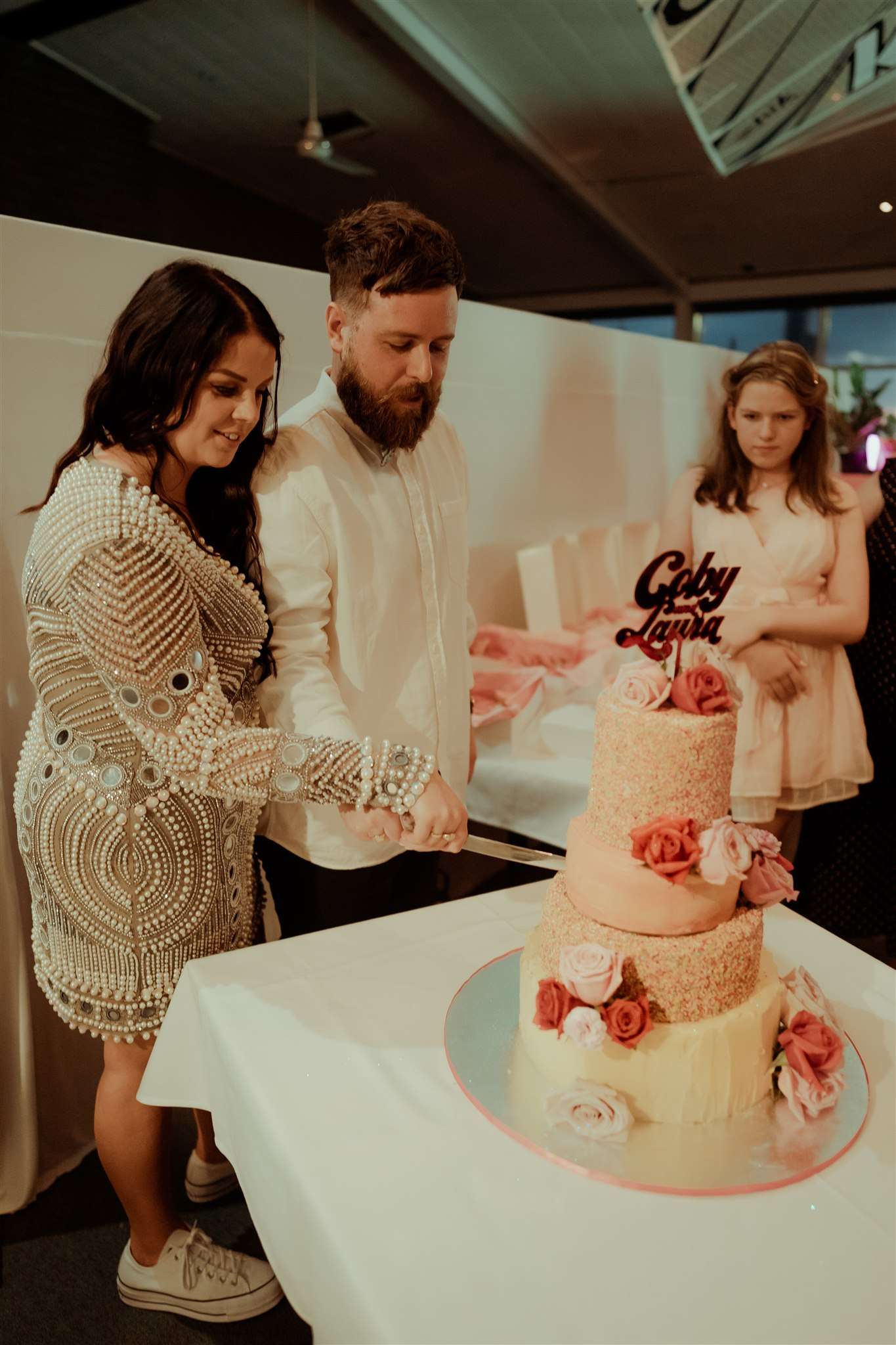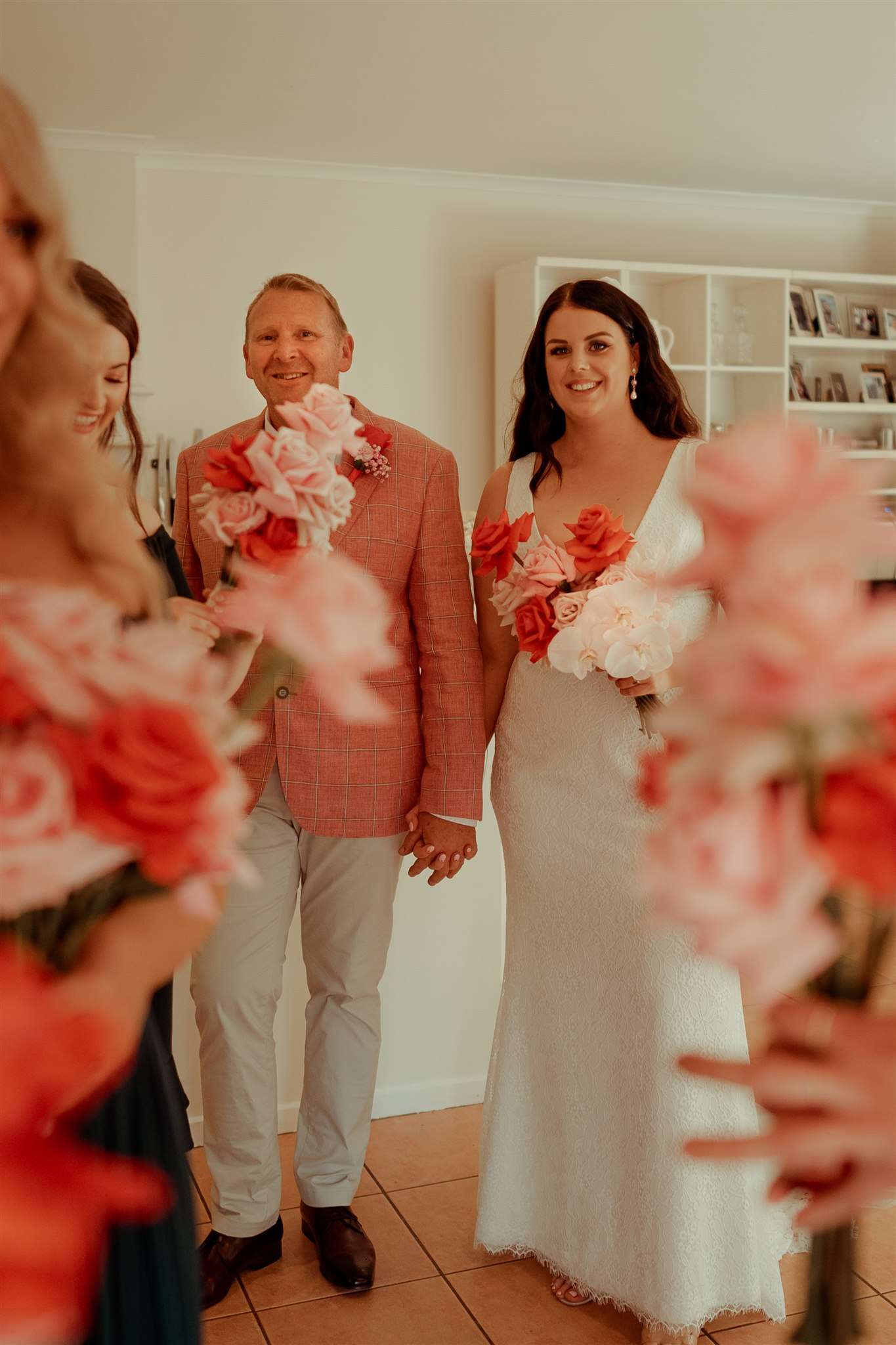 When the bride’s parents live in a pink house, it would be pretty much criminal not to host the wedding there. So, when Laura and Coby married in December last year, they chose the backyard as the location for their ceremony and drinks reception and decked it out with pink, red and sparkly details including iridescent streamer backdrops, disco balls and pink crates with flowers in them!