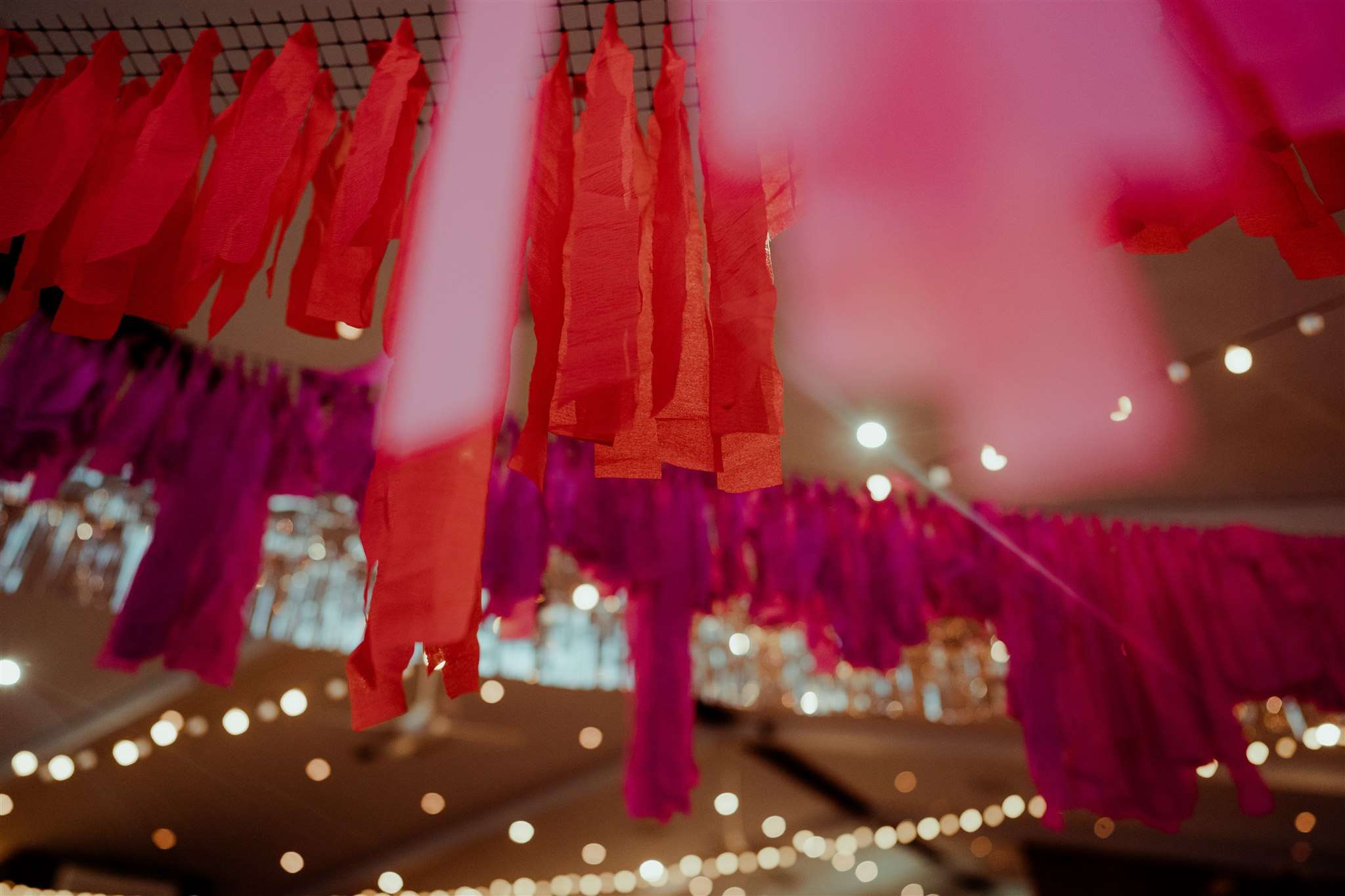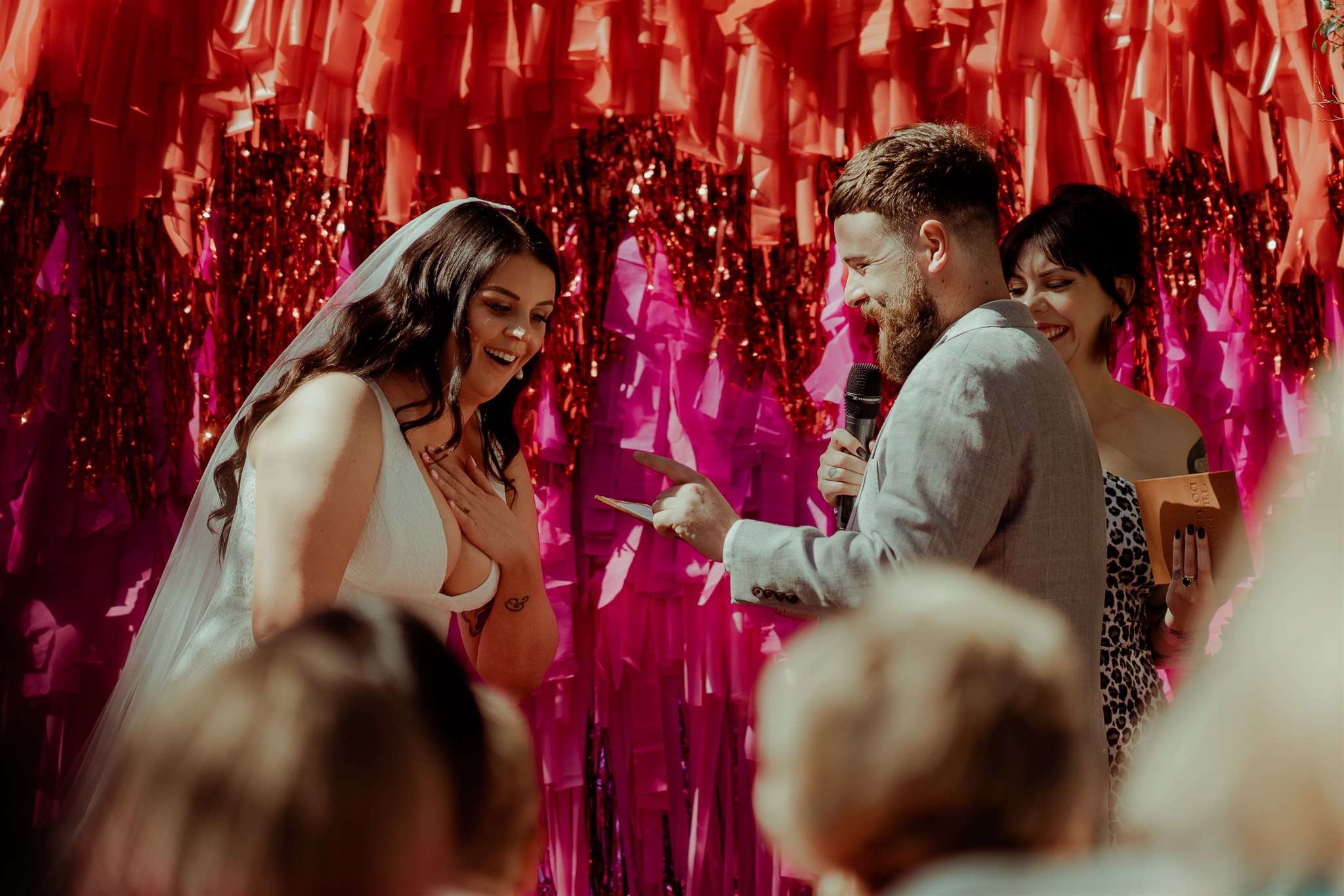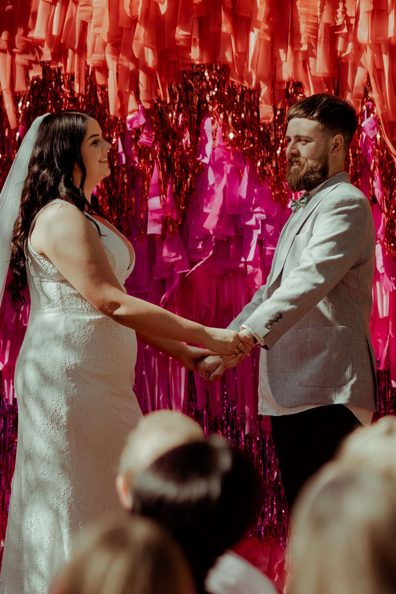 “Our wedding theme was pinks and reds galore, full of bright colours, fun and very sparkly”, explained the bride. “It was kinda like a kids party meets disco meets rock show.”