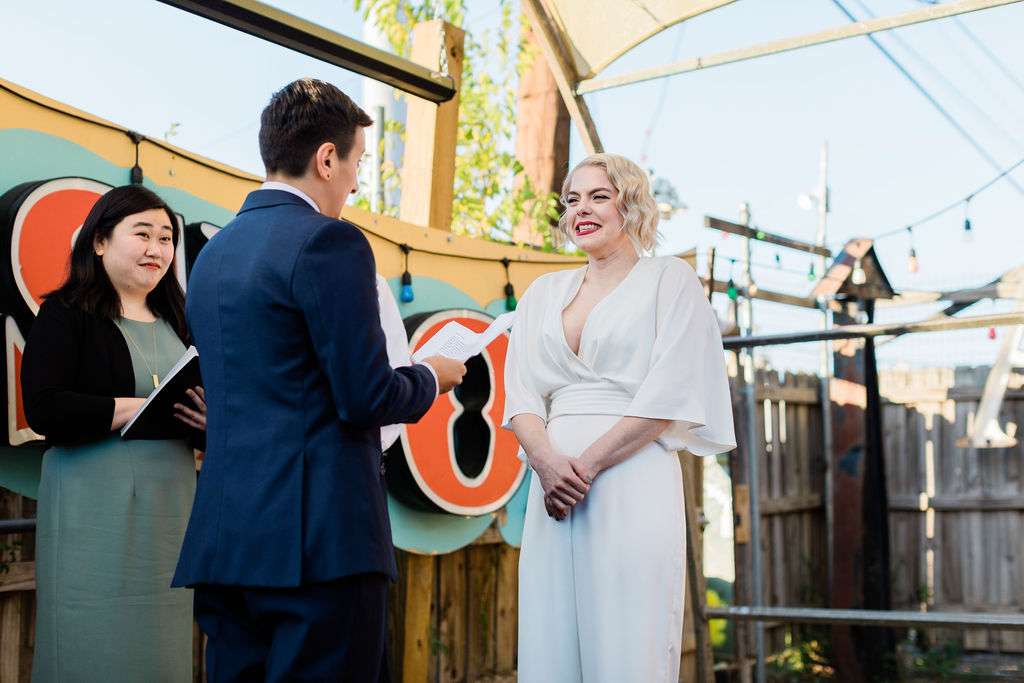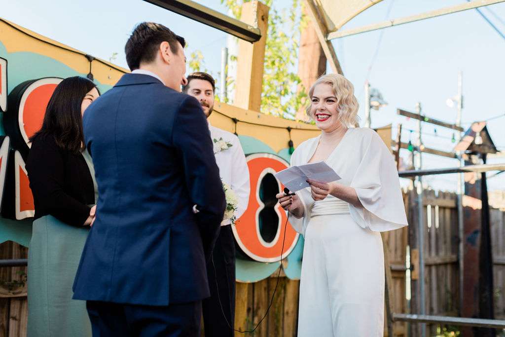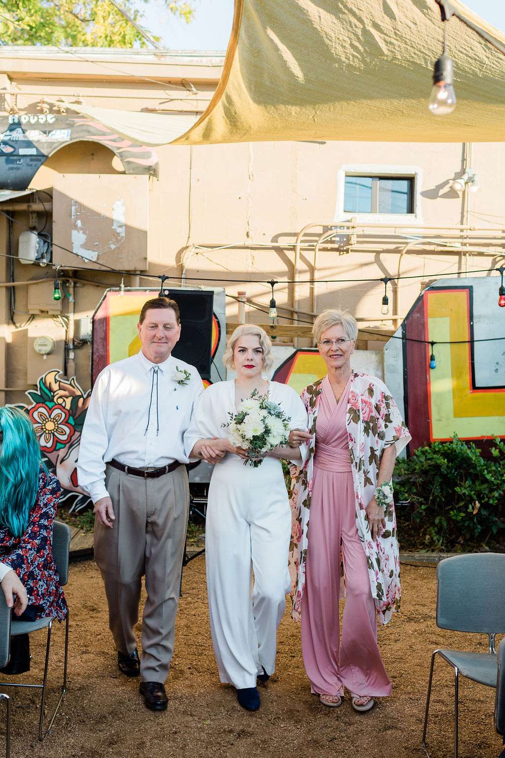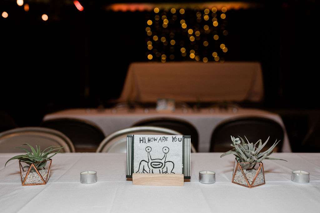 Most of the wedding was DIY, but since Spiderhouse isn’t a typical wedding venue, they brought in a co-ordinator to give a helping hand in getting the venue wedding ready. Their centrepieces were tea light candles and air plants, along with postcards of cool Austin staples as table names. They were fortunate that the venue didn’t need a lot of additional décor, and what they did bring in they patched together from craft stores, Facebook marketplace, and finds from their parents.