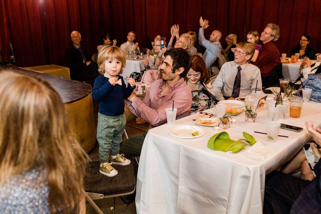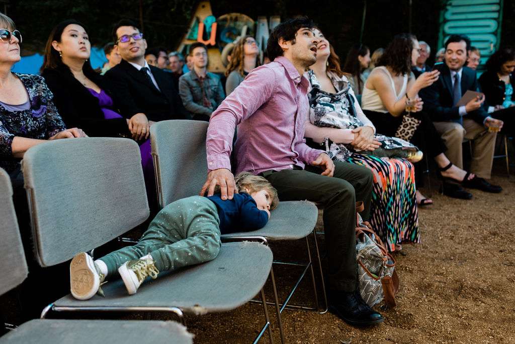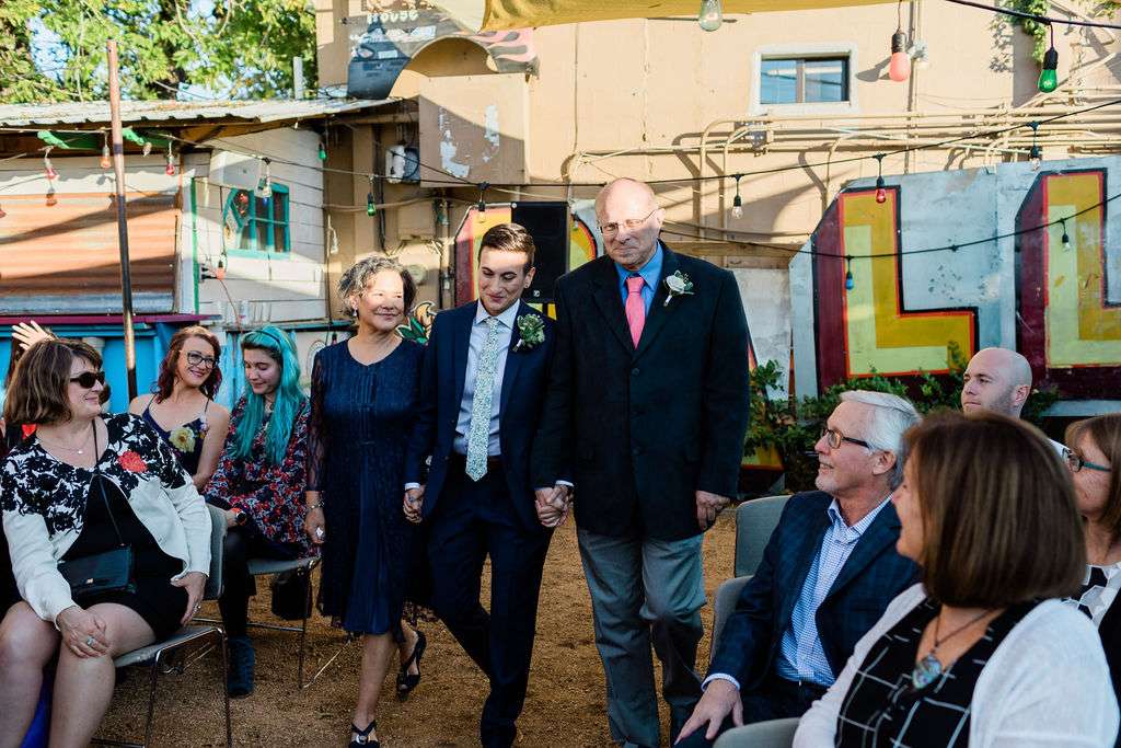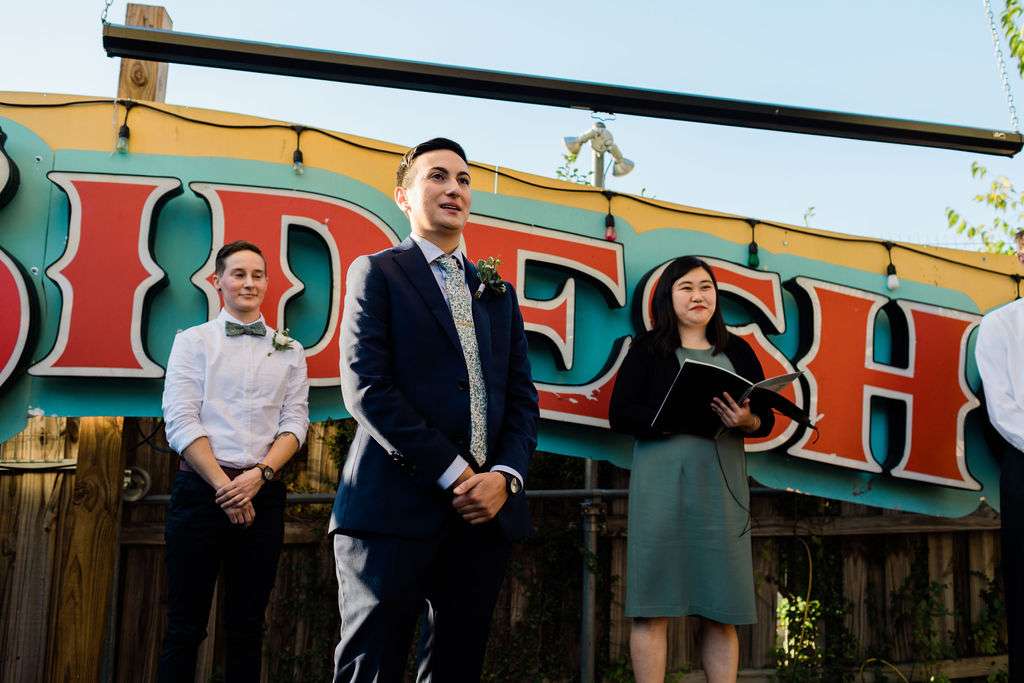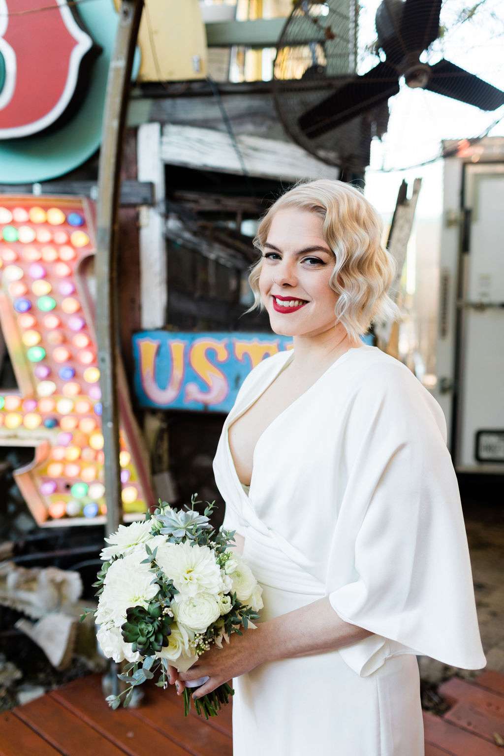 Most of the wedding was DIY, but since Spiderhouse isn’t a typical wedding venue, they brought in a co-ordinator to give a helping hand in getting the venue wedding ready. Their centrepieces were tea light candles and air plants, along with postcards of cool Austin staples as table names. They were fortunate that the venue didn’t need a lot of additional décor, and what they did bring in they patched together from craft stores, Facebook marketplace, and finds from their parents.
