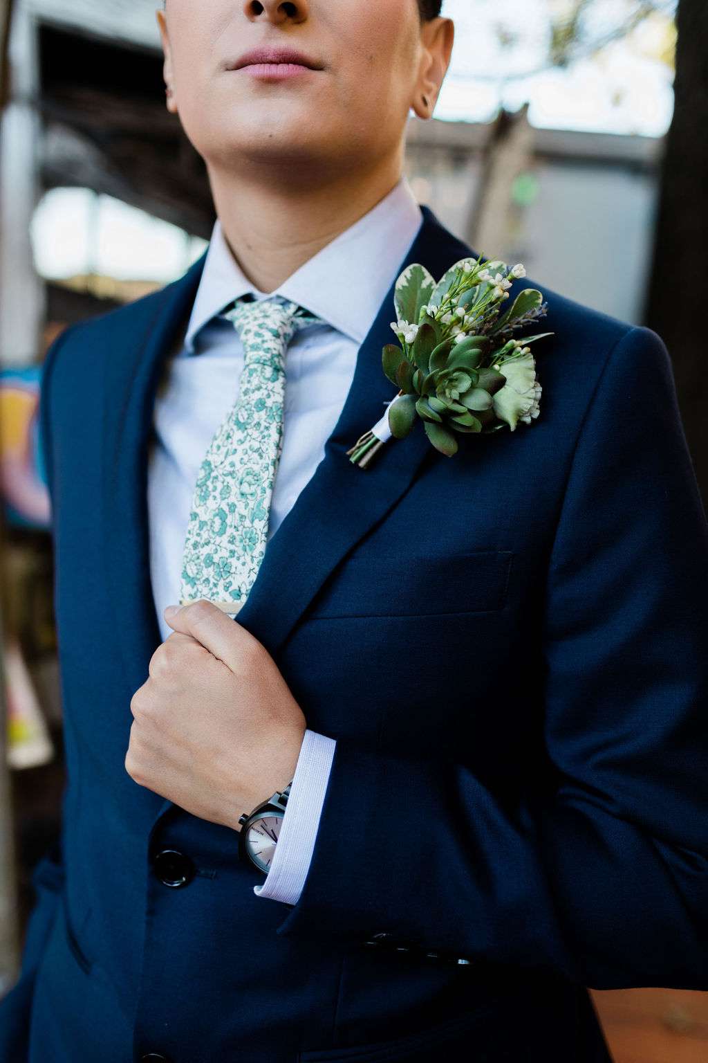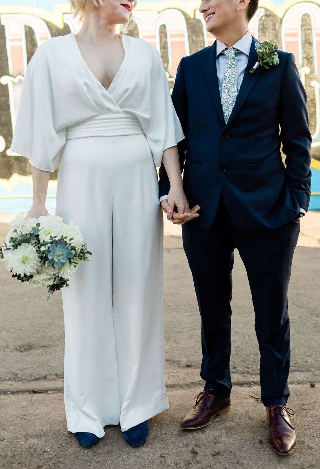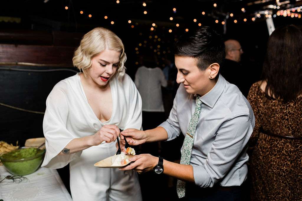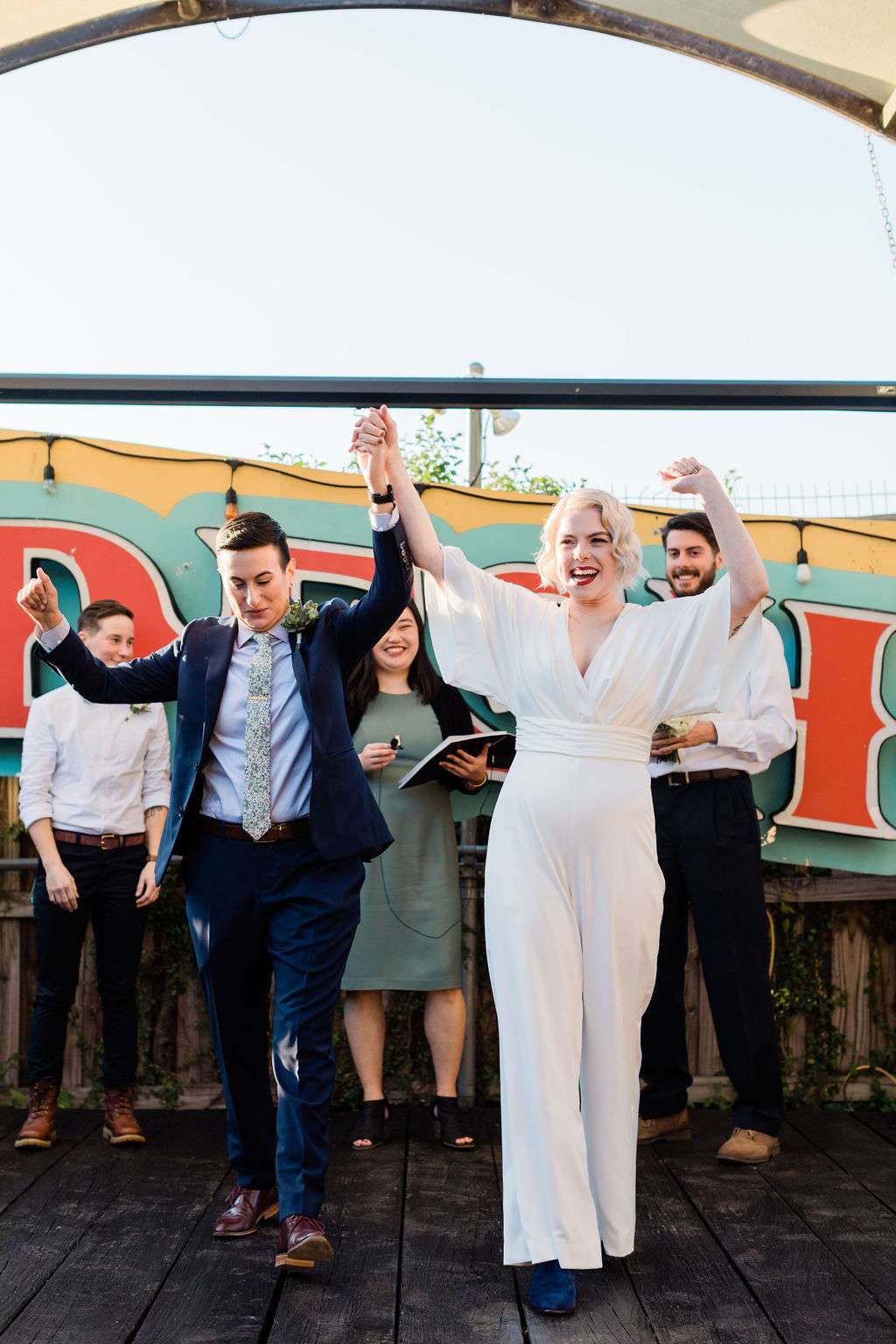Allyse wore a BHLDN jumpsuit with Opening Ceremony shoes for the ceremony, and changed into a Superdown romper and Modern Vice shoes for the reception. Ana rocked an Indochino suit. Their wedding party consisted of their ‘best humans’ and they just told them to wear navy trousers, a white shirt and green bow ties.