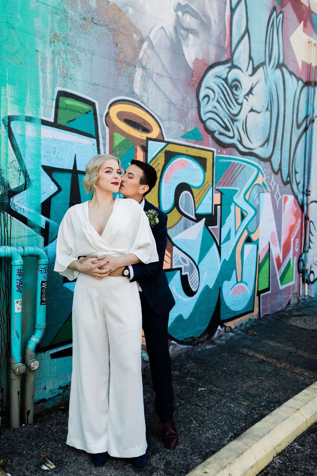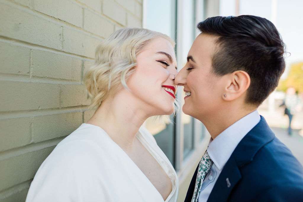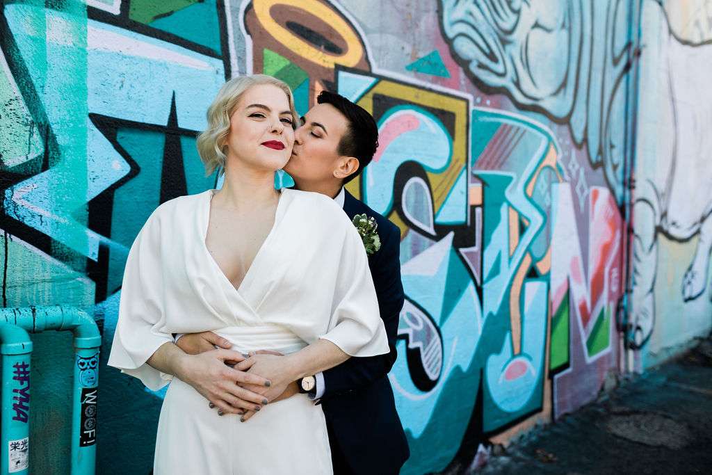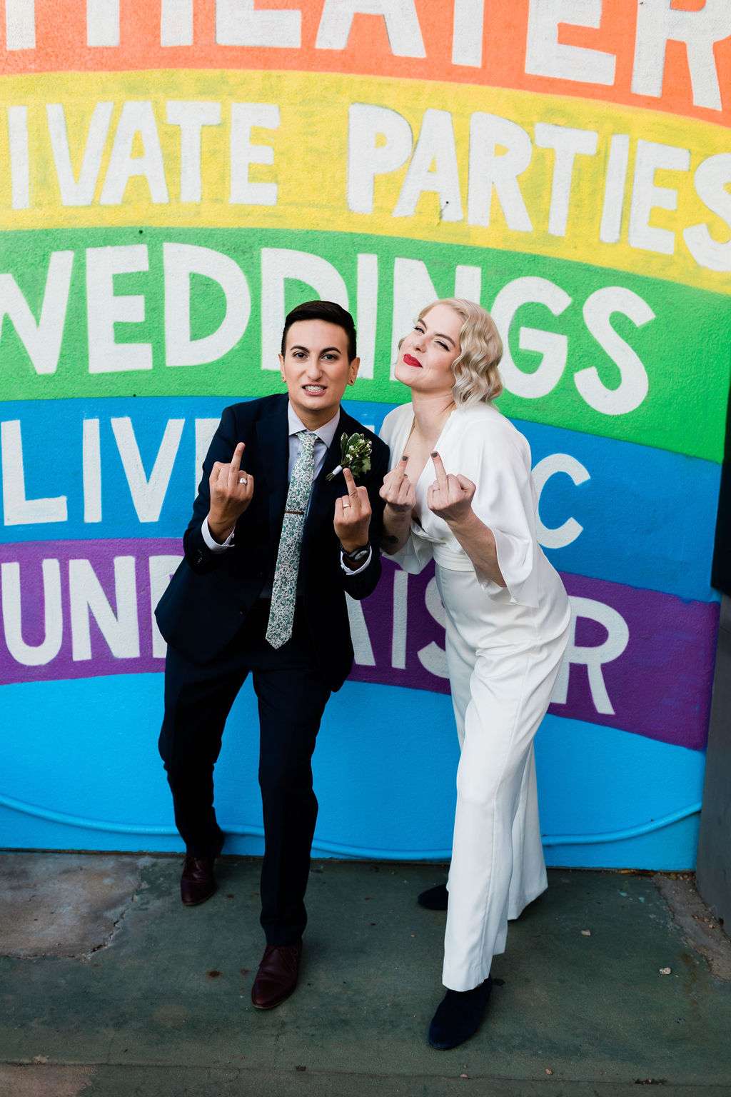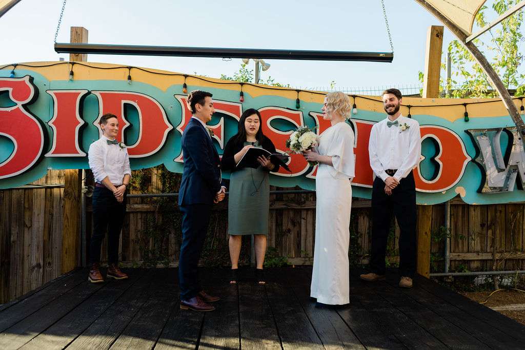 Allyse wore a BHLDN jumpsuit with Opening Ceremony shoes for the ceremony, and changed into a Superdown romper and Modern Vice shoes for the reception. Ana rocked an Indochino suit. Their wedding party consisted of their ‘best humans’ and they just told them to wear navy trousers, a white shirt and green bow ties.