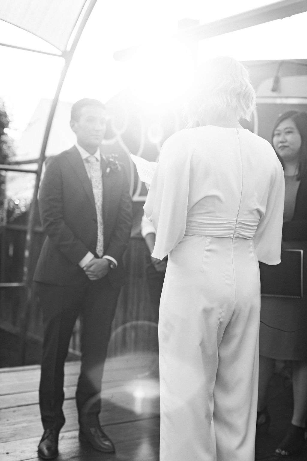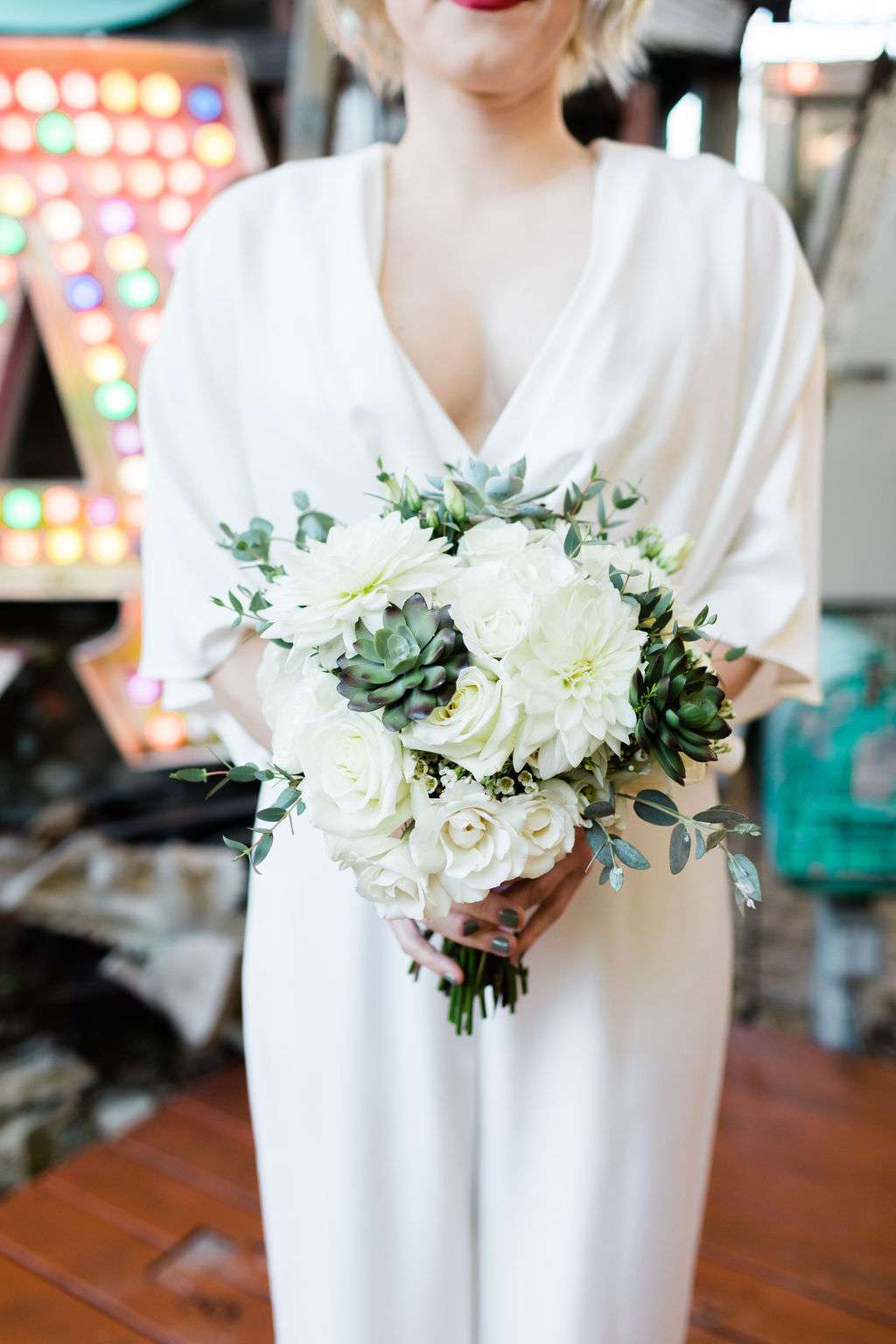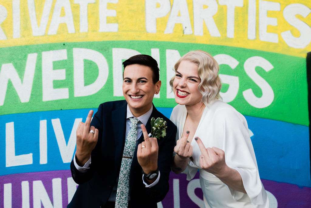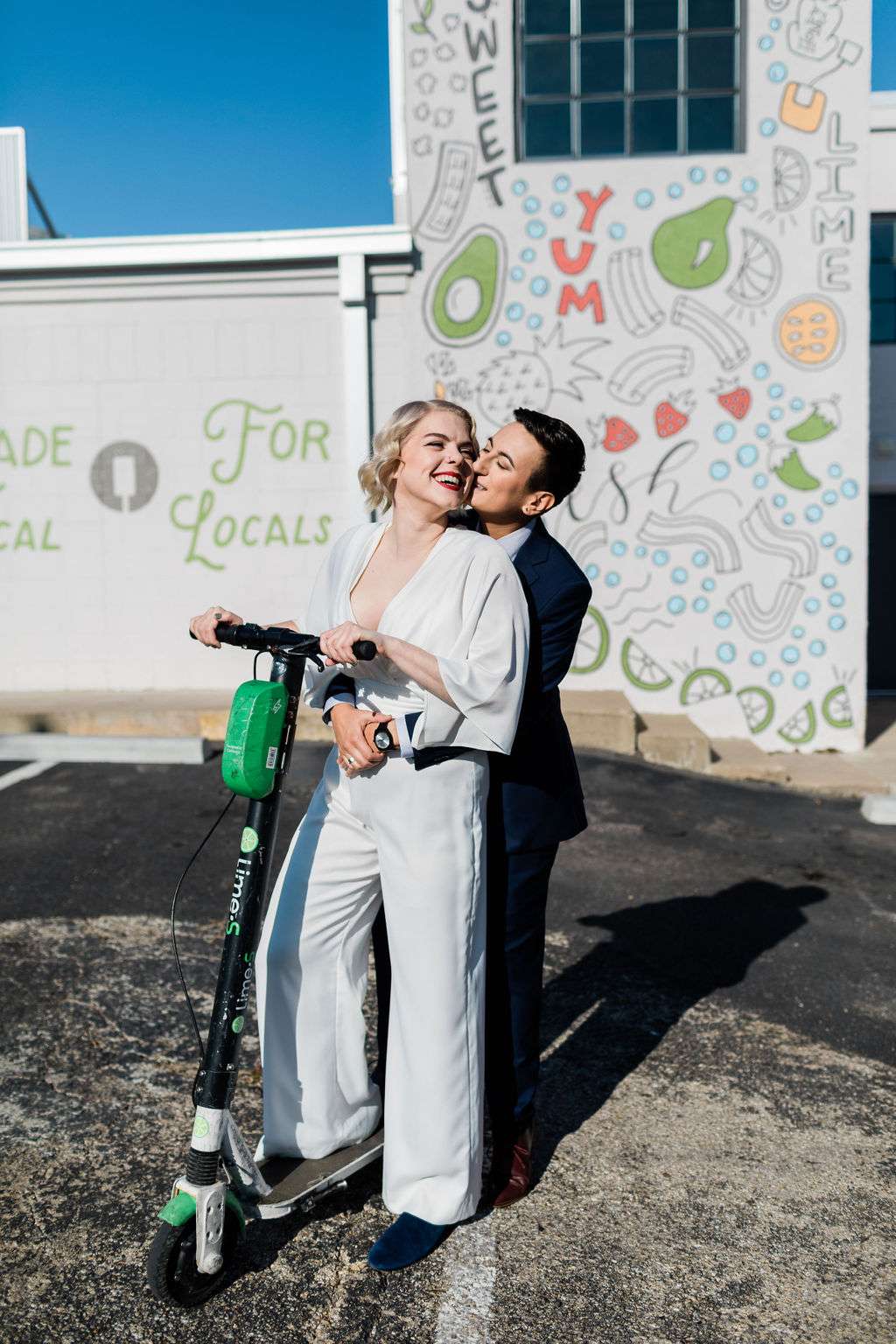 Allyse wore a BHLDN jumpsuit with Opening Ceremony shoes for the ceremony, and changed into a Superdown romper and Modern Vice shoes for the reception. Ana rocked an Indochino suit. Their wedding party consisted of their ‘best humans’ and they just told them to wear navy trousers, a white shirt and green bow ties.
