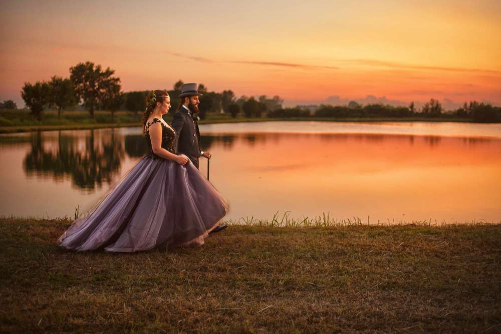 One of the most unique elements about the day was that the bride chose to wear black in the form of a black lace and layered tulle gown from Clara Couture and she paired it with a matching black veil. The groom wore a deep blue damask suit with a walking stick and a top hat!