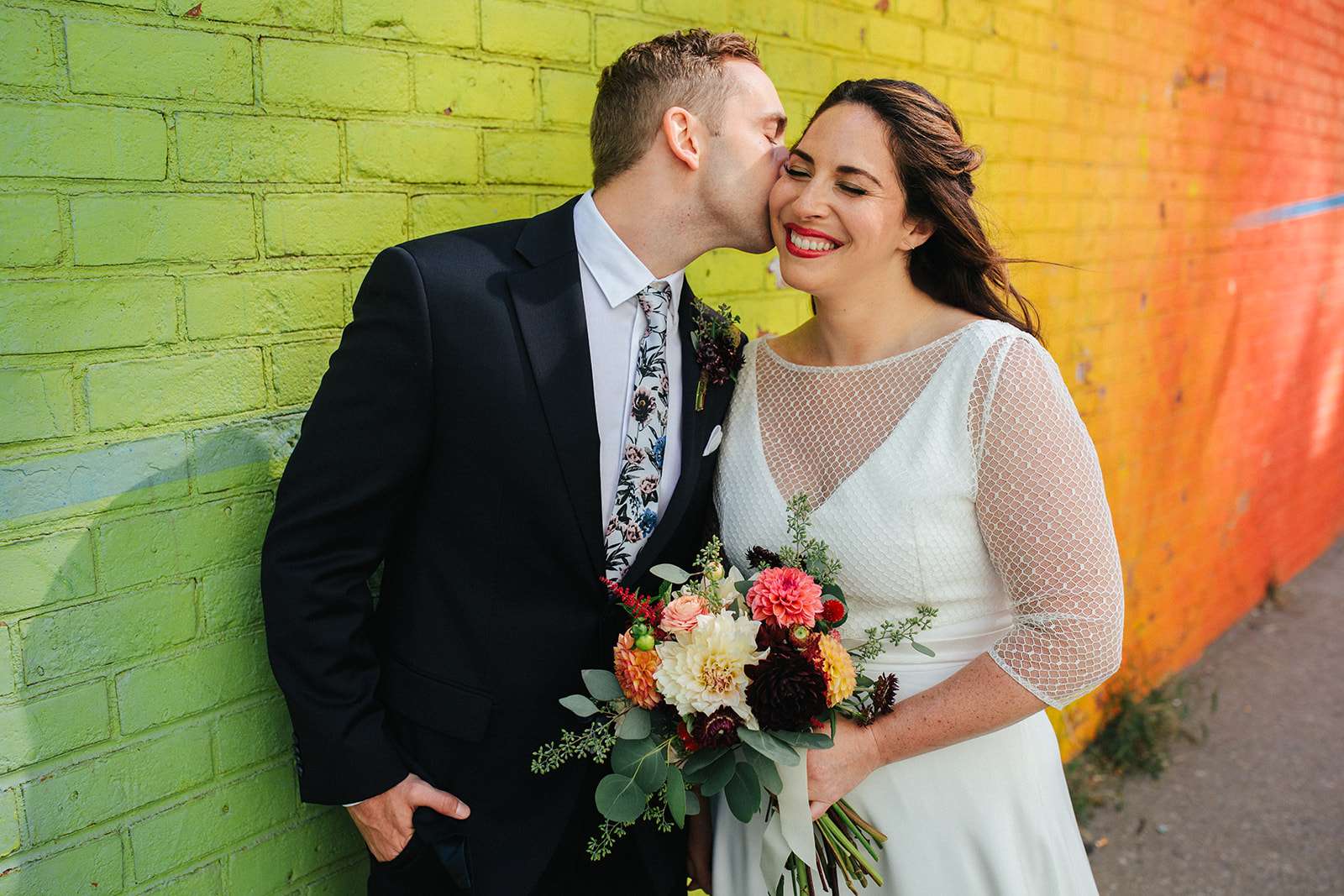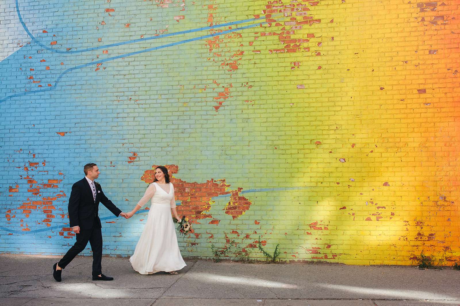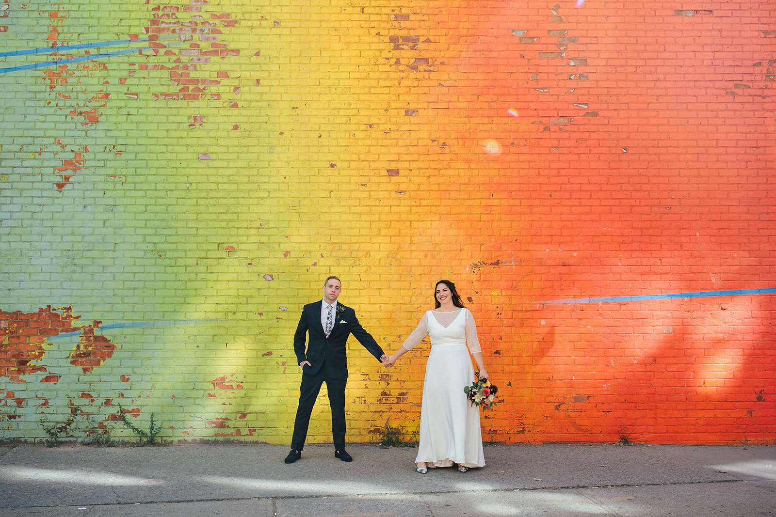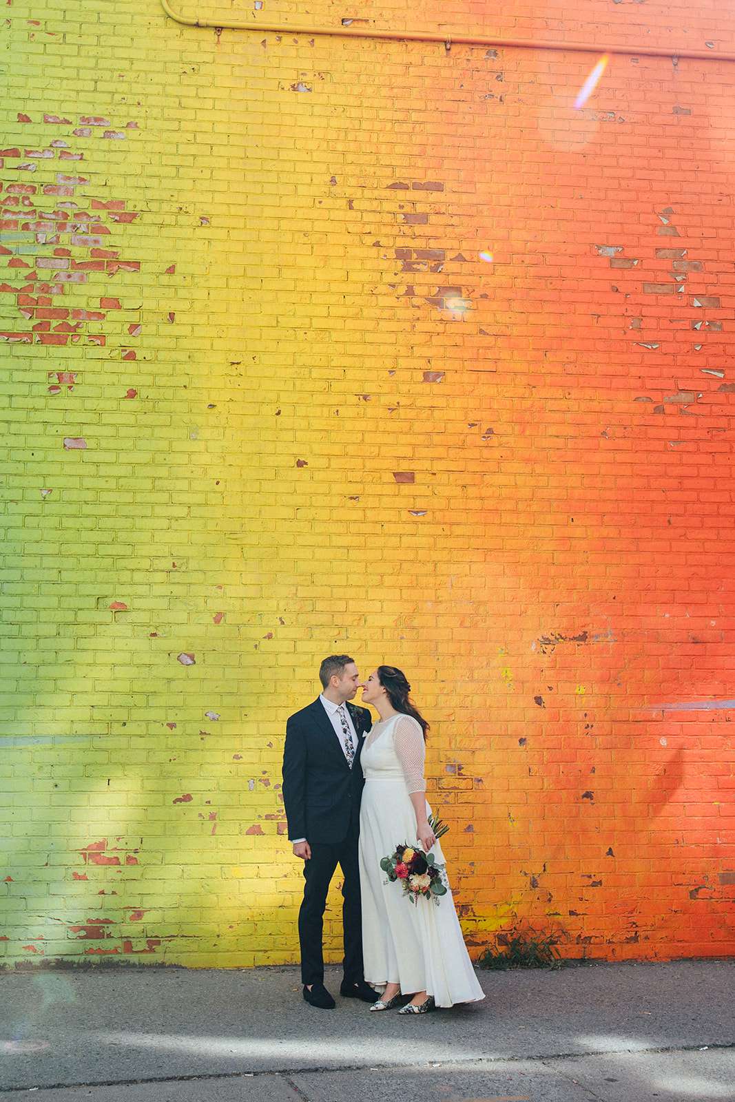 When American Lara and British Kevin got married at NYC city hall last September, they essentially planned their pre-ceremony photo shoot around the incredible rainbow wall in DUMBO, Brooklyn. Lara has a popular Instagram account where she bakes, tastes and photographs rainbow food and baked goods so having a rainbow element to their day was a non-negotiable!
