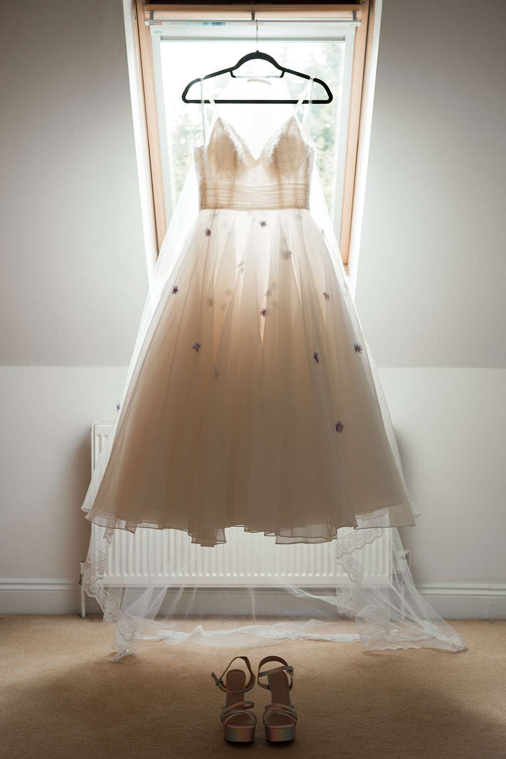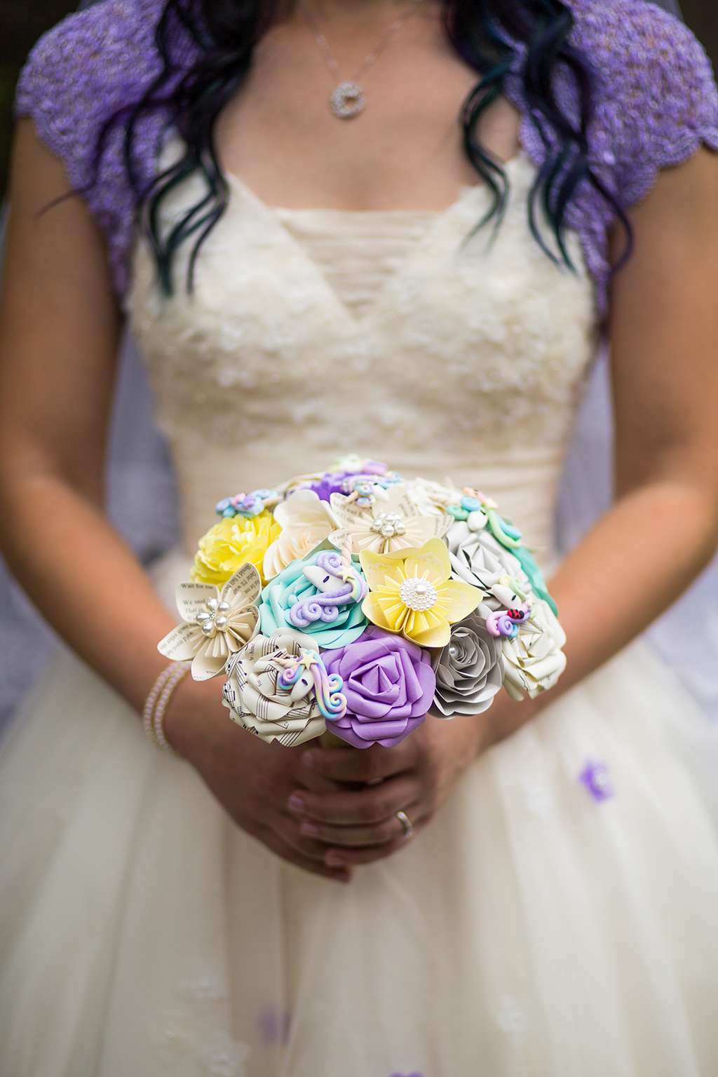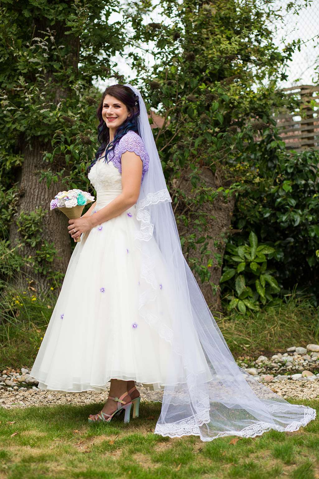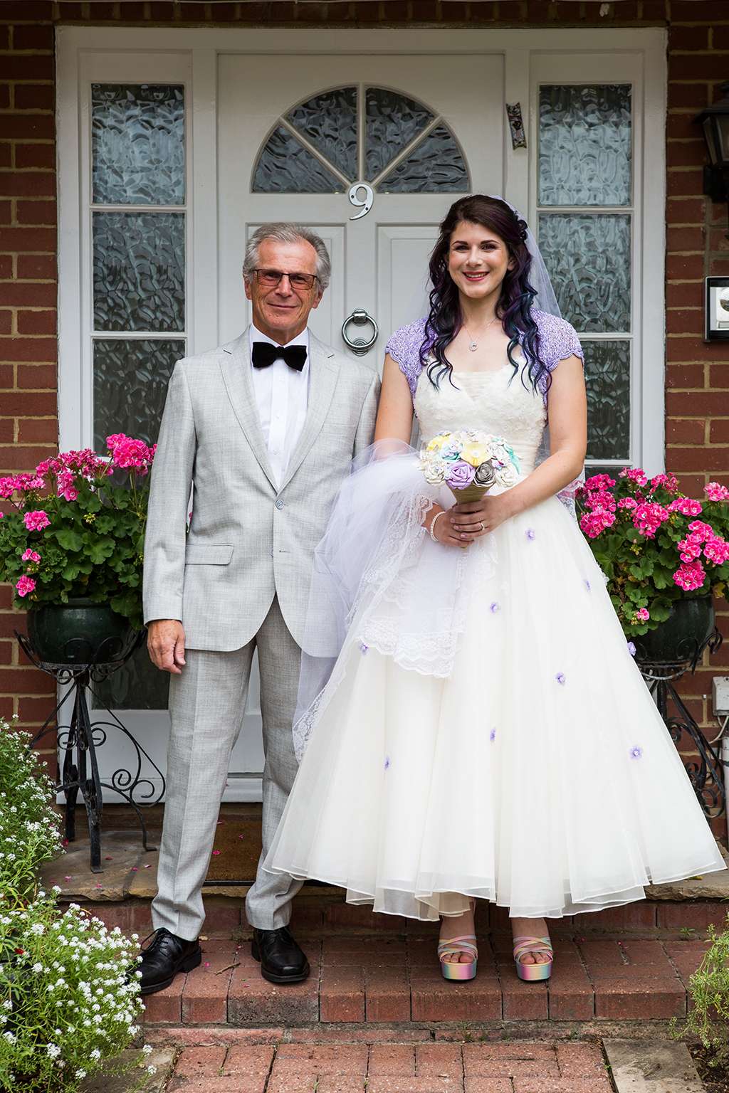 Emma chose a Fairy Goth Mother tea length dress, which she paired with Dolls Kill shoes for the ceremony, and Irregular Choice for the reception. She also wore her mum’s veil from her wedding in 1982, which was a personal touch. The bridesmaids wore a rainbow of pastel dresses from ASOS and she had her hair coloured especially for the day at Not Another Salon.