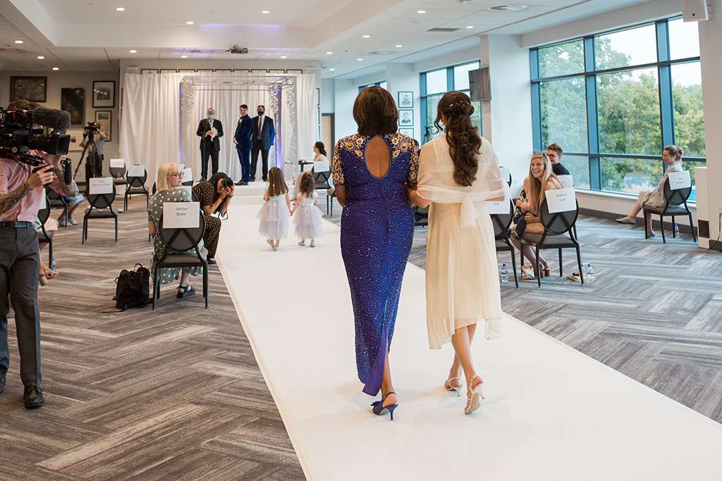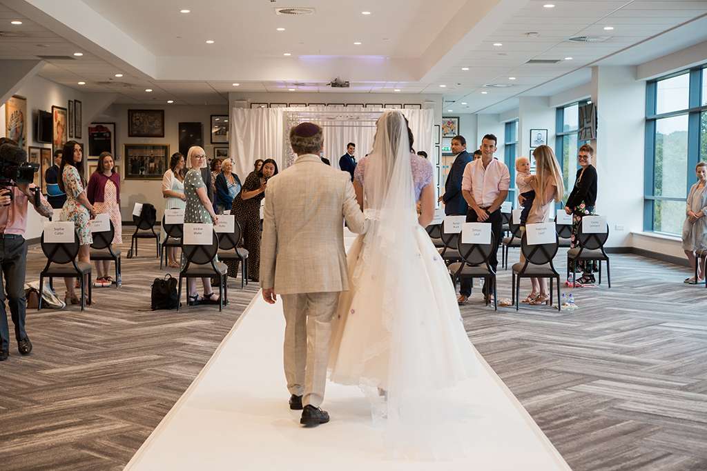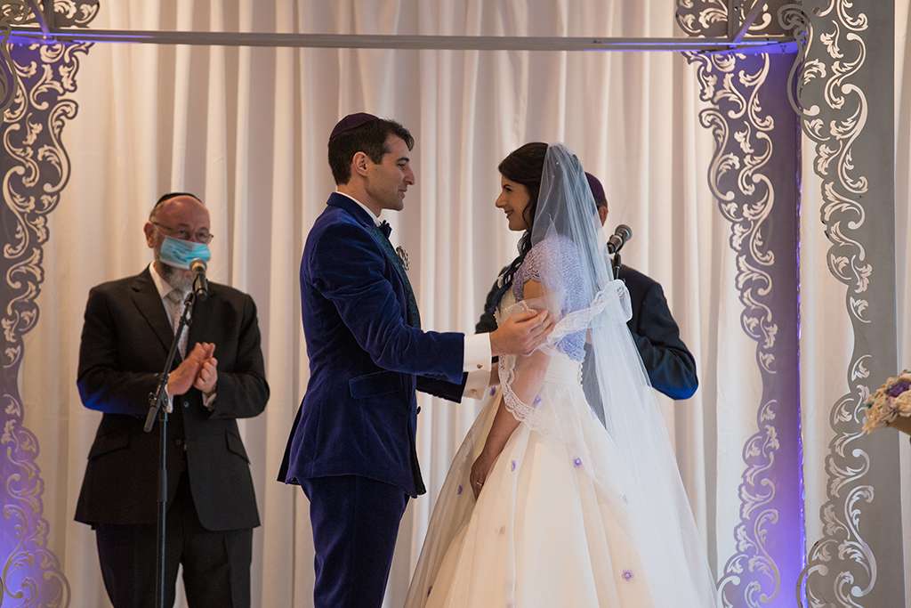 Sela met Emma halfway down the aisle, lowered her veil, and they then walked to underneath the chuppah together. “The wedding canopy or ‘chuppah’ is a special part of the ceremony and represents the home we will build together. Our canopy had been a wedding present from my grandma, and we were so lucky she could be there on the day, as the first time she’d gone out since the start of the pandemic as she is in a very vulnerable group as a lung-cancer survivor. Sela’s grandma sadly passed away shortly after we got engaged, but before she did, she gifted us a quilt she had made with a hand-written message wishing us a happy life together. This quilt formed the canopy of our chuppah, so both our maternal grandmothers contributed to our wedding canopy which I think is a lovely symbol of their wisdom that we will take with us into our future home and lives.”