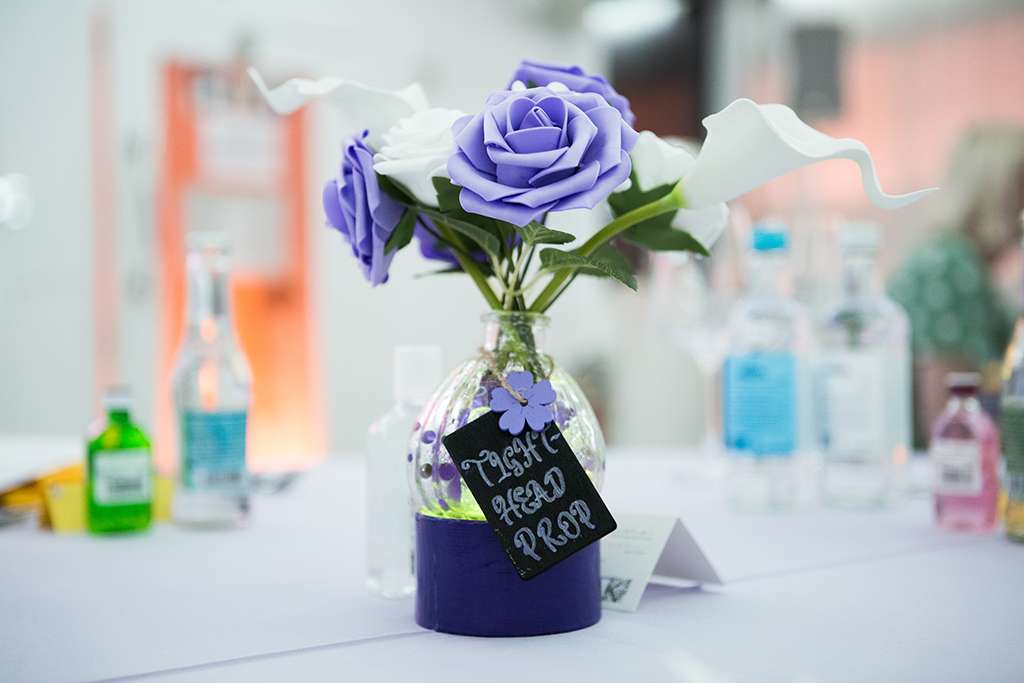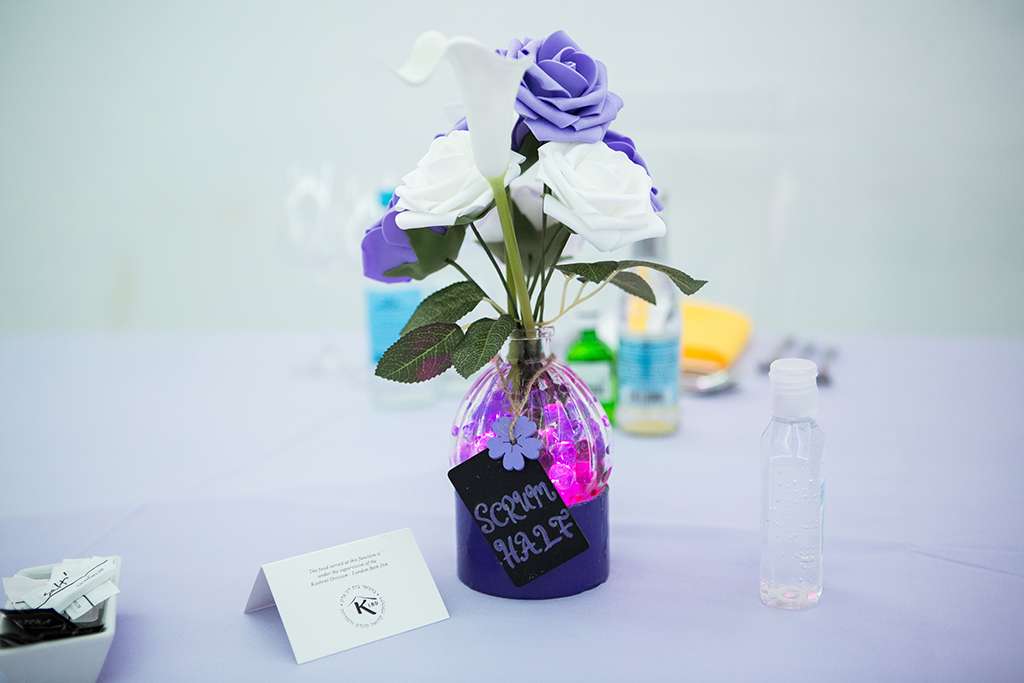 Emma designed and made the centrepieces for the dinner with miniature vases, chalk boards, fake flowers and LED lights. She also hand wrote all the place names and created welcome signs. Their tables were named after rugby moves, and arranged like positions on the rugby pitch.