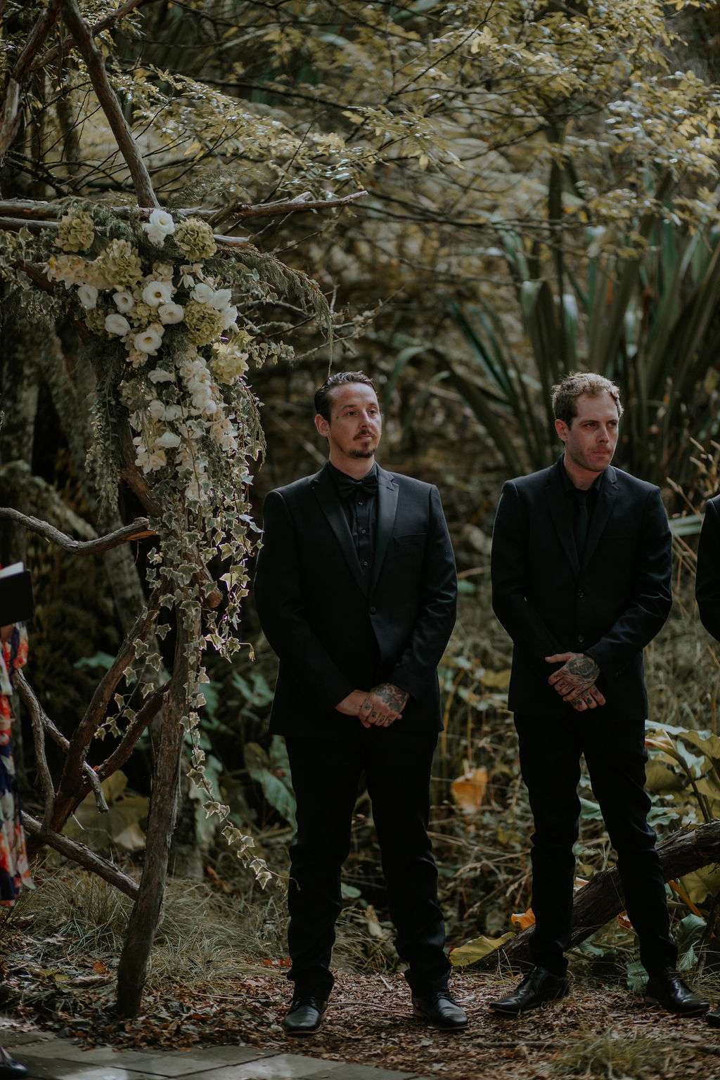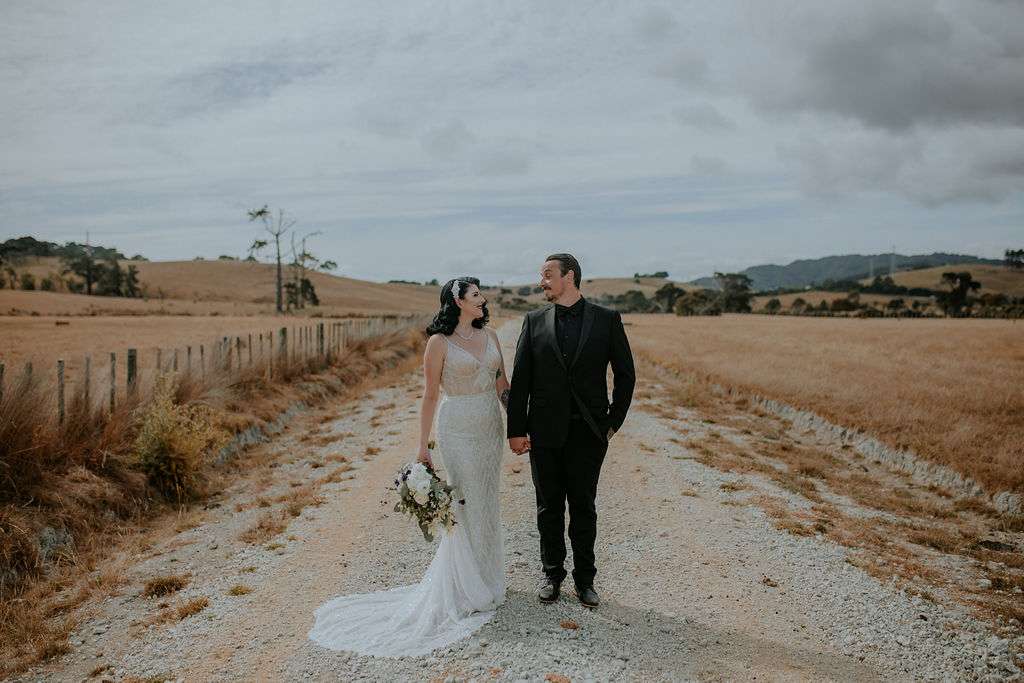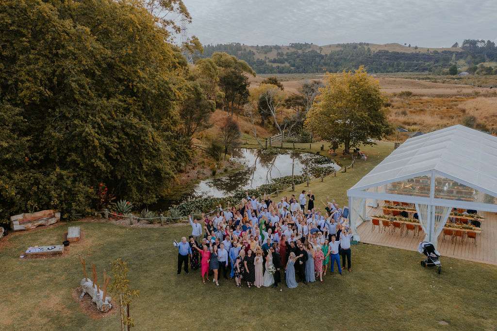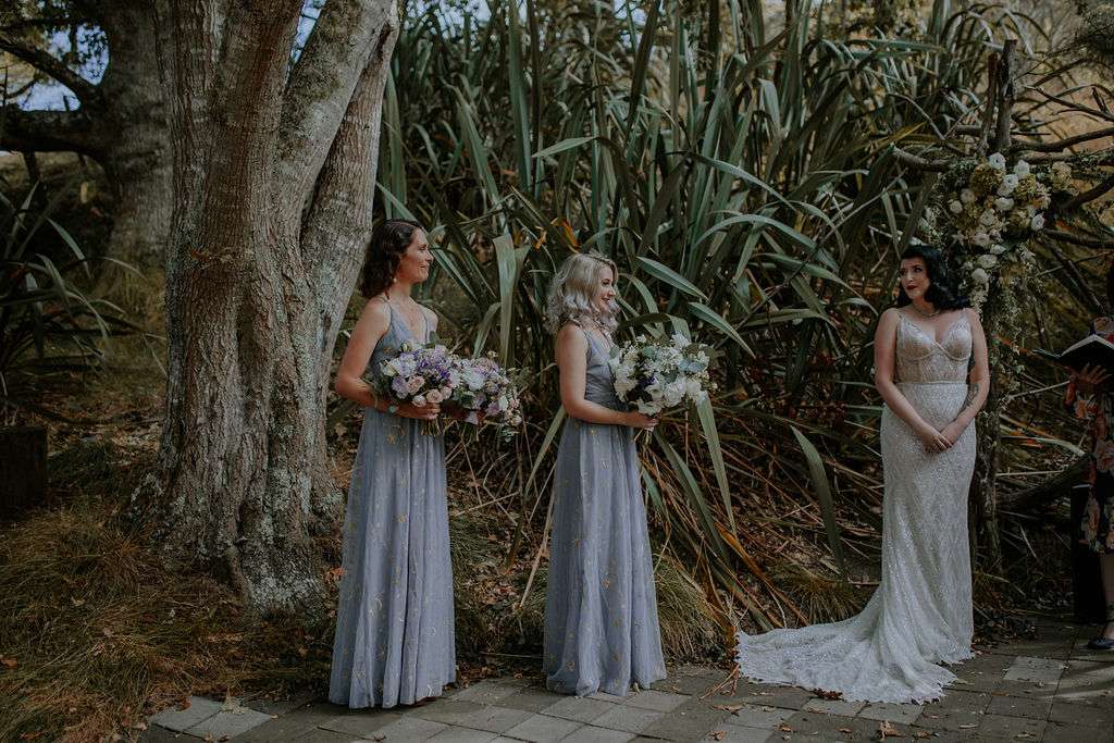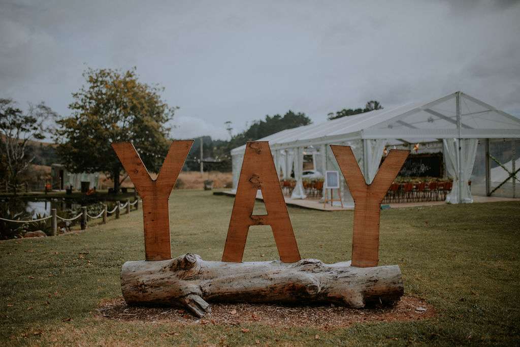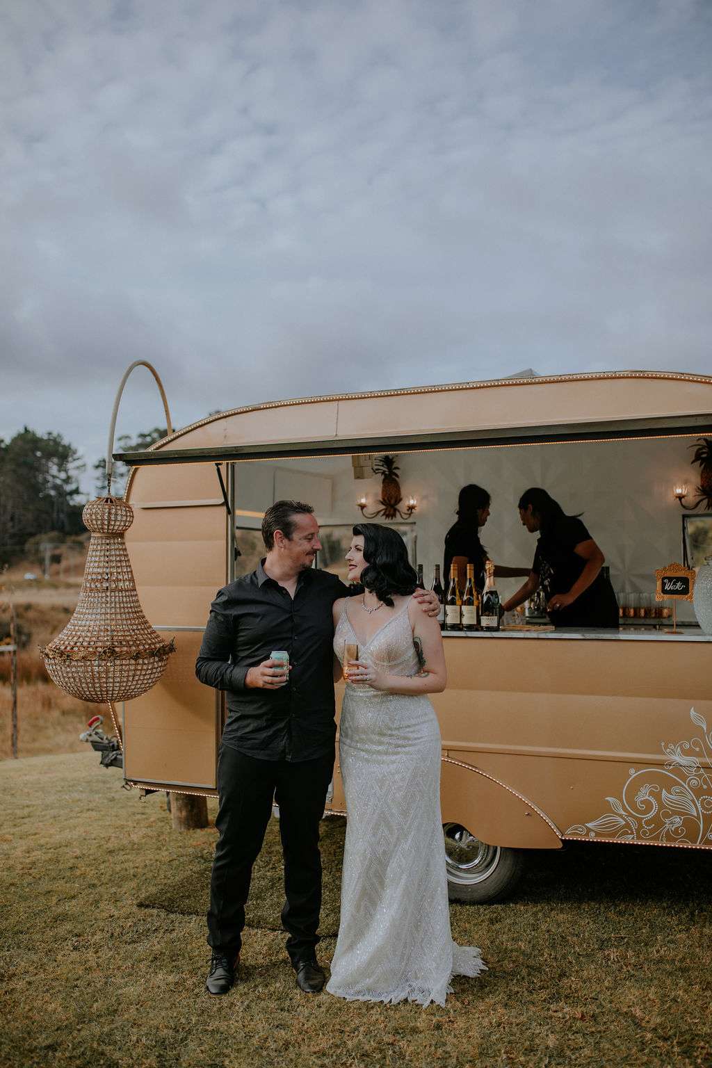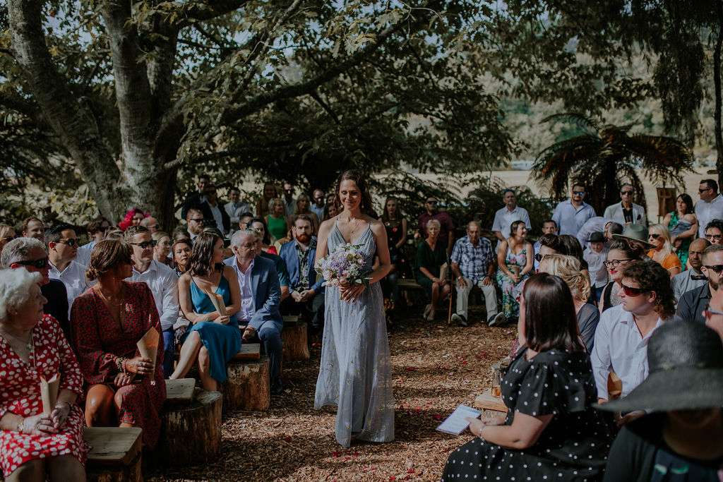 They began their planning by nailing their venue; after a few viewings, they settled on Waterfall Farm near Auckland, falling for it’s fairy-tale worthy ceremony area and the fact that the venue allowed food trucks. They hired a nearby homestead for the weekend as a base for the bridal party, and added bell tents to the grounds for those that wanted to stay over. They weren’t concerned about sticking to strict wedding traditions; seeing each other while getting ready and for a first look before the ceremony. “It was so nice to be together before the ceremony, it helped calm our nerves and made the whole day about us instead of being separated for part of the day. When it was time to put on my dress, we did a ‘first look’ out in the garden with no one else around which felt so special.”