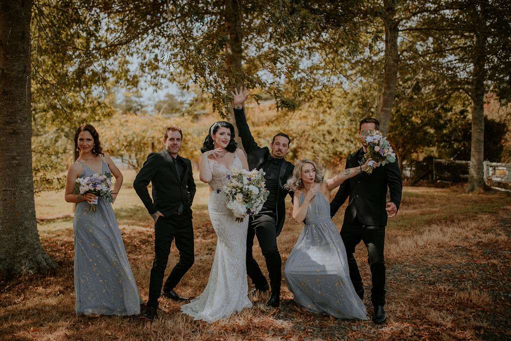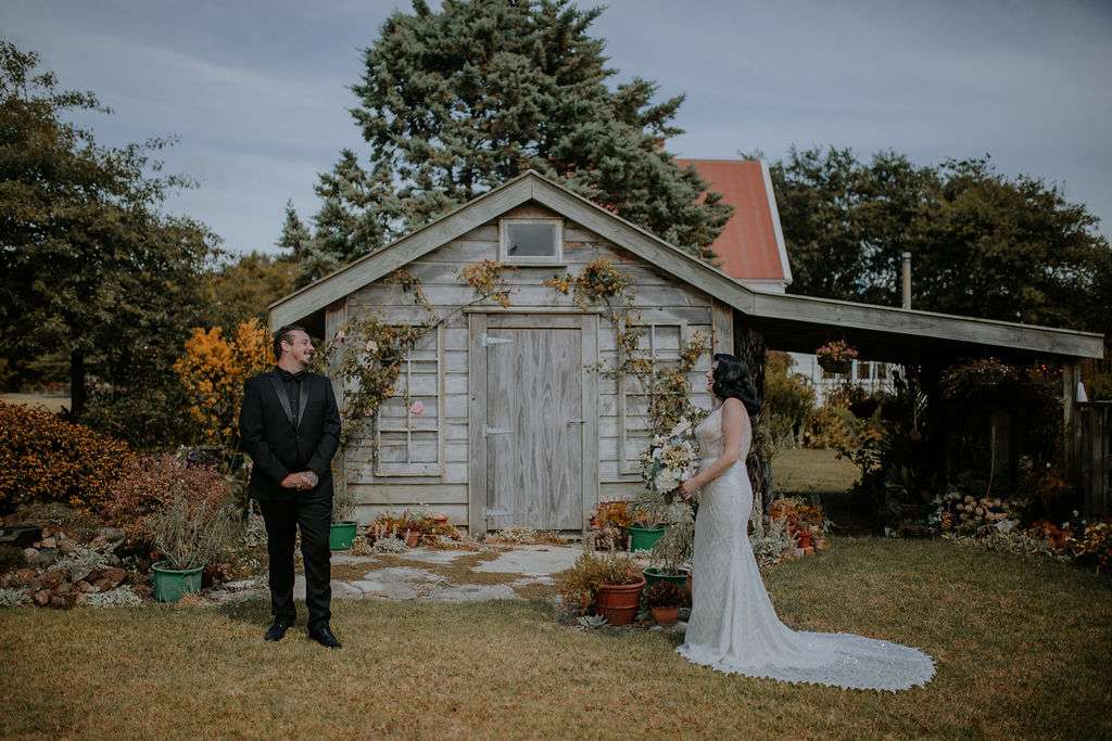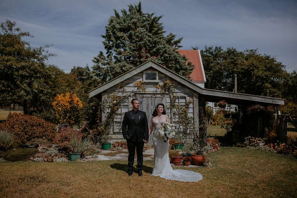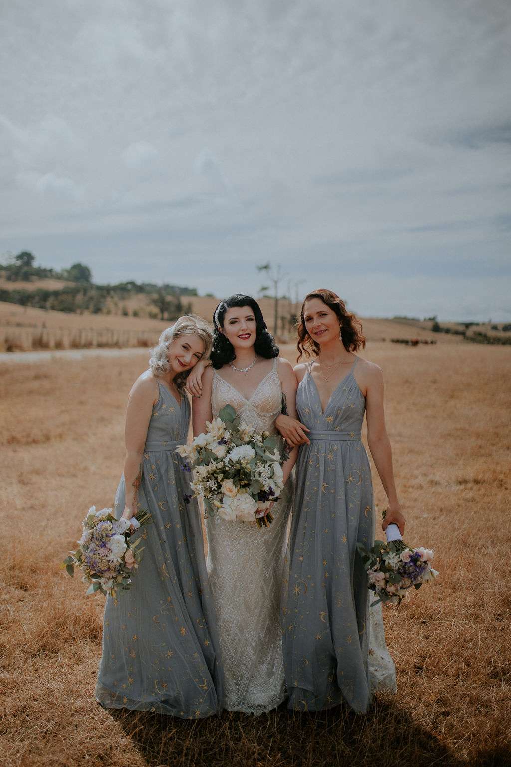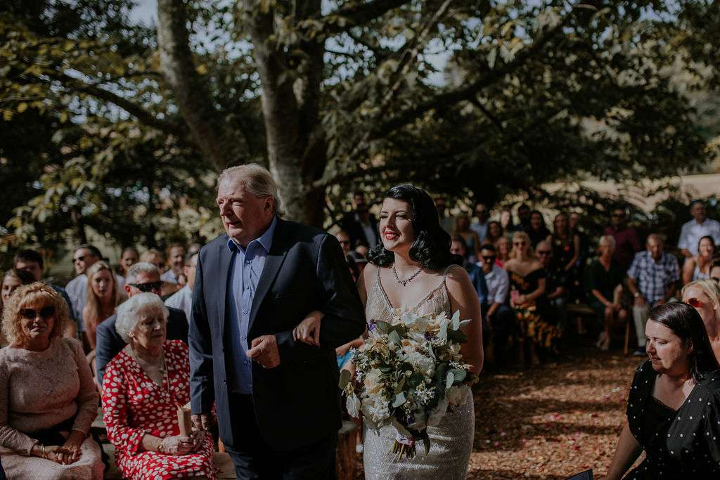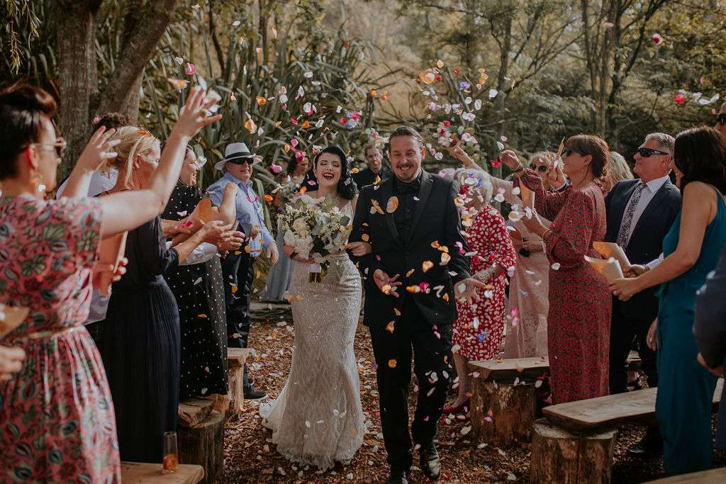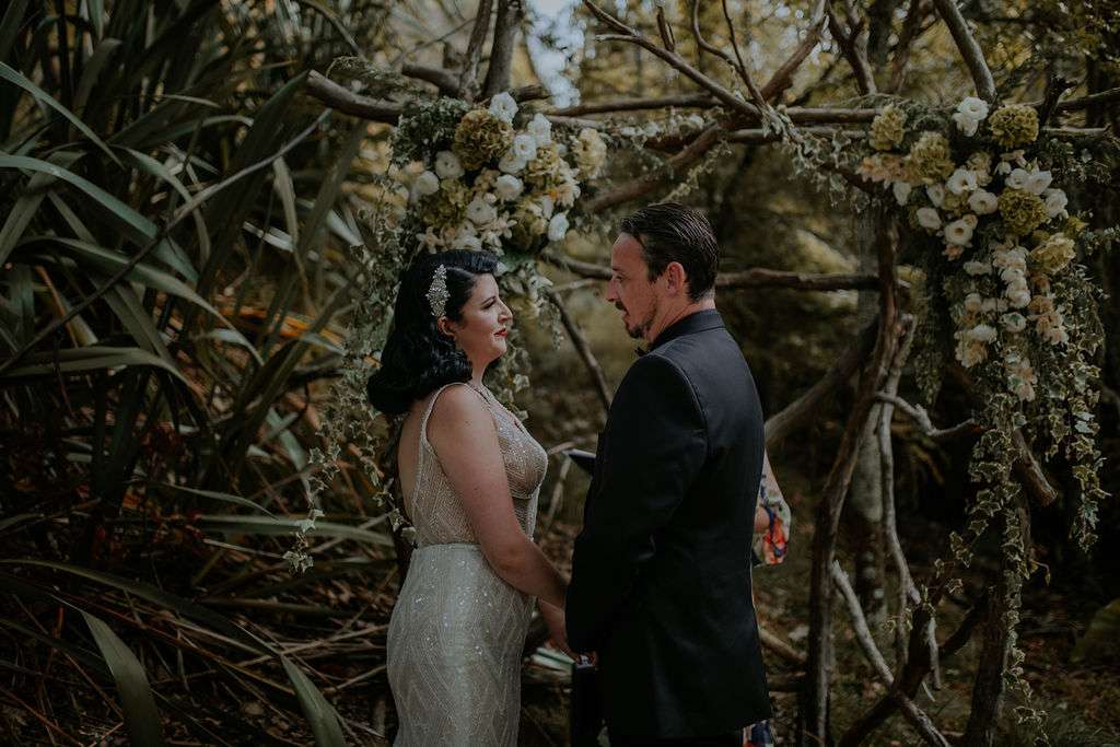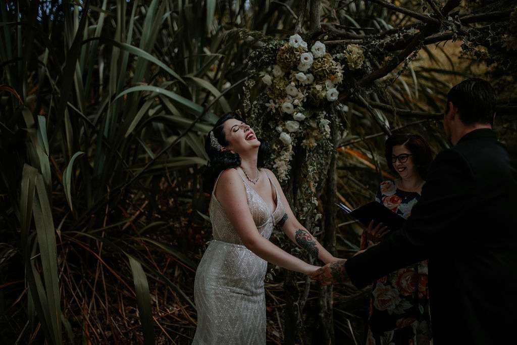 They began their planning by nailing their venue; after a few viewings, they settled on Waterfall Farm near Auckland, falling for it’s fairy-tale worthy ceremony area and the fact that the venue allowed food trucks. They hired a nearby homestead for the weekend as a base for the bridal party, and added bell tents to the grounds for those that wanted to stay over. They weren’t concerned about sticking to strict wedding traditions; seeing each other while getting ready and for a first look before the ceremony. “It was so nice to be together before the ceremony, it helped calm our nerves and made the whole day about us instead of being separated for part of the day. When it was time to put on my dress, we did a ‘first look’ out in the garden with no one else around which felt so special.”
