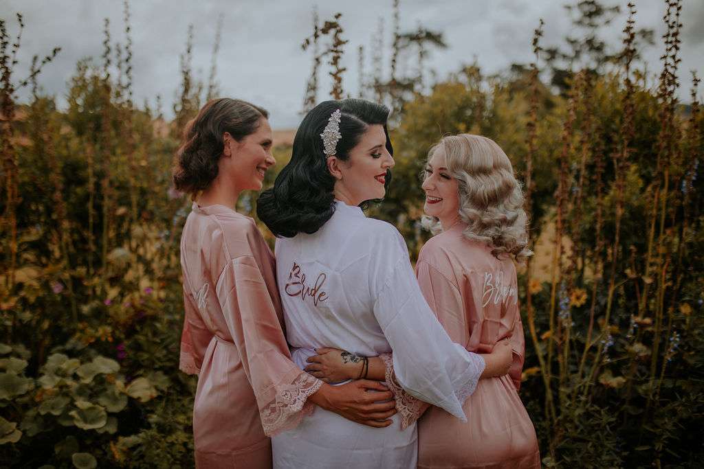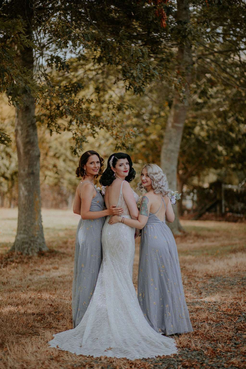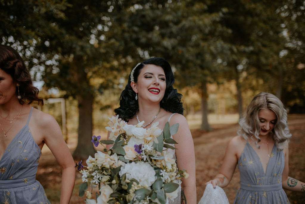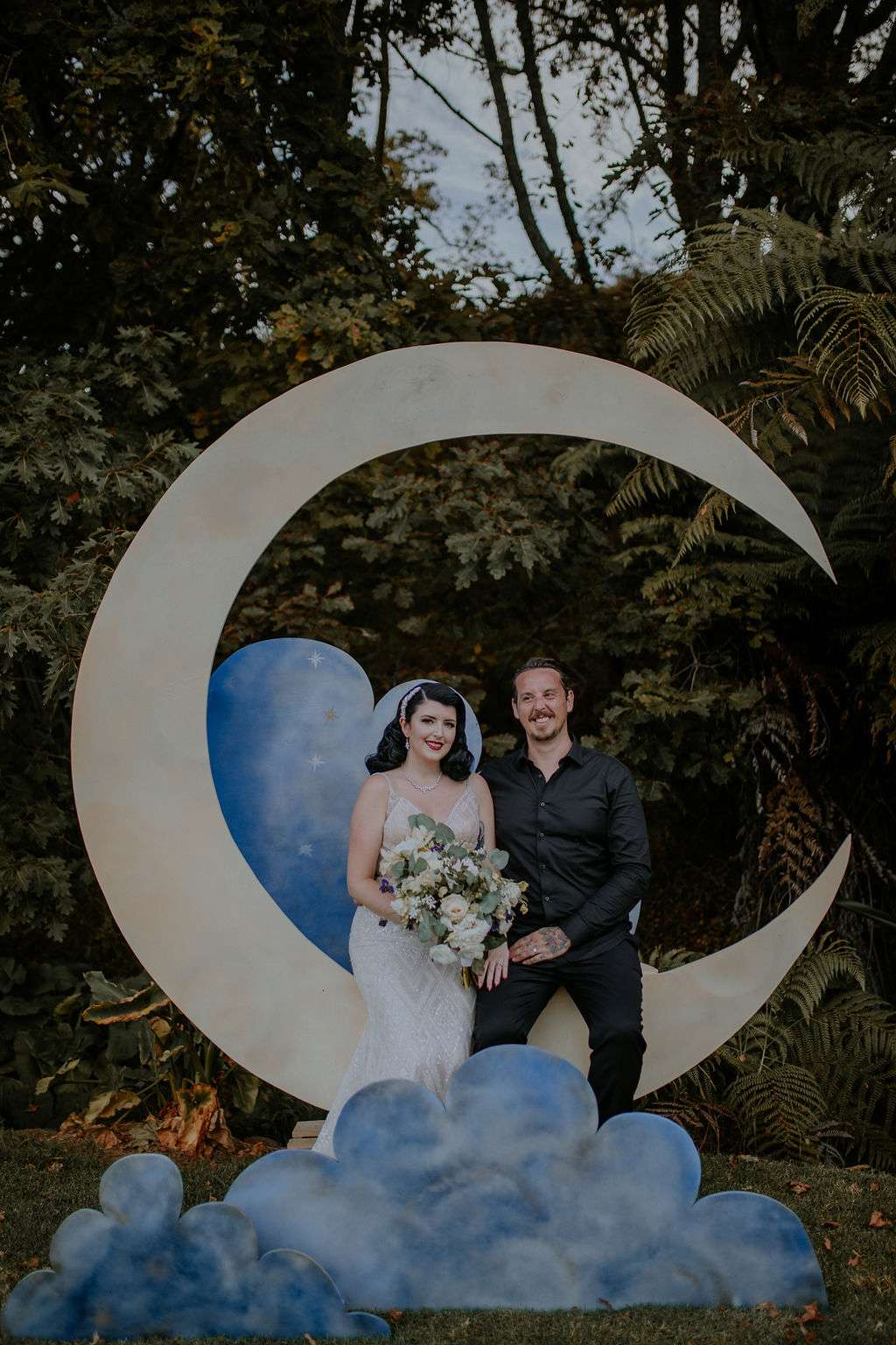 When it came to planning their February 2020 nuptials, the couple knew they wanted a laid-back, outdoor wedding in the middle of summer with lots of greenery, foliage and being amongst the trees. “We wanted something quite whimsical,” Jamiee continued, “but with a nod to the 1920’s, seeing as we got married in 2020!” They combined star lanterns in with the foliage and hundreds of fairy lights, and a big half-moon photo booth tied the two themes together. The bridesmaid dresses tied into this two, with star embroidery, and they paired them with celestial accessories. “I wanted to feel like a vintage, Hollywood starlet, seeming I love to dress in vintage/pinup style.”