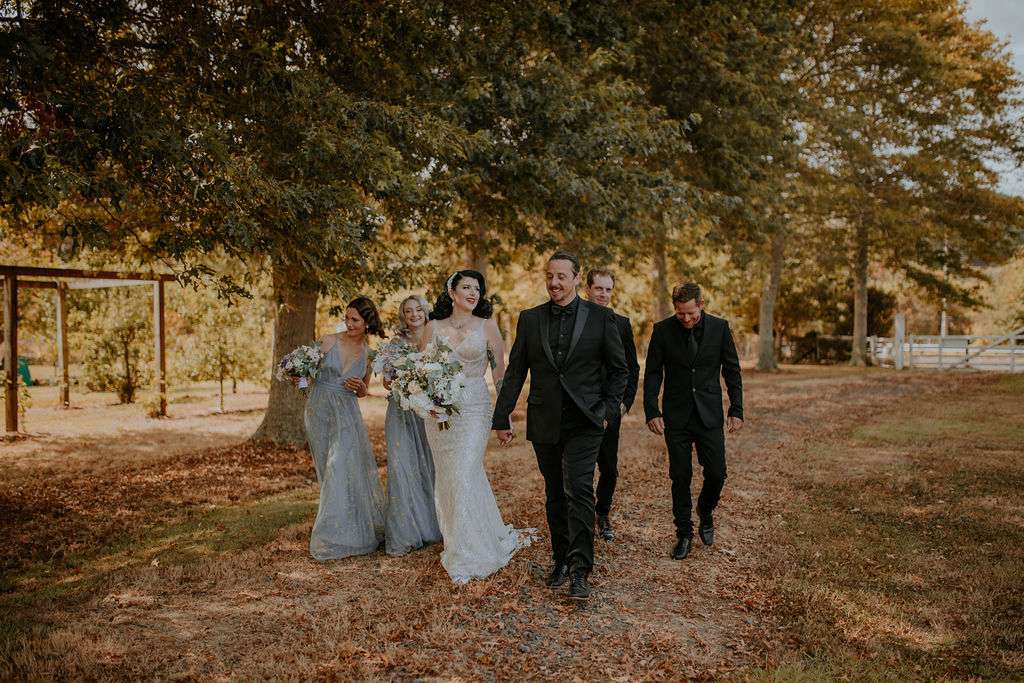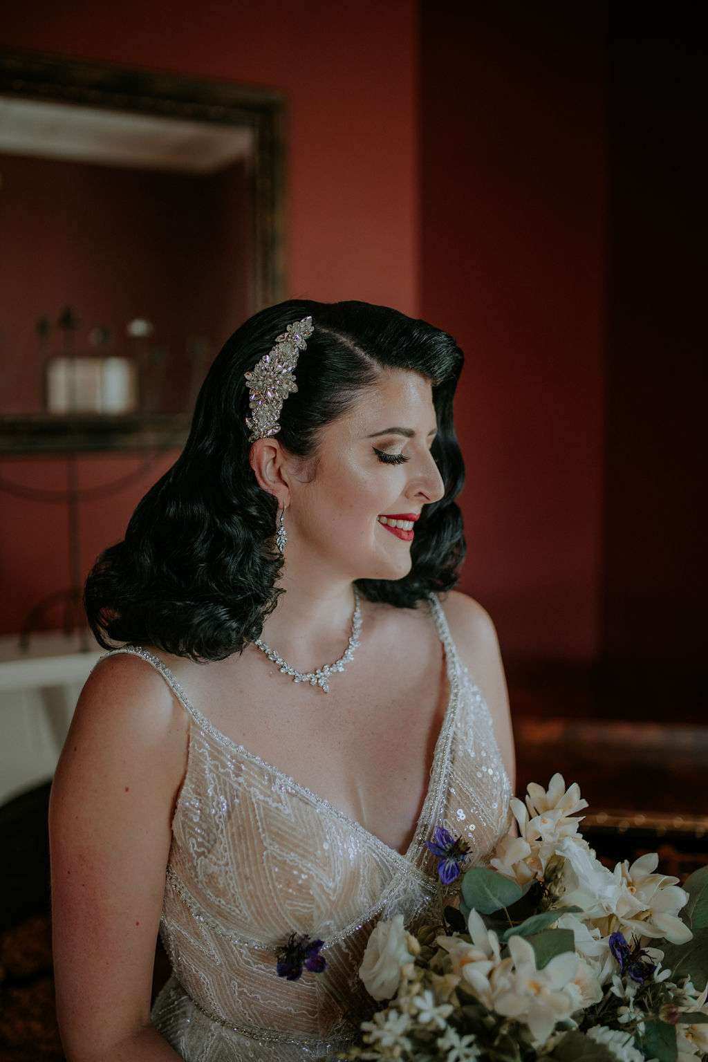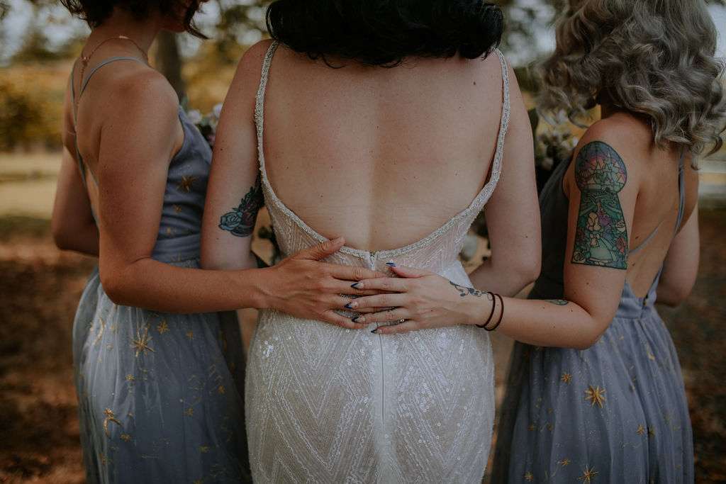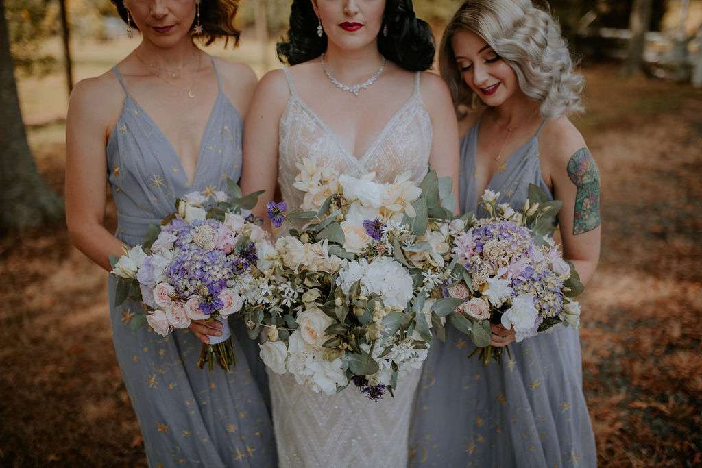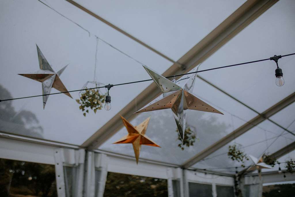 When it came to planning their February 2020 nuptials, the couple knew they wanted a laid-back, outdoor wedding in the middle of summer with lots of greenery, foliage and being amongst the trees. “We wanted something quite whimsical,” Jamiee continued, “but with a nod to the 1920’s, seeing as we got married in 2020!” They combined star lanterns in with the foliage and hundreds of fairy lights, and a big half-moon photo booth tied the two themes together. The bridesmaid dresses tied into this two, with star embroidery, and they paired them with celestial accessories. “I wanted to feel like a vintage, Hollywood starlet, seeming I love to dress in vintage/pinup style.”