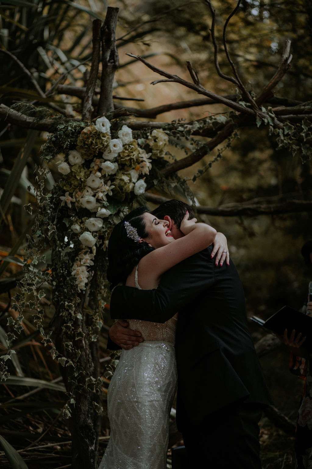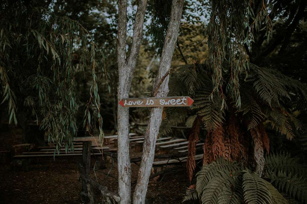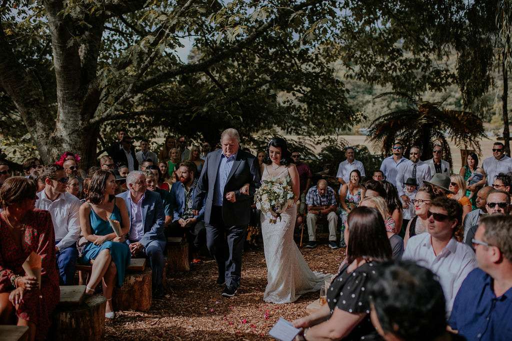 Their ceremony was set amongst over hanging willow trees and the guests sat on logs in the clearing. Jamiee walked in to an acoustic version of Northern Wind by City and Colour. They’d planned to exchange personalised vows, but ended up doing so in whispers. “During the ceremony, our celebrant said ‘now it’s time for the bride and groom to say their vows silently to each other’, which took me my surprise. Logan then whispered to me ‘I’ve lost my vows so I’m going to make them up on the spot and I don’t want anyone else to hear.’ I couldn’t help but laugh!”