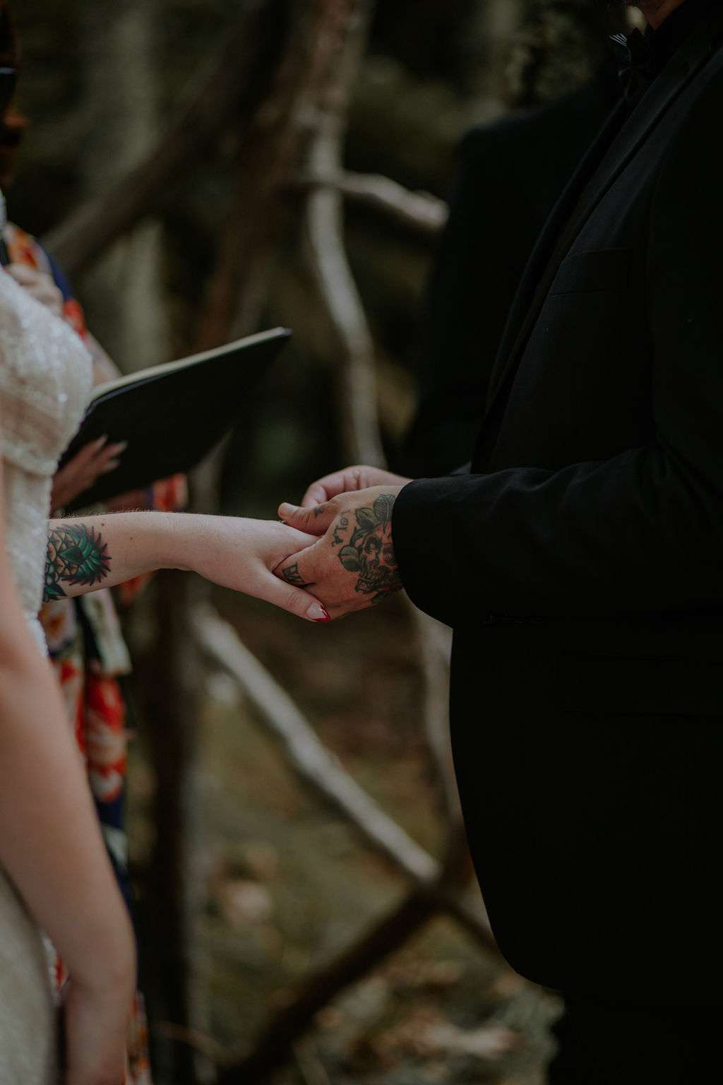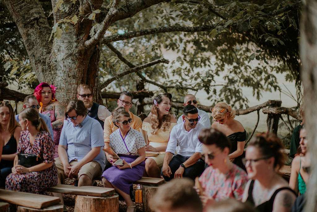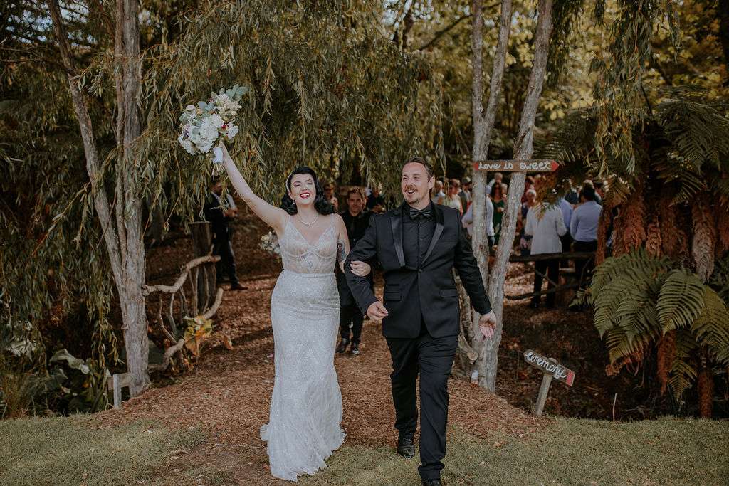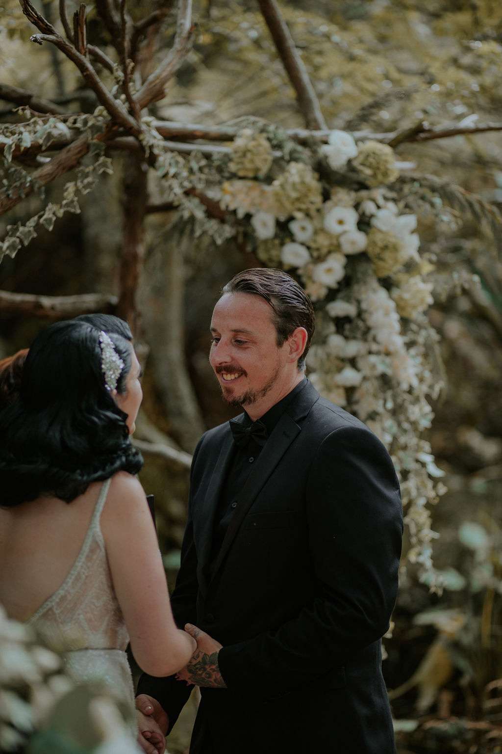 Their ceremony was set amongst over hanging willow trees and the guests sat on logs in the clearing. Jamiee walked in to an acoustic version of Northern Wind by City and Colour. They’d planned to exchange personalised vows, but ended up doing so in whispers. “During the ceremony, our celebrant said ‘now it’s time for the bride and groom to say their vows silently to each other’, which took me my surprise. Logan then whispered to me ‘I’ve lost my vows so I’m going to make them up on the spot and I don’t want anyone else to hear.’ I couldn’t help but laugh!”