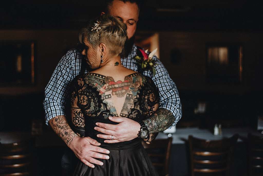 They gave themselves a deadline to have something planned for before their 11th anniversary. Originally they’d planned to do something outdoors, but as the weekend drew closer, it ended up being cold and everything was muddy from melting snow. The day before their celebration, they found a private restaurant that said they could use a private room in the morning before they opened to the public. On the morning of, Alicia headed off to get her hair and makeup done, before getting changed in the bathroom stall at the restaurant. She chose a black dress, as she feels comfortable in black in her day-to-day life, so it was a no brainer for her.