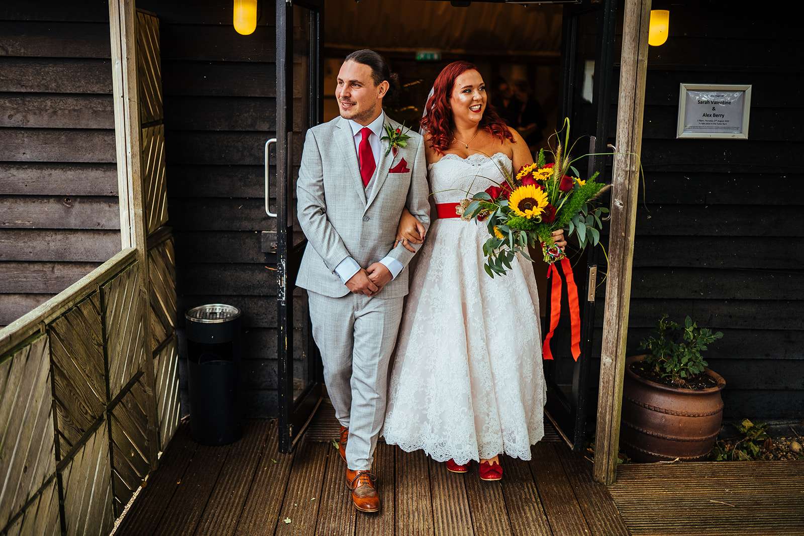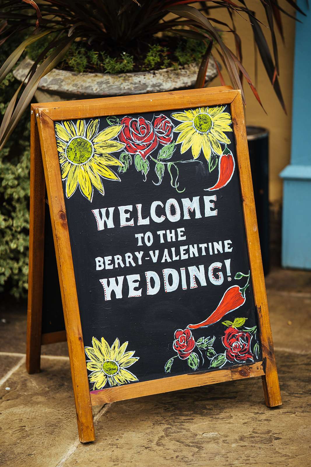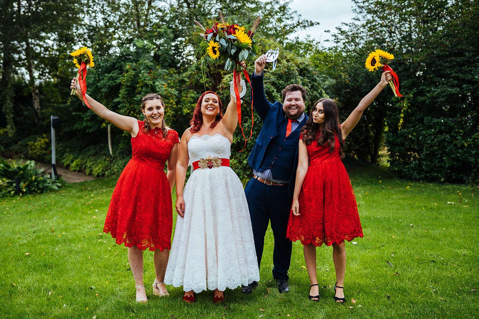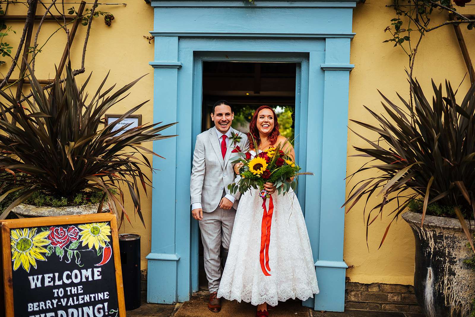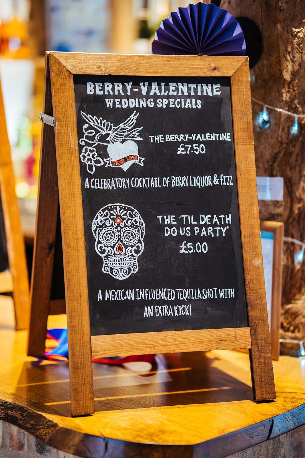 Even their new married name got the custom treatment – they combined their surnames to create a new, double-barrelled one, and then based their custom cocktails on it! ‘The Berry-Valentine’, which was a mix of Prosecco and Chambord and was garnished with a heart shaped strawberry and had a love heart pegged onto it. They had a ’Til Death Do Us Party’ tequila shot with plenty of tabasco and a vegan worm sweet in the bottom, all served in a skull shot glass, of course. The spice theme continued even down to Sarah’s bouquet, which as well as classic red roses and sunflowers as a reminder of her childhood, included chillis as an homage to Alex who grows chilli plants indoors!