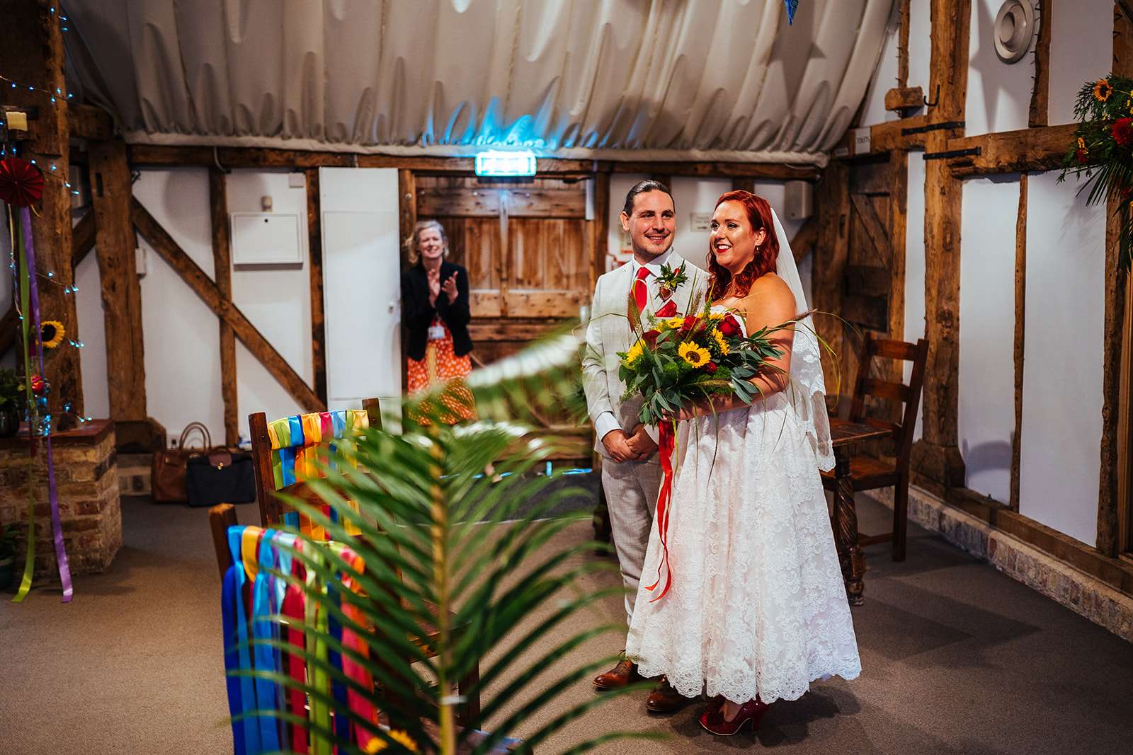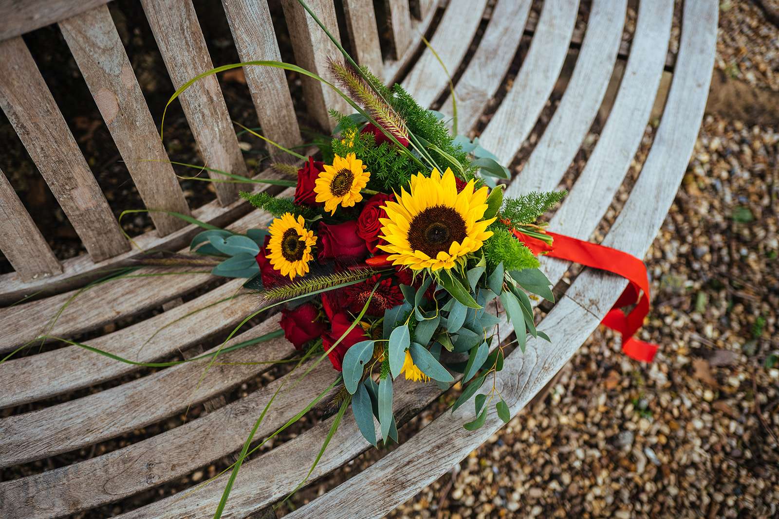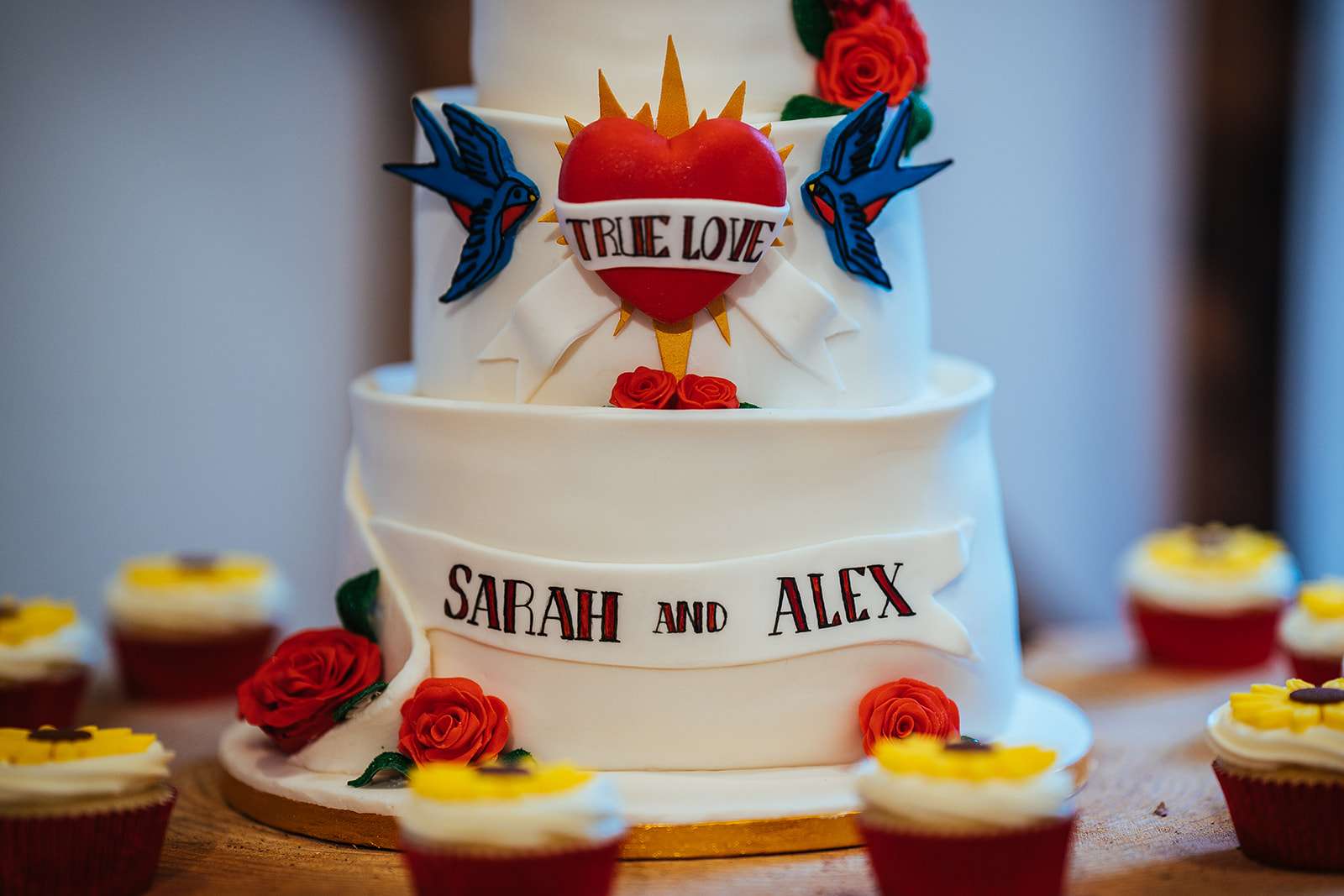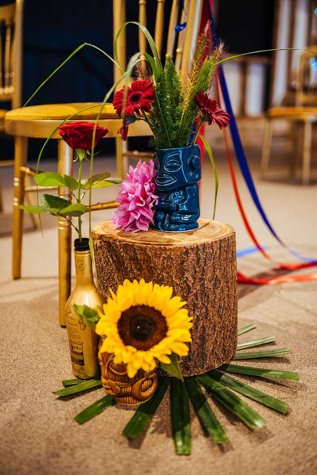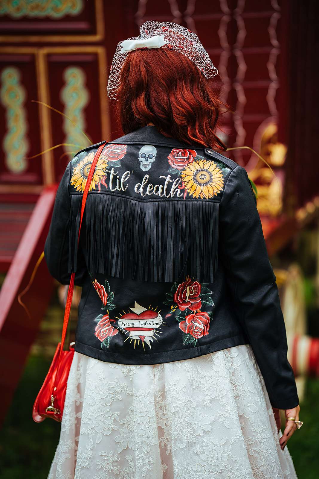 Even their new married name got the custom treatment – they combined their surnames to create a new, double-barrelled one, and then based their custom cocktails on it! ‘The Berry-Valentine’, which was a mix of Prosecco and Chambord and was garnished with a heart shaped strawberry and had a love heart pegged onto it. They had a ’Til Death Do Us Party’ tequila shot with plenty of tabasco and a vegan worm sweet in the bottom, all served in a skull shot glass, of course. The spice theme continued even down to Sarah’s bouquet, which as well as classic red roses and sunflowers as a reminder of her childhood, included chillis as an homage to Alex who grows chilli plants indoors!
