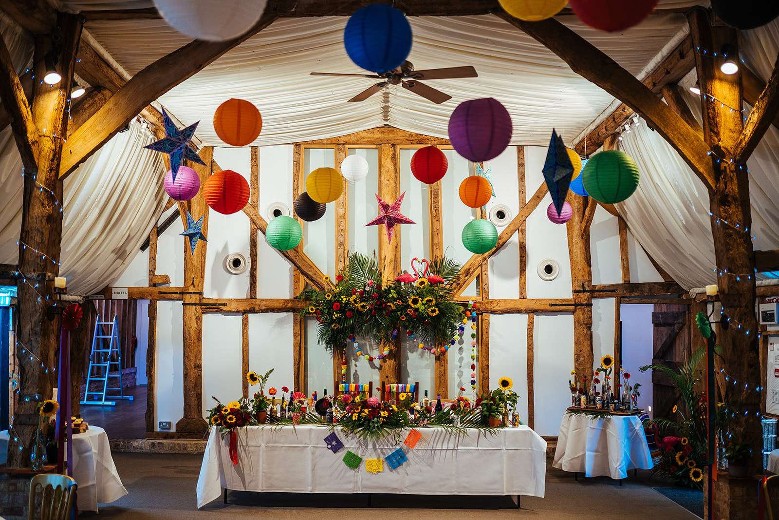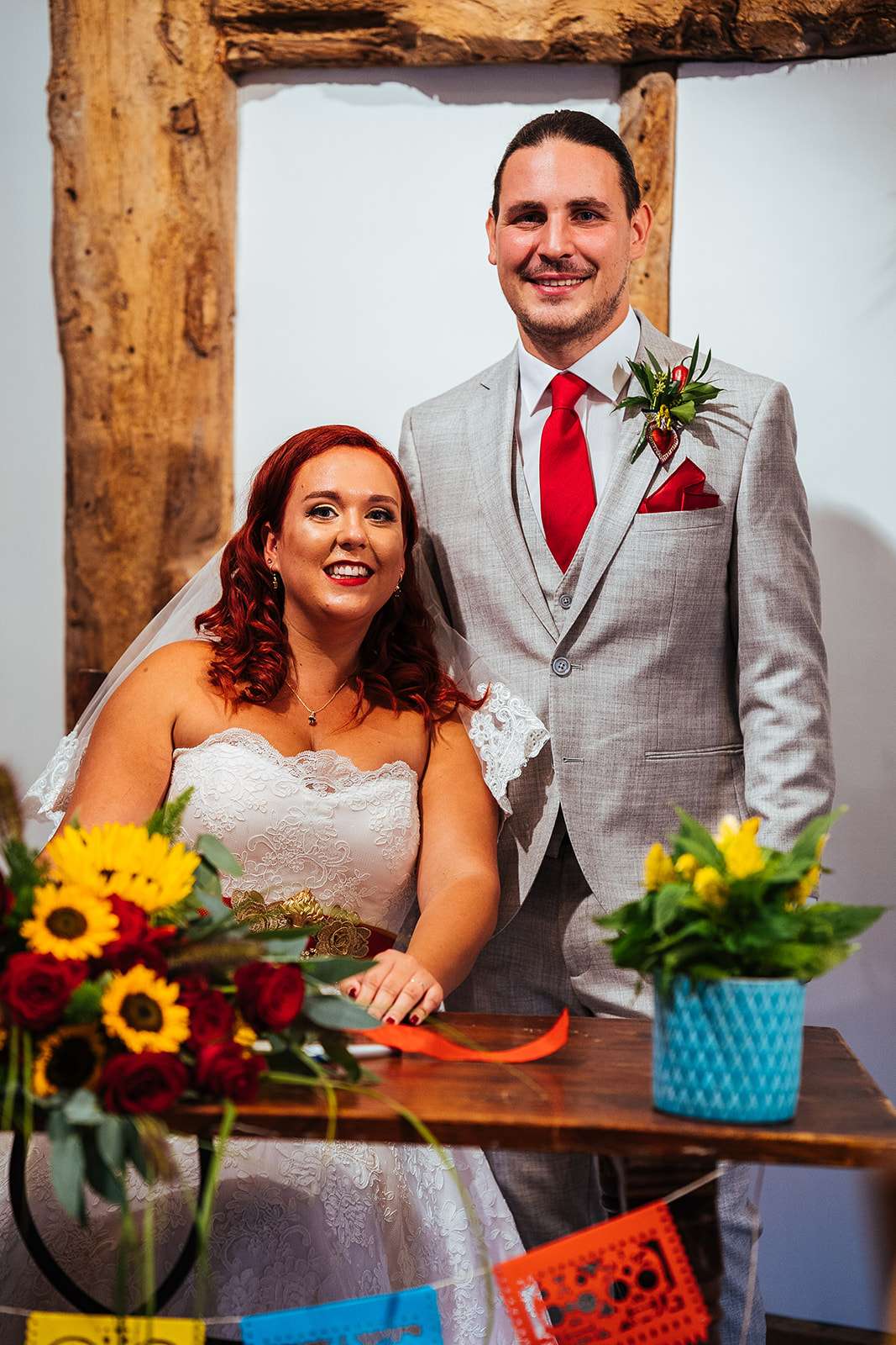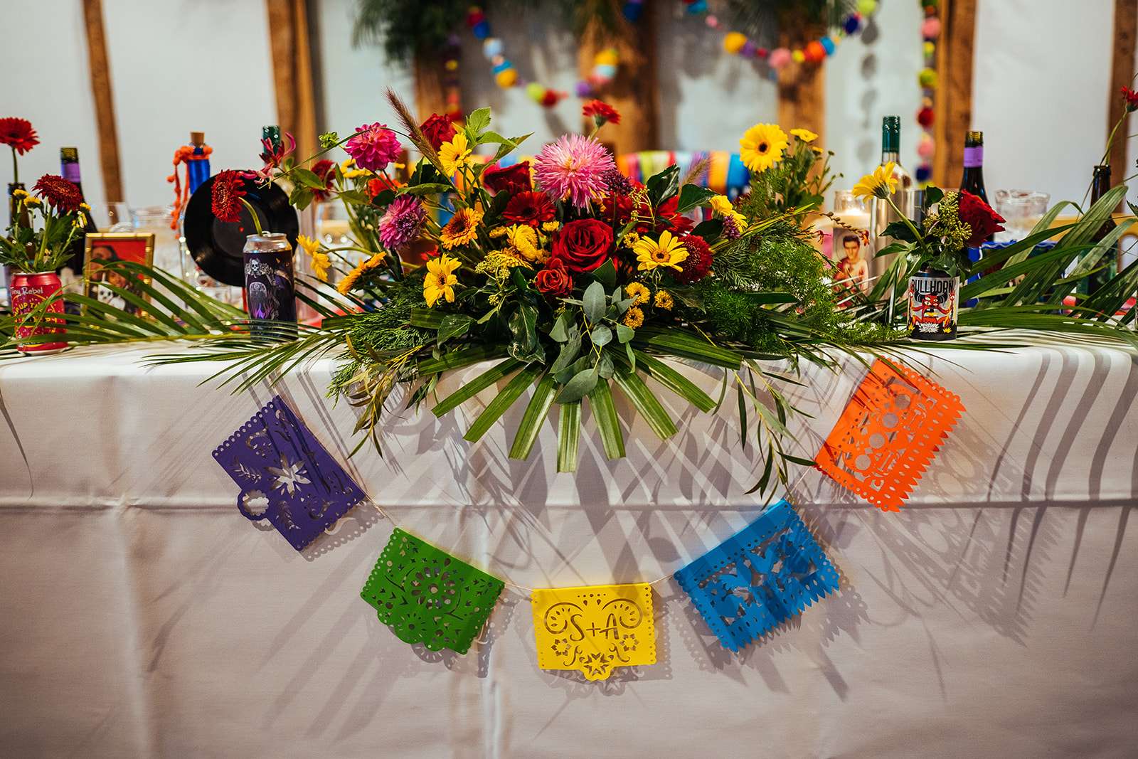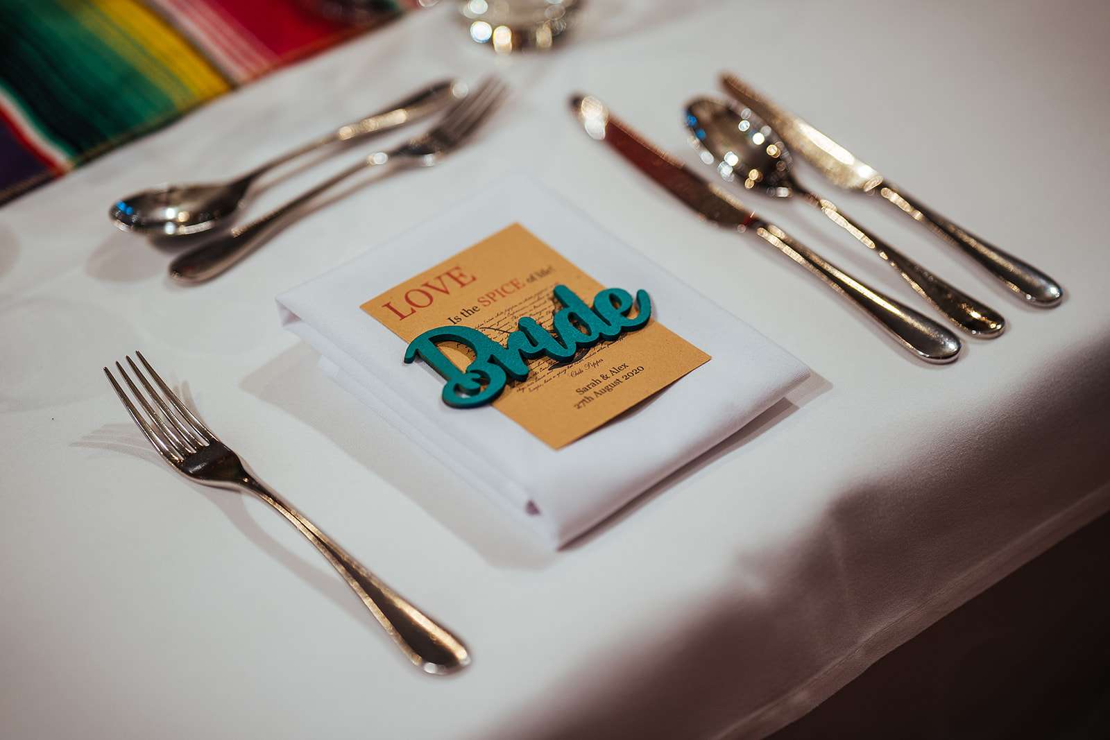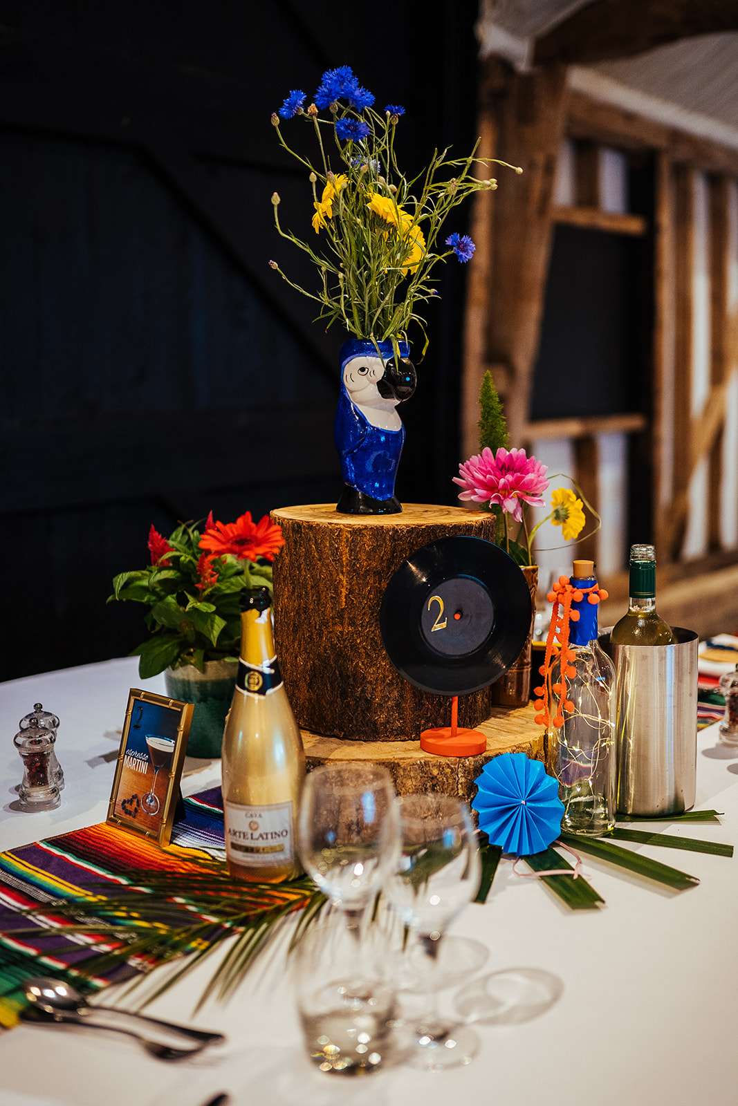 The couple also decided to spend more money on decorations, and really went to town on their theme. Inspired by the colours of Mexico from their art collection picked up on travels there, they also incorporated their love of all things kitsch, rock ’n roll, and a little bit of old school Hollywood glamour! Sarah made the table names and numbers using cheap gold photo frames from B&M that she painted red and painted love-themed lyrics on them.