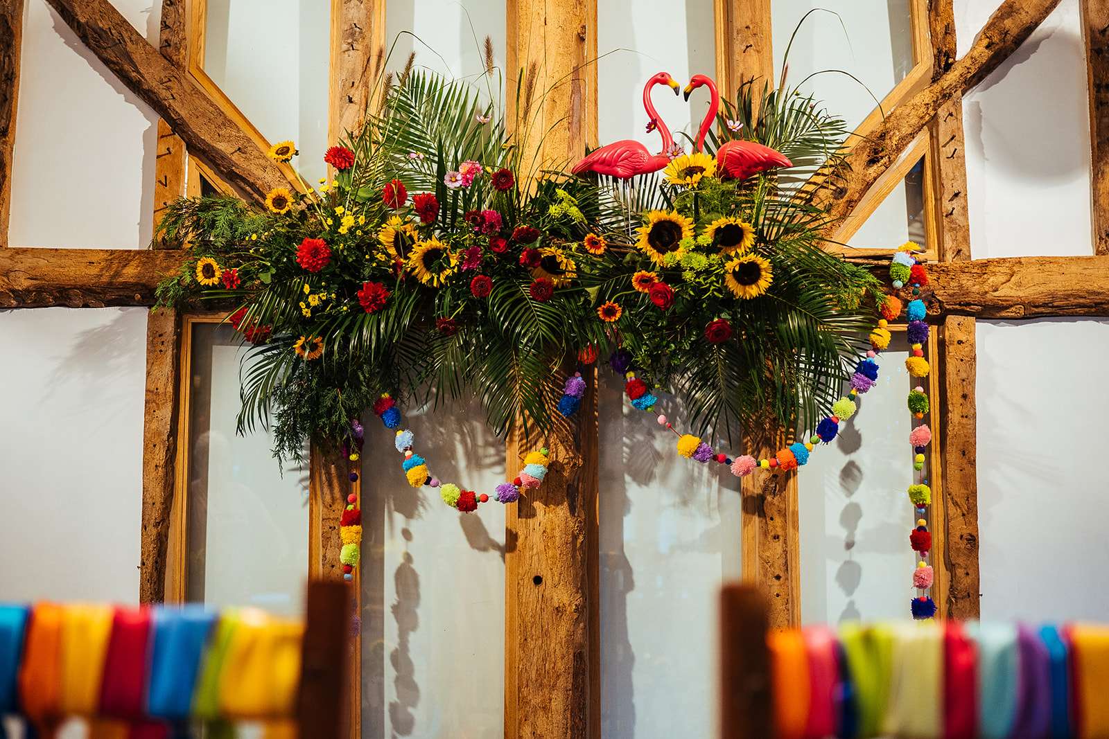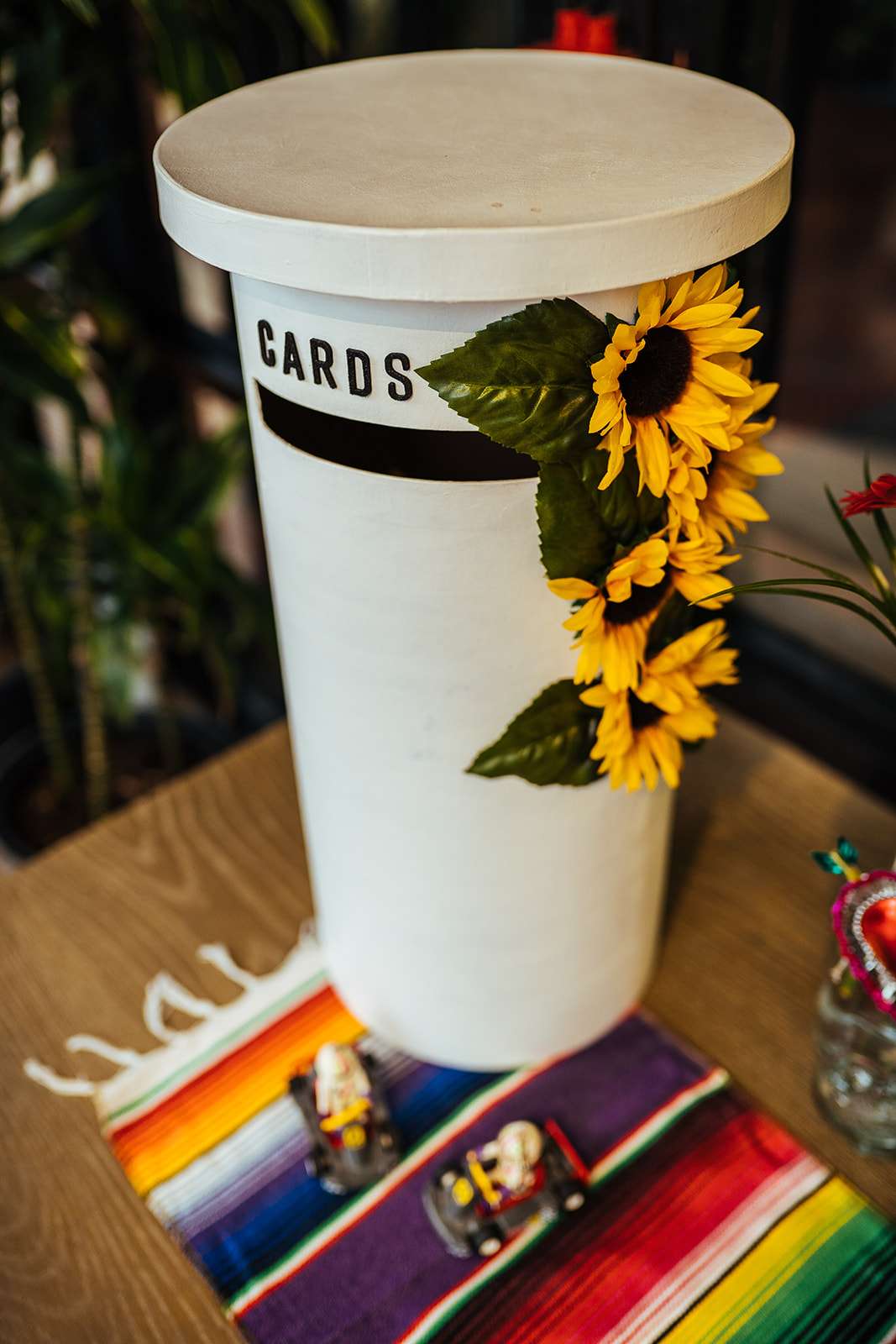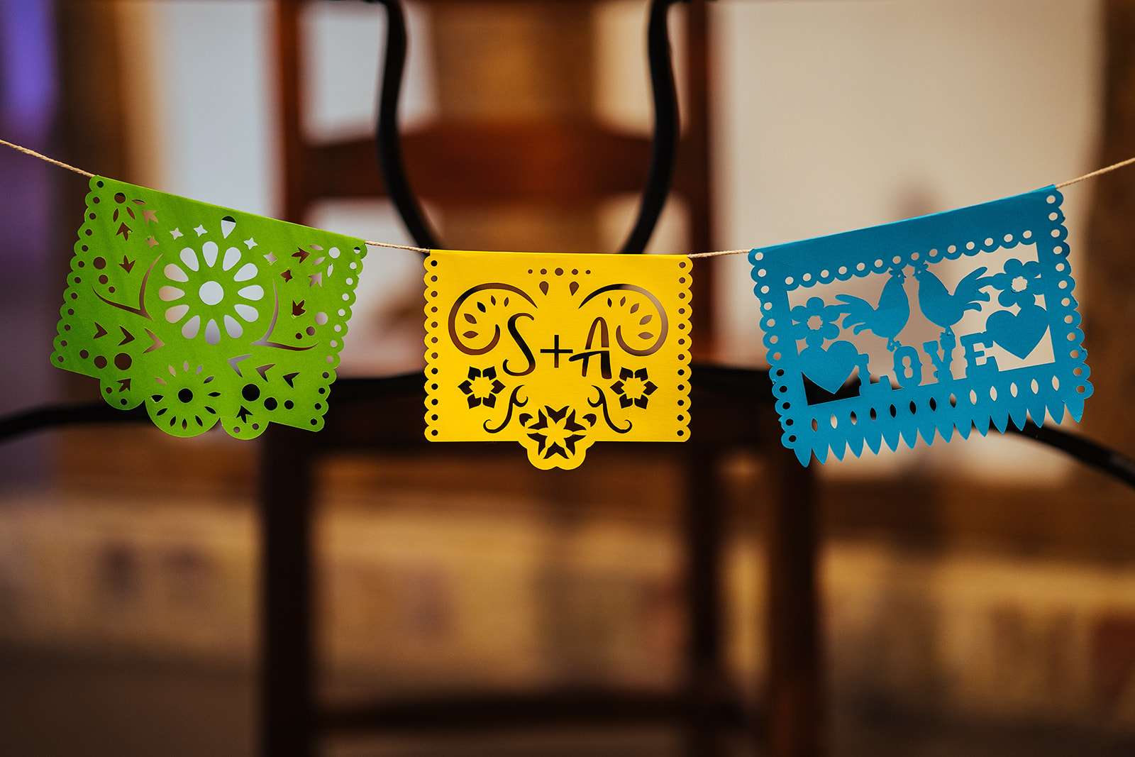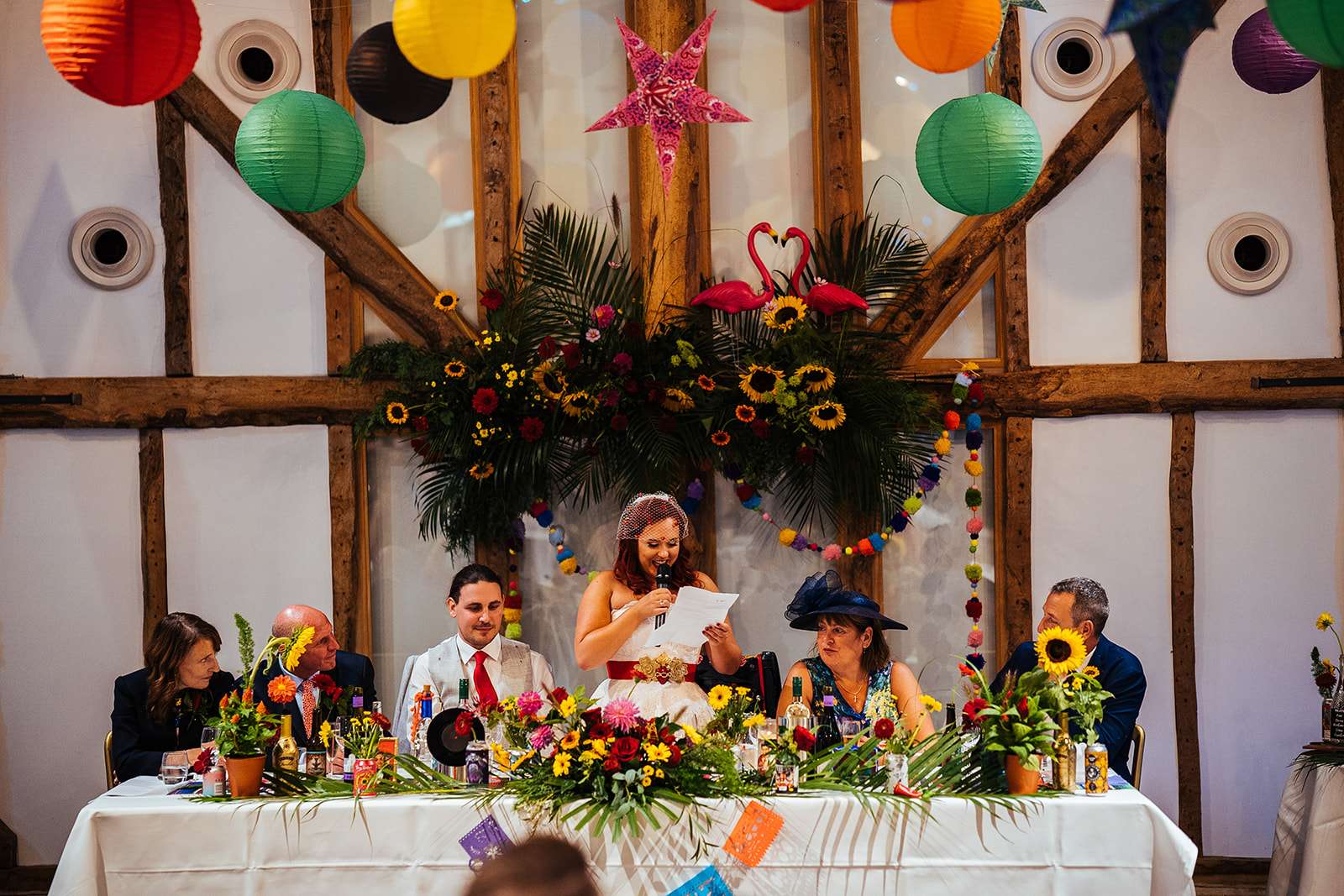 The couple also decided to spend more money on decorations, and really went to town on their theme. Inspired by the colours of Mexico from their art collection picked up on travels there, they also incorporated their love of all things kitsch, rock ’n roll, and a little bit of old school Hollywood glamour! Sarah made the table names and numbers using cheap gold photo frames from B&M that she painted red and painted love-themed lyrics on them.