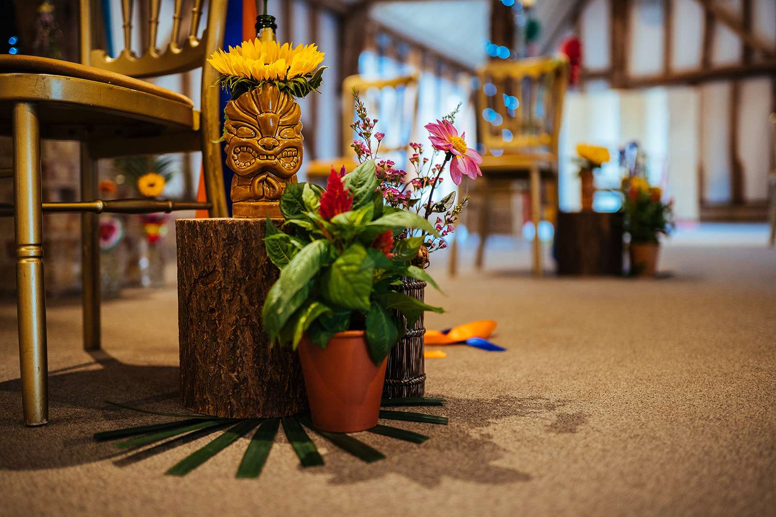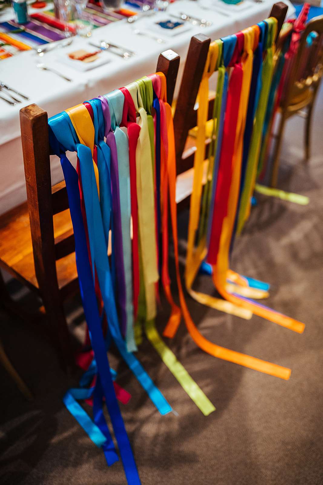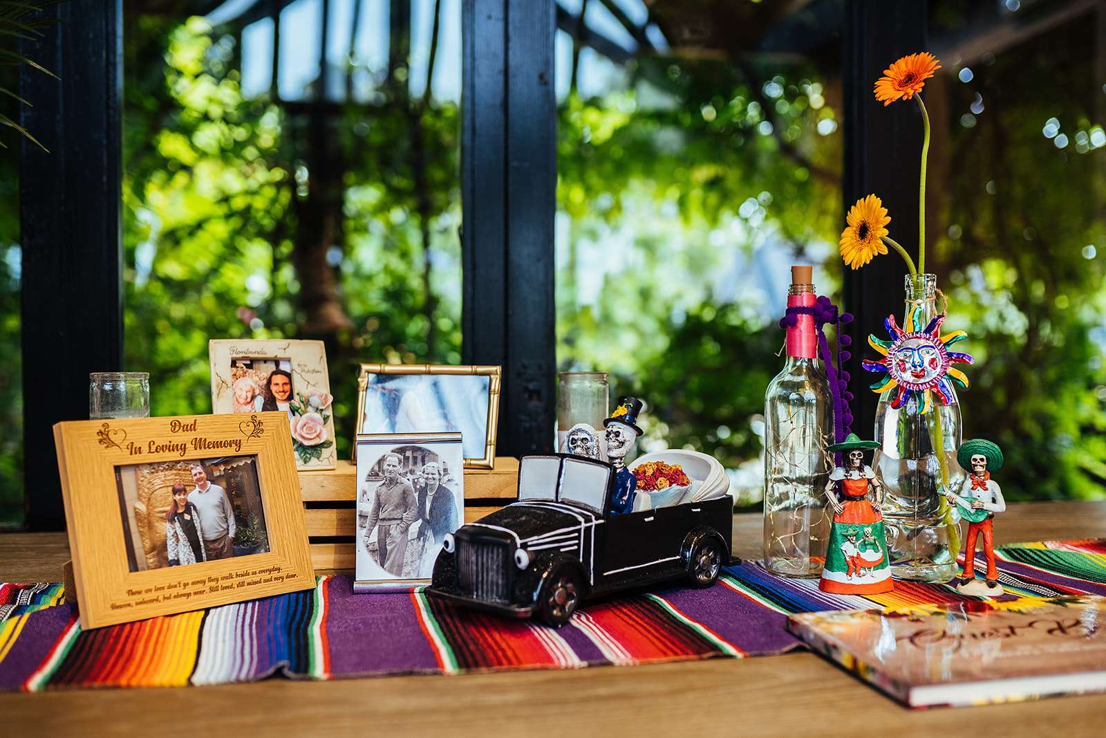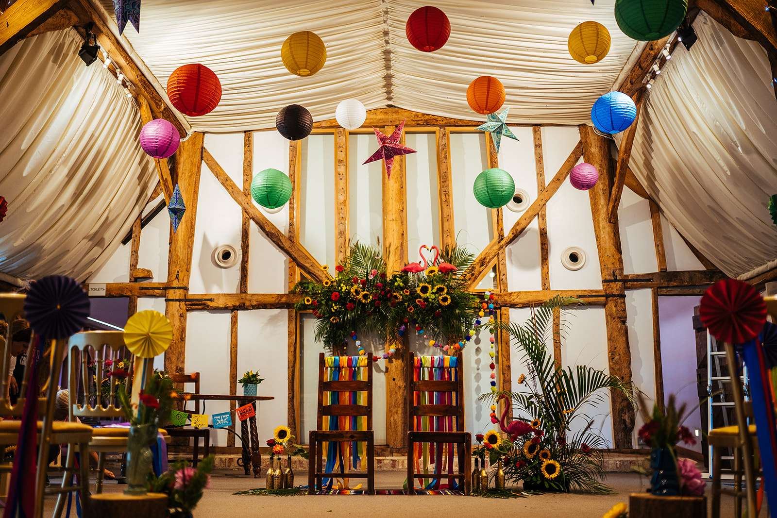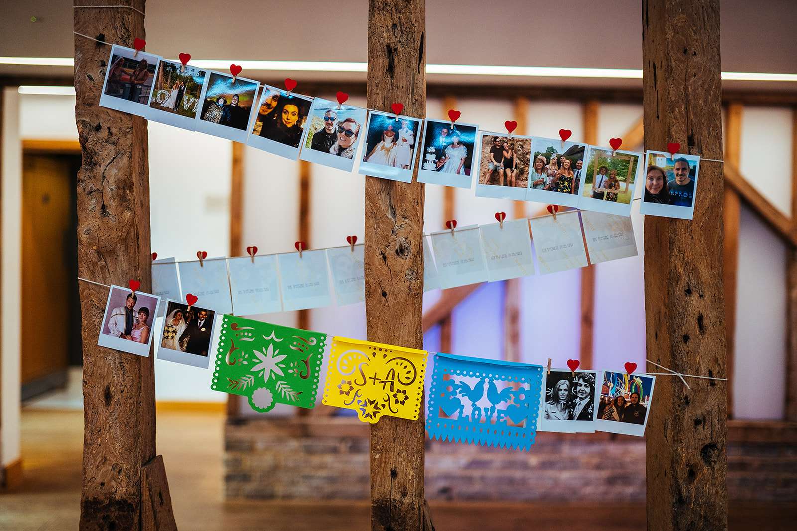 The couple also decided to spend more money on decorations, and really went to town on their theme. Inspired by the colours of Mexico from their art collection picked up on travels there, they also incorporated their love of all things kitsch, rock ’n roll, and a little bit of old school Hollywood glamour! Sarah made the table names and numbers using cheap gold photo frames from B&M that she painted red and painted love-themed lyrics on them.