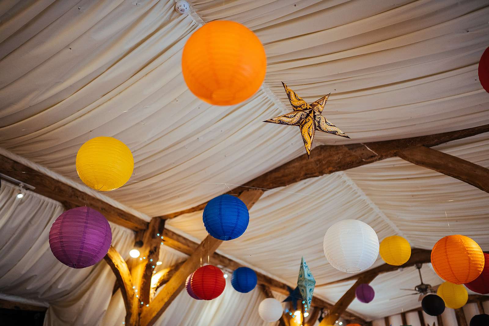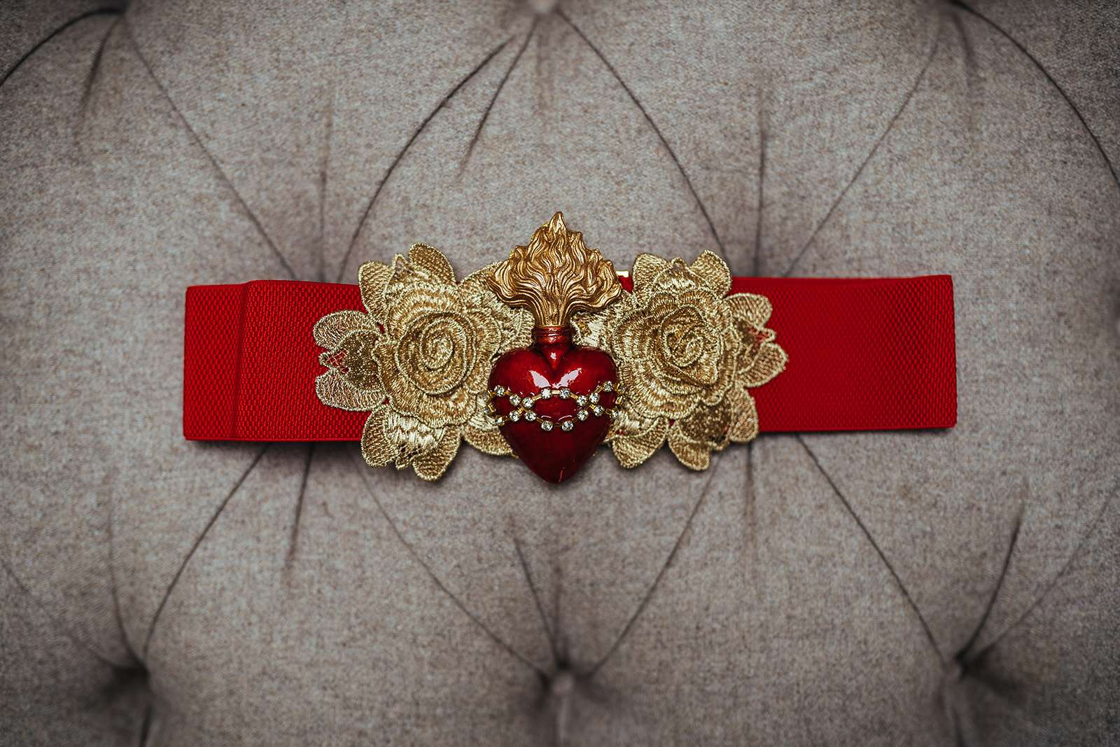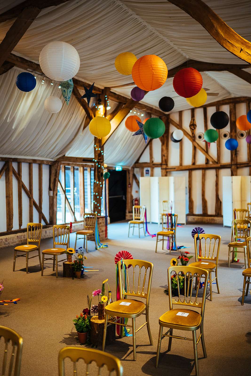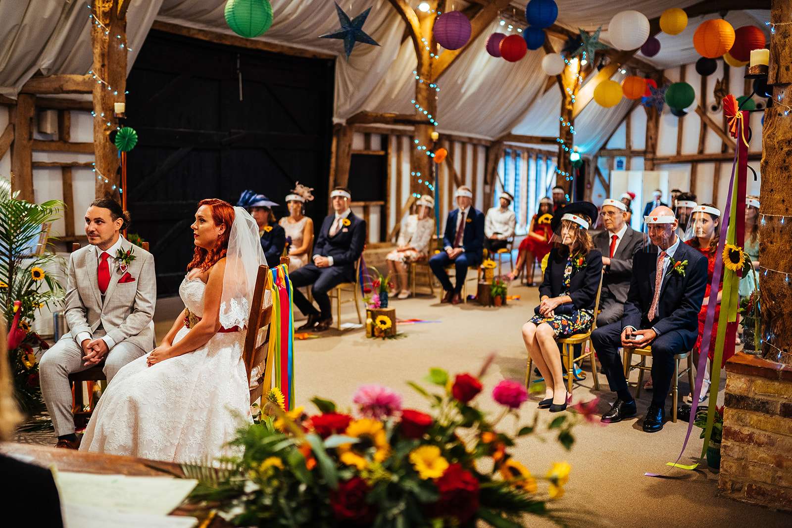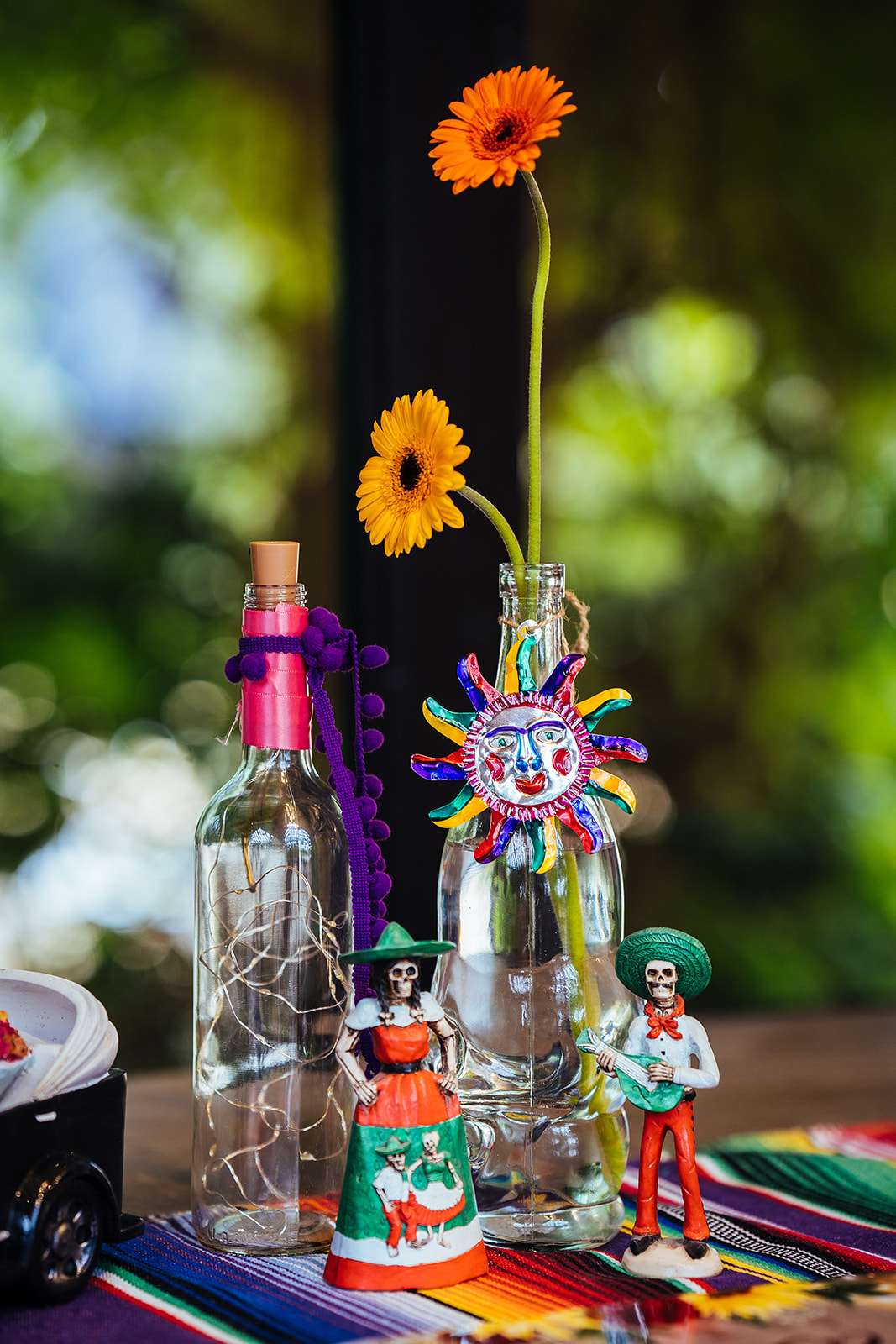 The couple also decided to spend more money on decorations, and really went to town on their theme. Inspired by the colours of Mexico from their art collection picked up on travels there, they also incorporated their love of all things kitsch, rock ’n roll, and a little bit of old school Hollywood glamour! Sarah made the table names and numbers using cheap gold photo frames from B&M that she painted red and painted love-themed lyrics on them.