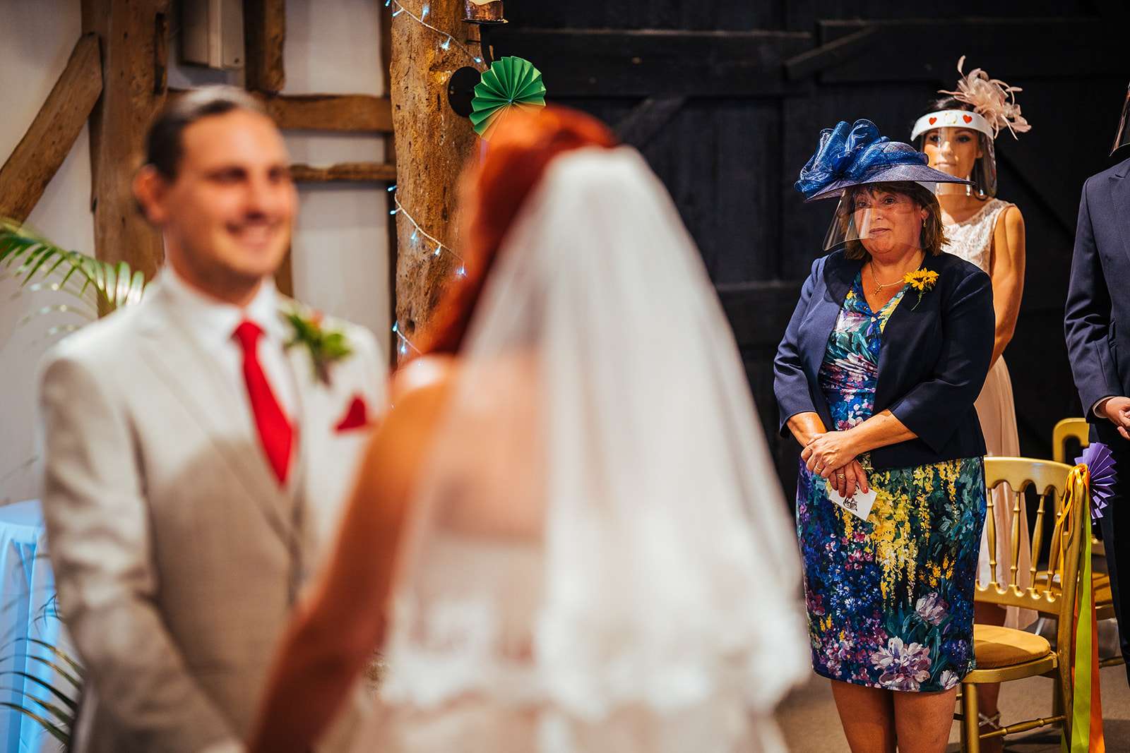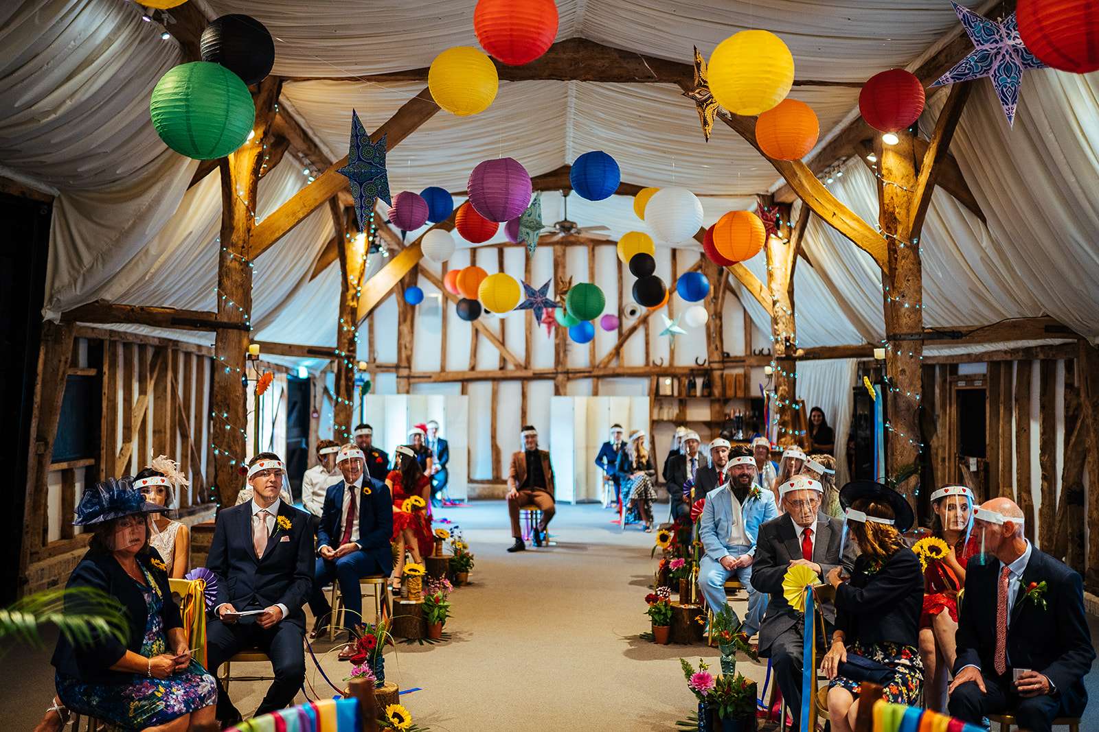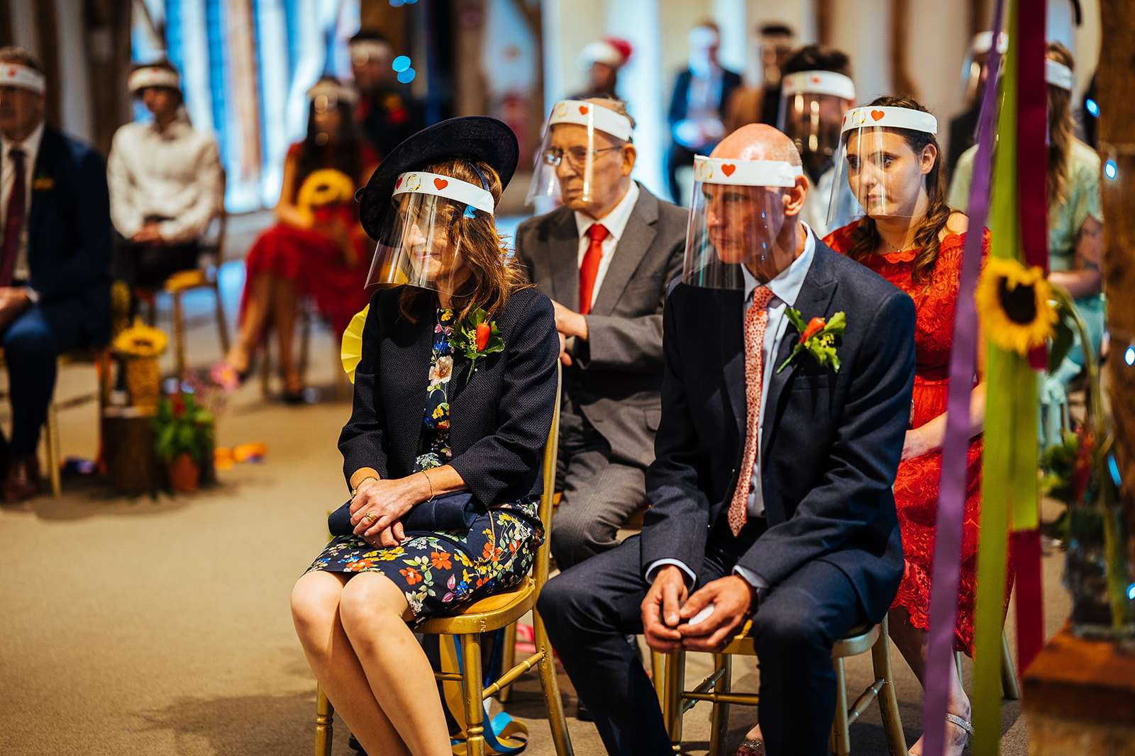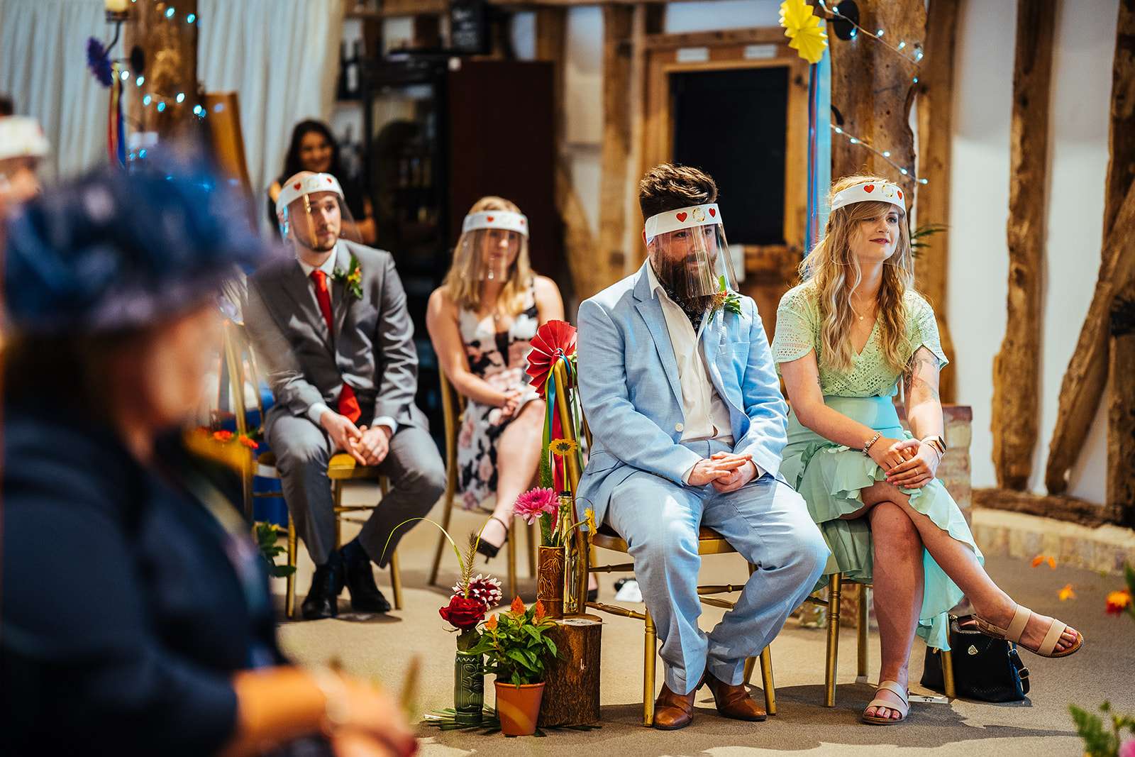 They printed out polaroids of their friends and family’s wedding days and pinned them up around the venue, in order to have their loved ones represented, and included some famous faces in the lineup for a fun touch! “About two weeks before the ceremony, we learnt that what few guests we were allowed would now have to wear face coverings, which after all the changes to socially-distanced seating plans felt like yet another hoop to jump thorough. But again, we made the best of it, and ordered clear visors that I then customised with stickers – it allowed us to see everyone’s faces, and my mum to not have to worry about smudging her lipstick!”