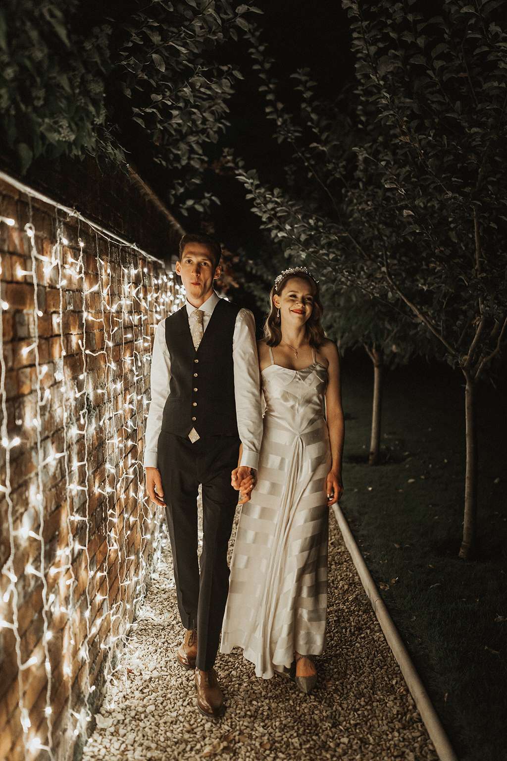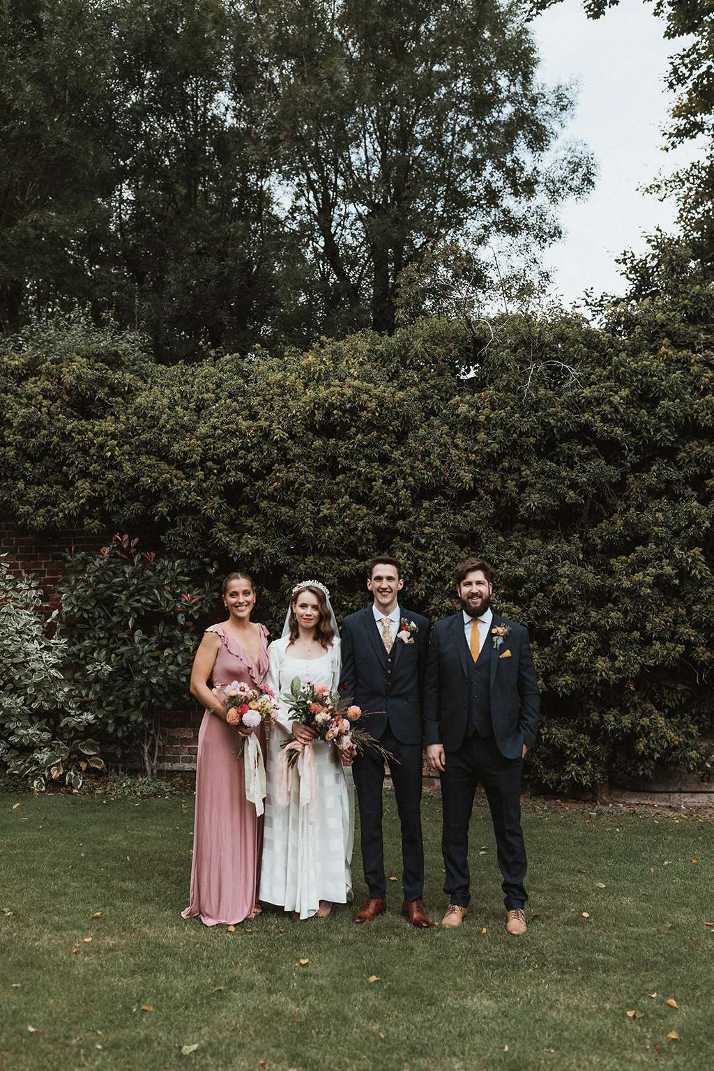 The couple had a hand in so many of the details in their day; The Kings Chapel in Buckinghamshire was the perfect blank canvas for them to get creative and put their own stamp on things. They drew and designed all the illustrations for the tables, table plans and blackboard. They made tassels for the ceiling by repurposing plastic table cloths and tying them onto net and rope. They made personalised velvet banners to hang as the ceremony backdrop and in the reception area. They made dried petal confetti over the year and half of planning from bunches they were given during that time and from flowers from the garden. “I made so much we went down the procession line twice!”