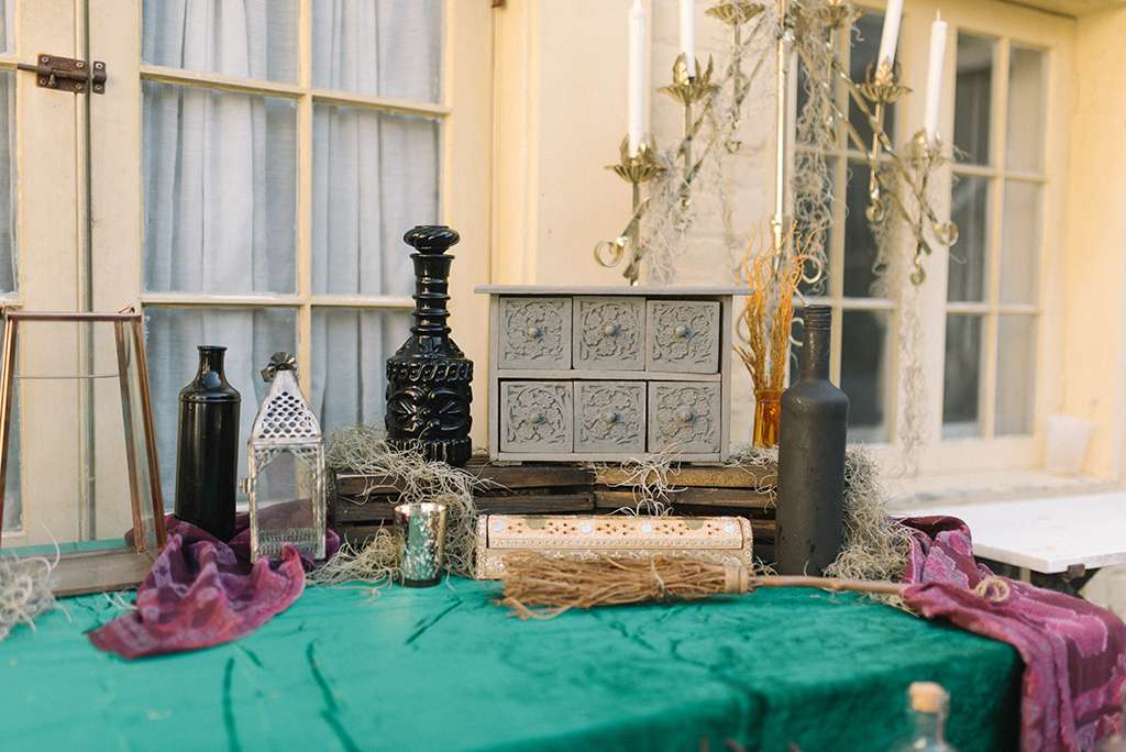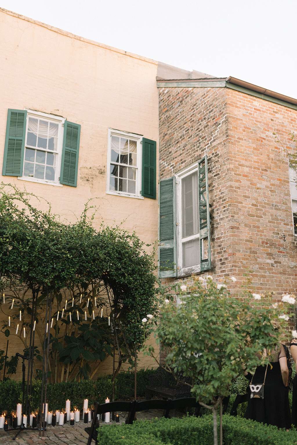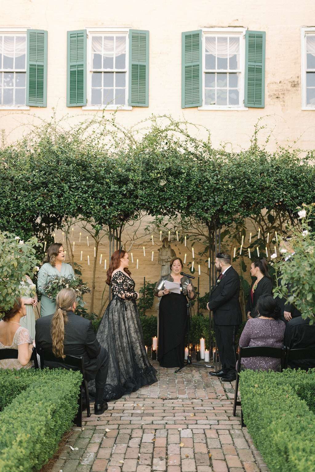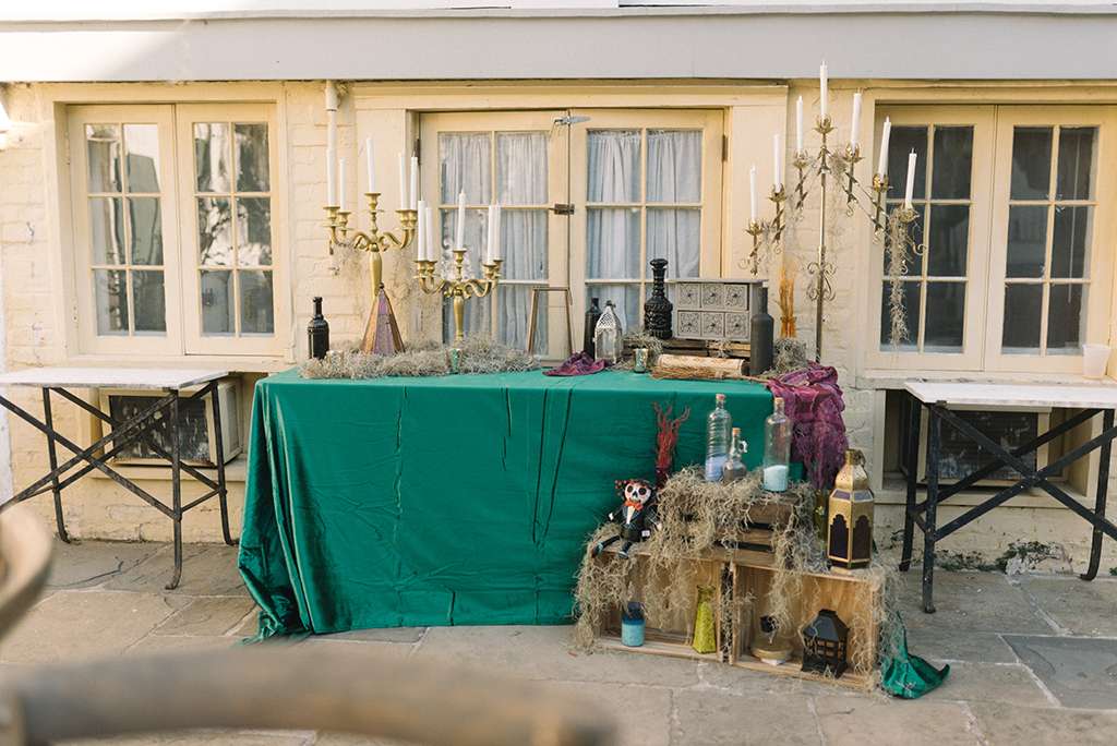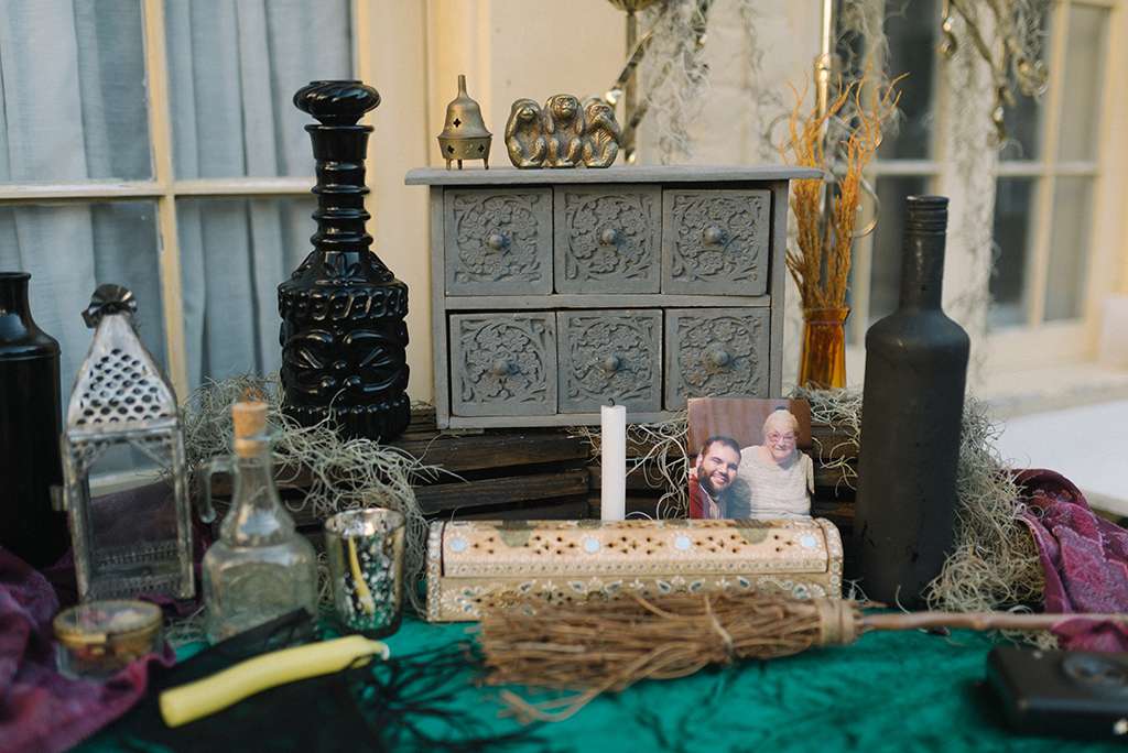 In terms of decor, the couple employed Lonney Jane Productions to design their day. They adorned every surface with candles for a spooky feel. From floating candles in a fountain to a candlelight cobblestone pathway for an aisle, every surface was adorned. For foliage, they went heavy on the ivy, and dressed up their reception with spooky paraphernalia like voodoo dolls, ouija board candles and an apothecary table that housed photographs of loved ones no longer with them. The rest of the decor was left to the ornate and antique surroundings of the venue.