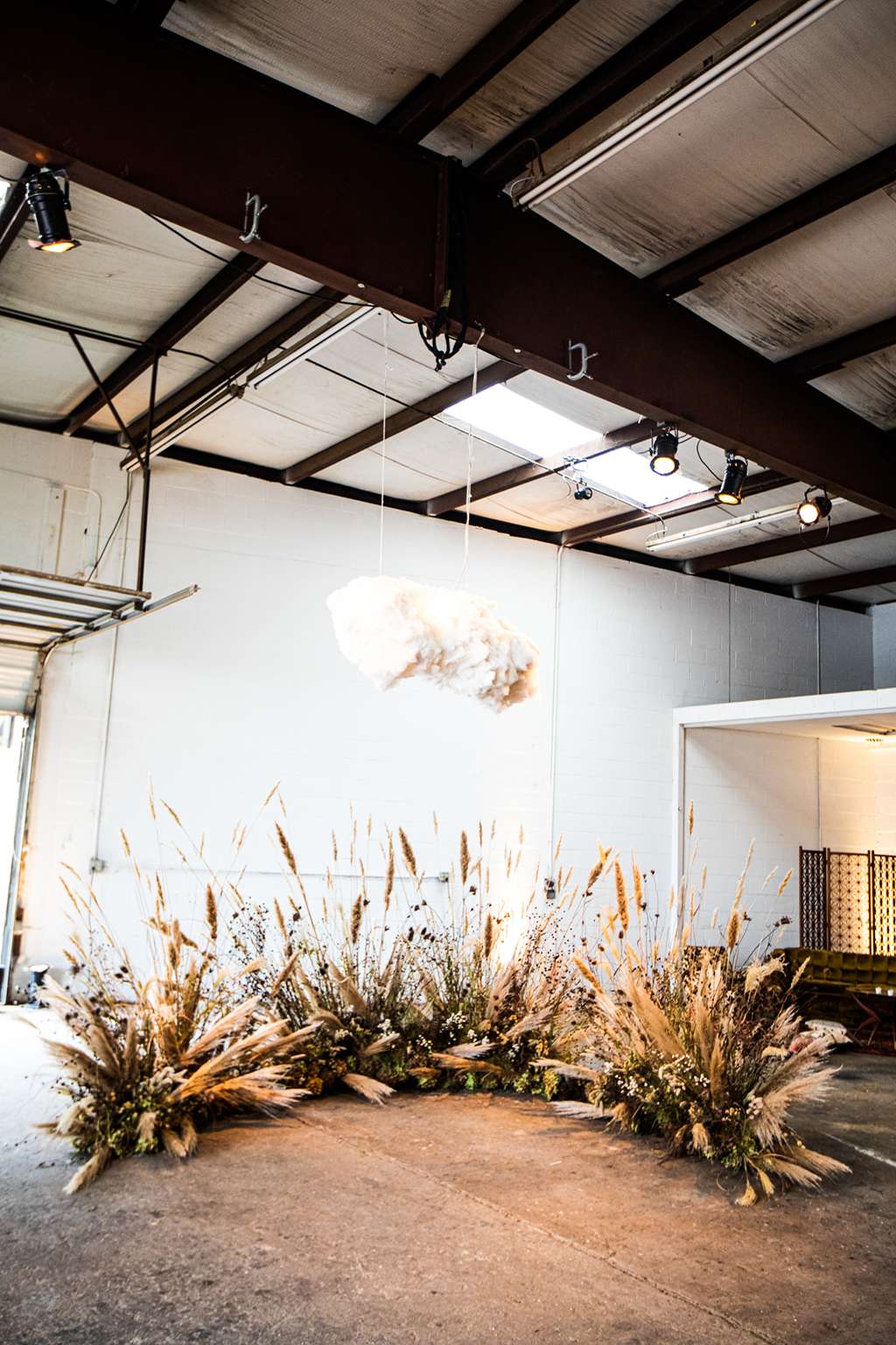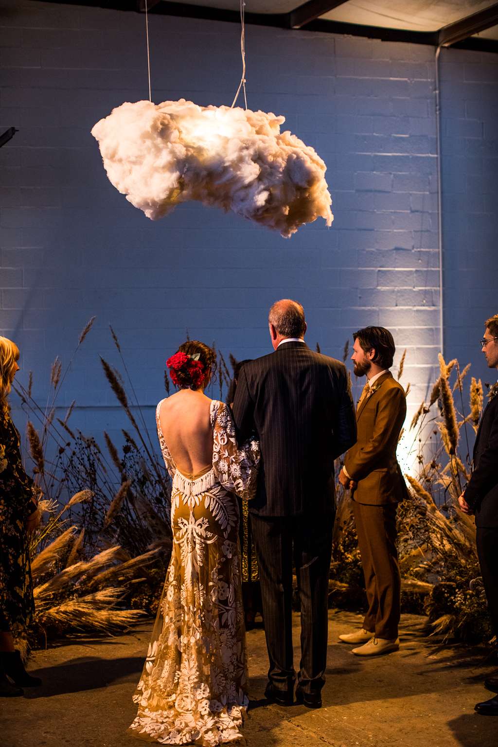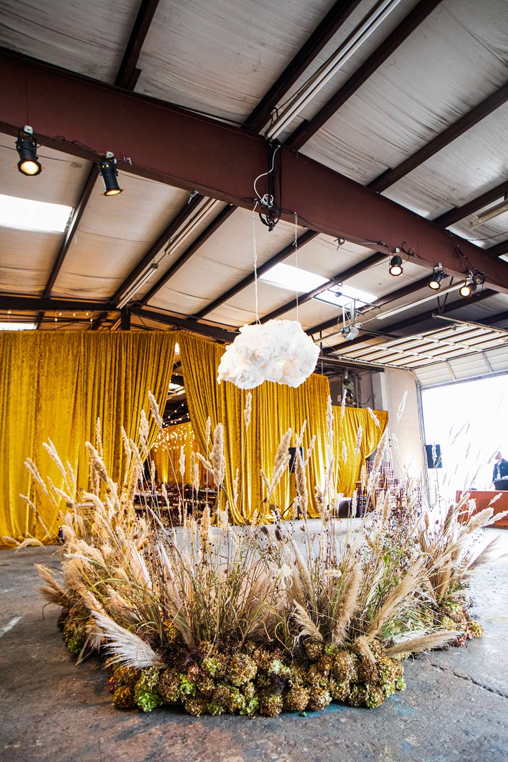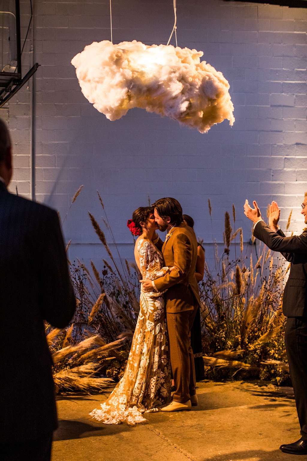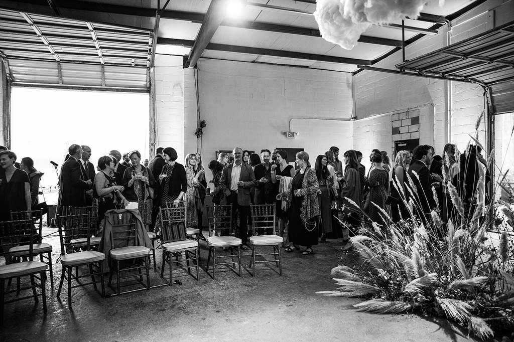 “Kyle is from Nebraska, and on a visit once his father took us to a stretch of prairie his family has preserved,” the bride continued. “It was stark and beautiful and honestly a little bit otherworldly. That visit, the native grasses and the wild flowers…was embedded firmly in my mind ever since. So when it came time to plan the ceremony the idea of creating something like that in an unexpected place was kind of our jumping off point.”