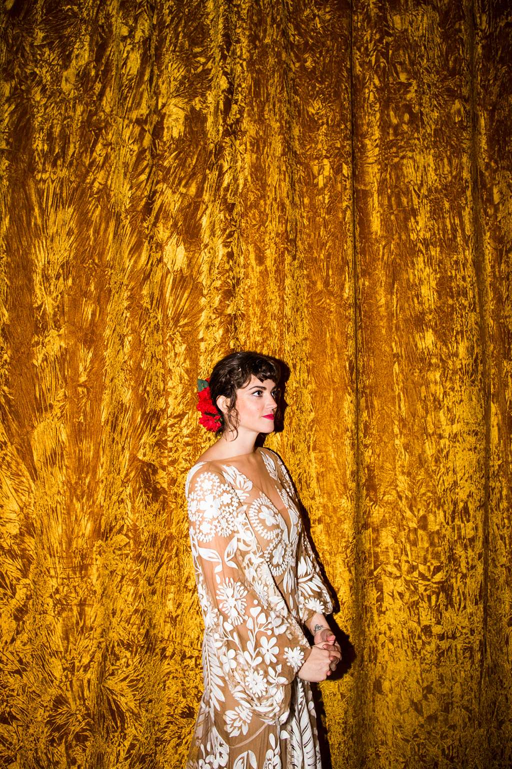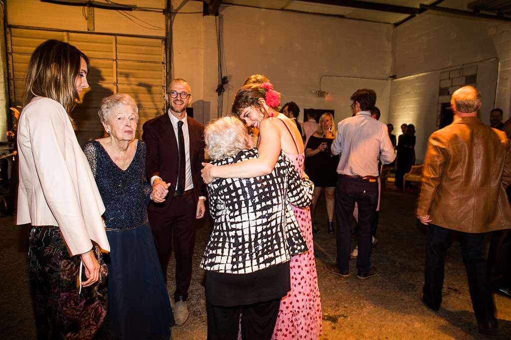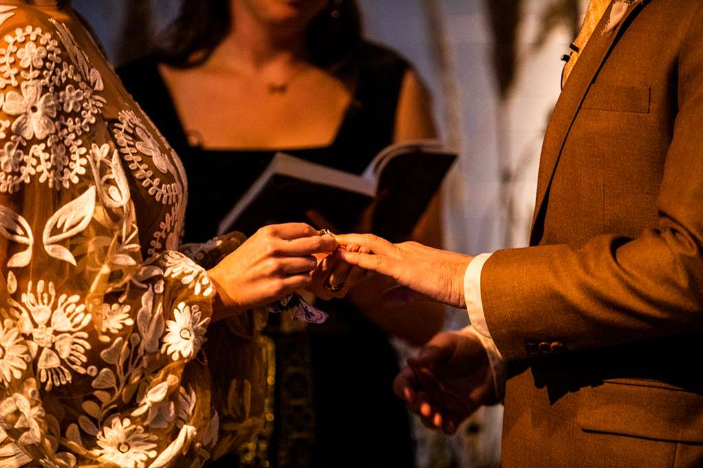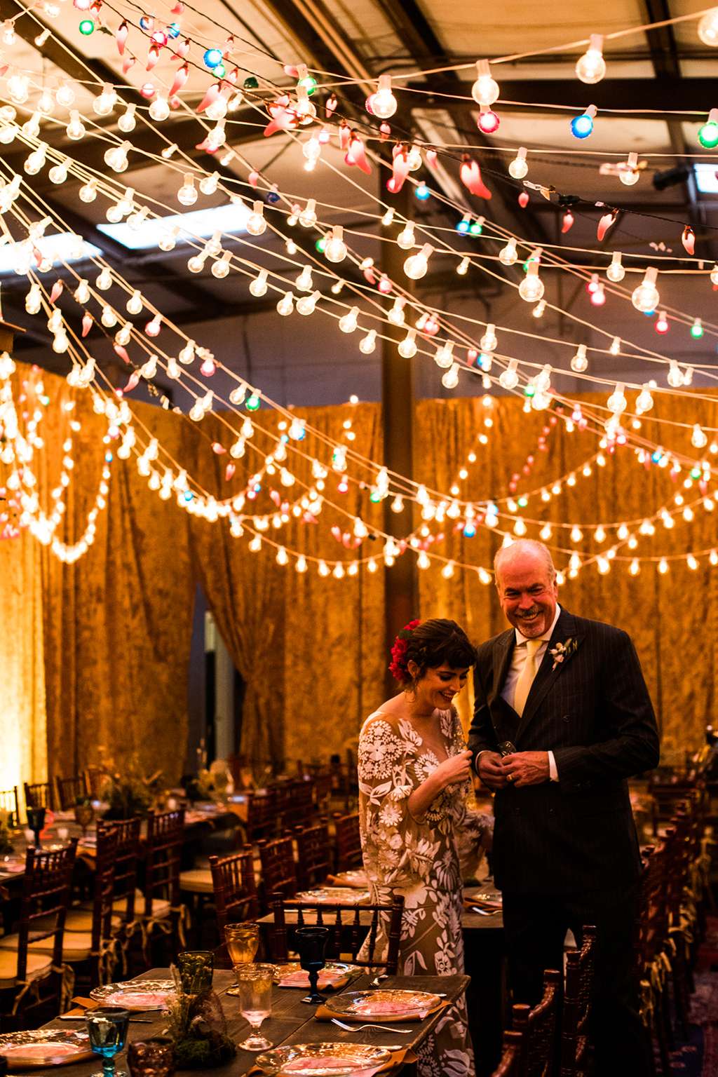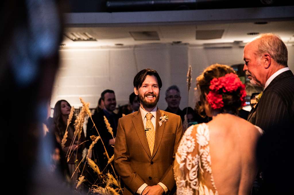 Their ceremony was officiated by the friend who hosted the party that the couple met at, and it ended as their relationship started – with everyone in the room taking a shot of tequila. “My dad had his suit specially made for the day and he had them embroider a private joke of ours on the inner lapel. He showed it to me in the moments before he walked me down the aisle. It made me laugh and calmed my VERY pronounced nerves. I also heard later that Kyle was still scribbling down his vows as people were arriving – no judgement, inspiration strikes when it strikes!”